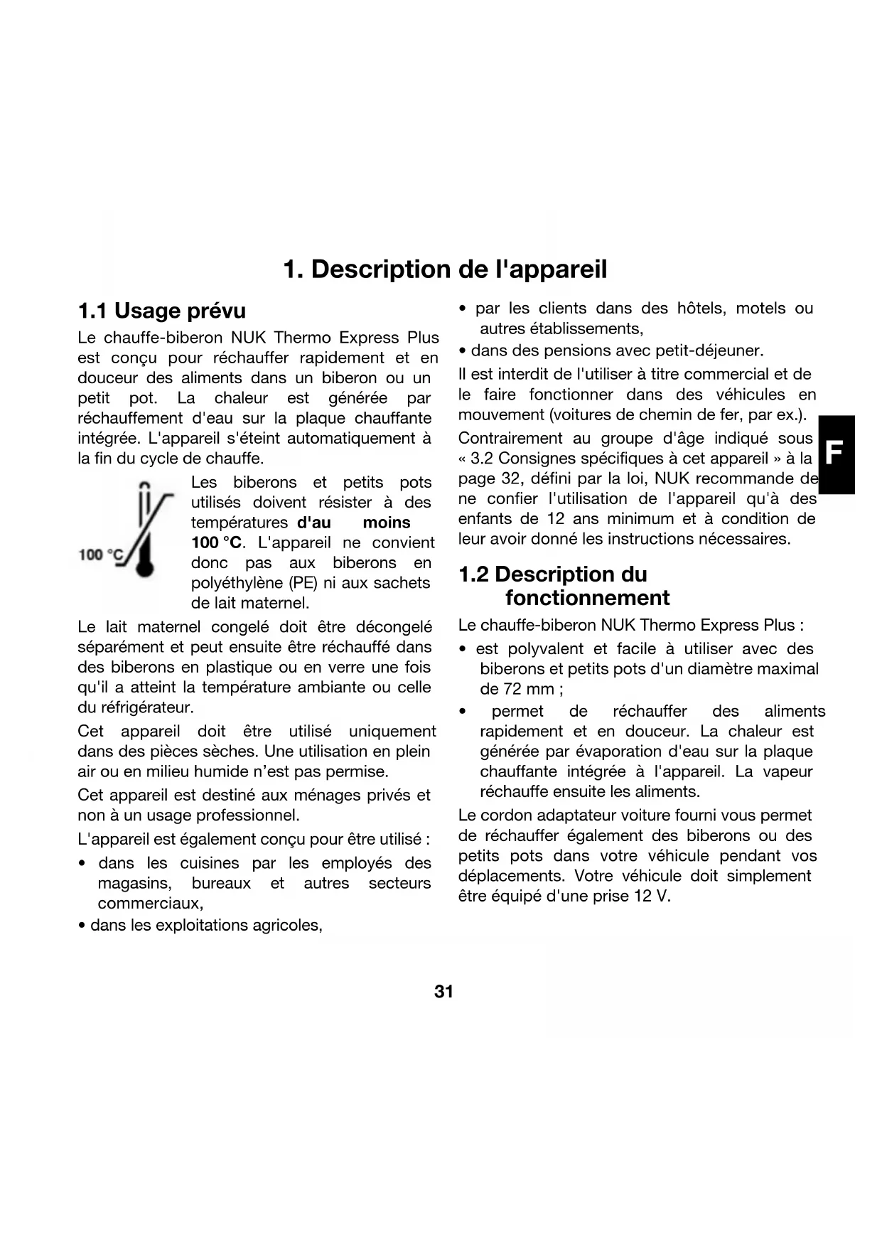 - dans des pensions avec petit-déjeuner. Il est interdit de l'utiliser à titre commercial et de le faire fonctionner dans des véhicules en mouvement (voitures de chemin de fer, par ex.). Contrairement au groupe d'âge indiqué sous « 3.2 Consignes spécifiques à cet appareil » à la page 32, défini par la loi, NUK recommande de ne confier l'utilisation de l'appareil qu'à des enfants de 12 ans minimum et à condition de leur avoir donné les instructions nécessaires.