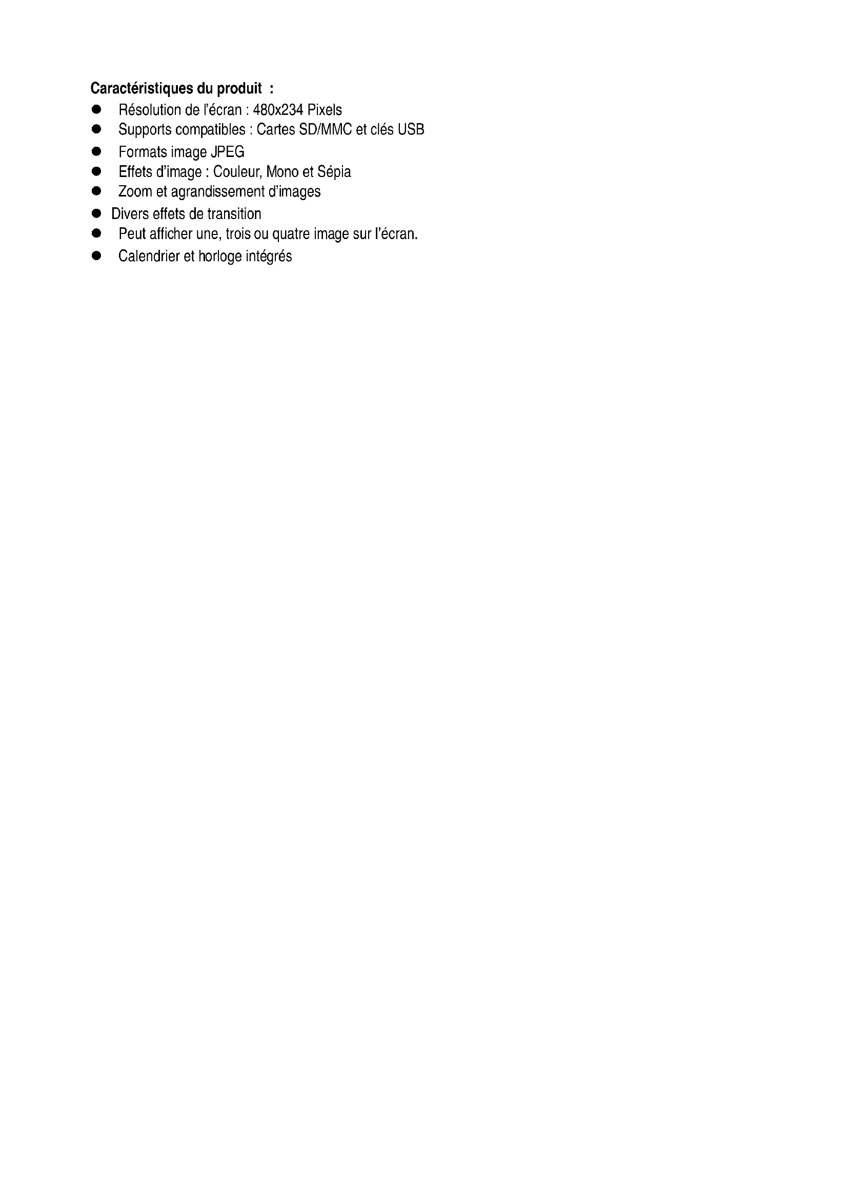 | Caractéristiques techniques | Écran LCD 7 pouces, résolution 800 x 480 pixels, support de formats JPEG, BMP, PNG |