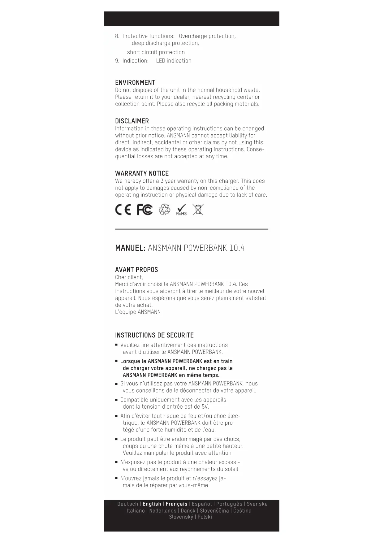 Cher client, Merci d'avoir acheté le ANSMANN POWERBANK 10.4. Ces instructions vous aideront à tirer le meilleur de votre nouvel appareil. Nous espérons que vous serez pleinement satisfait de votre achat. L'équipe ANSMANN