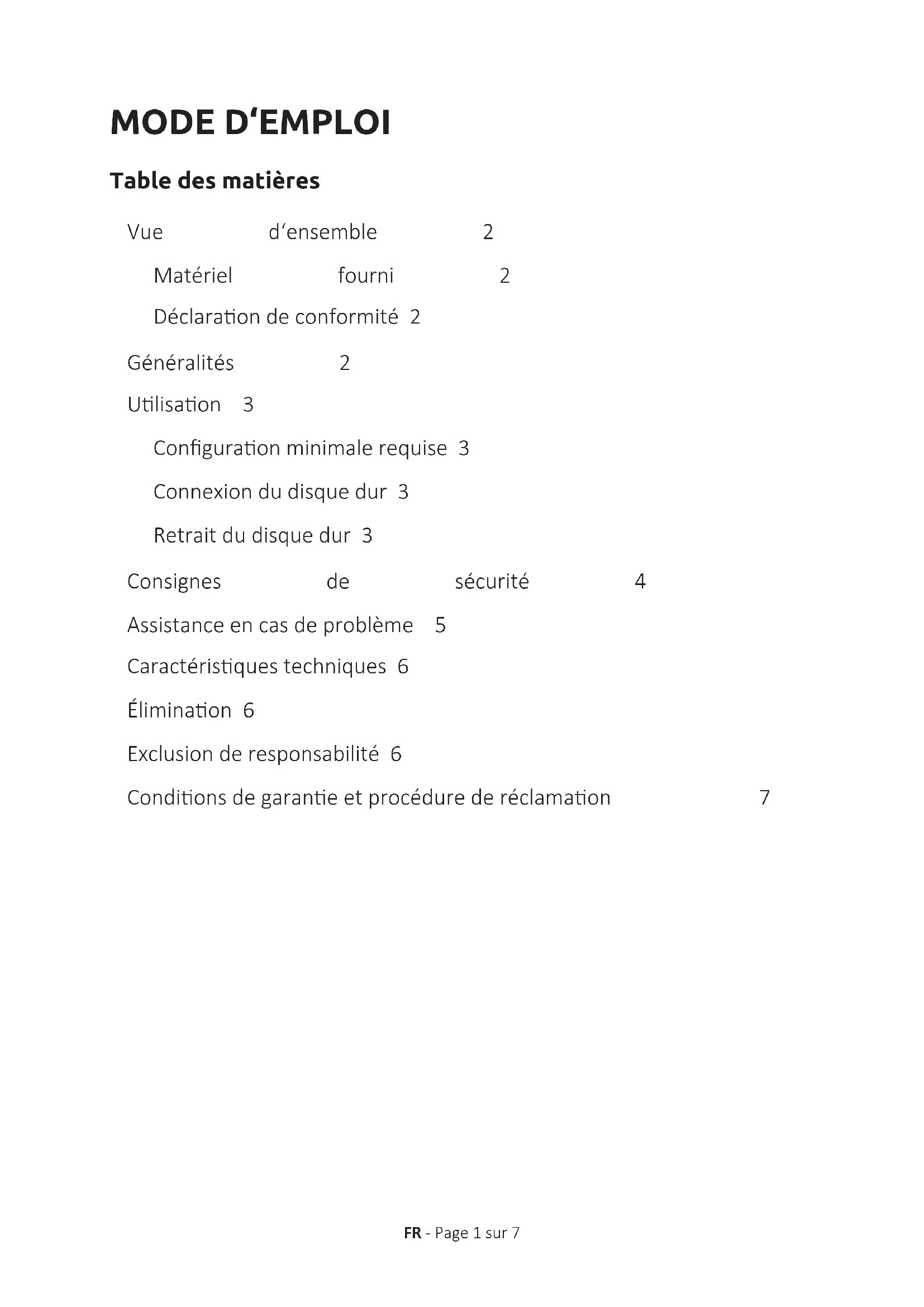 Vériez si le disque ou le câble USB présentent des dommages visibles. Si tel est le cas, veuillez contacter notre service d‘assistance an de le remplacer. N‘ulisez en aucun cas des appareils ou des câbles défectueux. Vériez si la che du câble est correctement branchée. La LED d‘état n‘est pas allumée Vériez dans un premier temps les points sous « La LED d‘état n‘est pas allumée ». Veuillez ensuite vérier tous les ports USB de votre appareil (notamment à l‘arrière dans le cas des PC) ; il se peut que le disque dur ne bénécie pas d‘une alimentaon électrique susante sur le port USB ulisé. Veuillez uliser uniquement le câble fourni et n‘ulisez surtout pas de rallonge. Si vous ulisez un concentrateur USB entre le disque dur et l‘ordinateur, celui-ci devra disposer de sa propre alimentaon électrique. Si le disque dur n‘est détecté sur aucun des ports USB de votre appareil, veuillez essayer s‘il fonconne sur un autre appareil an d‘exclure un éventuel défaut. Vériez le gesonnaire des disques ; il se peut qu‘il faille seulement aecter une lere de lecteur (pour obtenir des informaons plus détaillées à ce sujet, consultez le chier d‘aide de votre version de Windows). Si vous avez par exemple ulisé le disque dur sur un téléviseur auparavant, il se peut que vous deviez d‘abord formater le disque dur pour pouvoir l‘uliser à nouveau sur un ordinateur (pour obtenir des informaons plus détaillées à ce sujet, consultez le mode d‘emploi de l‘appareil ulisé auparavant et/ou le chier d‘aide du fournisseur de votre système d‘exploitaon. Le disque dur n‘est pas détecté Tenez l‘appareil à distance de toute humidité et évitez la poussière, la chaleur et l‘exposion directe à la lumière du soleil. N‘ouvrez pas le boîer de l‘appareil et ne désassemblez pas l‘appareil. N‘essayez pas de le réparer par vos propres moyens. La garane deviendrait caduque dans ces cas. Évitez d‘uliser l‘appareil en présence de champs magnéques forts tels que ceux rencontrés à proximité immédiate d‘enceintes an d‘éviter toute perte de données ou autre dysfonconnement. Lors de l‘ulisaon, veillez à ce que disque dur soit posé sur un support à l‘abri des secousses an d‘éviter les dommages.FR - Page 6 sur 7 Éliminaon d‘appareils électriques usagés: Les appareils portant ce symbole sont soumis à la direcve européenne 2012/19/CE. Tous les appareils électriques et appareils électriques usagés doivent être éliminés séparément des ordures ménagères via les points de collecte prévus par l‘État. Une éliminaon des appareils électriques usagés dans les règles évite les dommages écologiques. Emballage: Les emballages sont des maères premières. Le matériel d‘emballage de ce produit est adapté au recyclage et peut être réulisé. Veuillez observer les règlementaons locales en vigueur en maère de recyclage lors de l‘élimina- on de tout matériel. ÉLIMINATION
