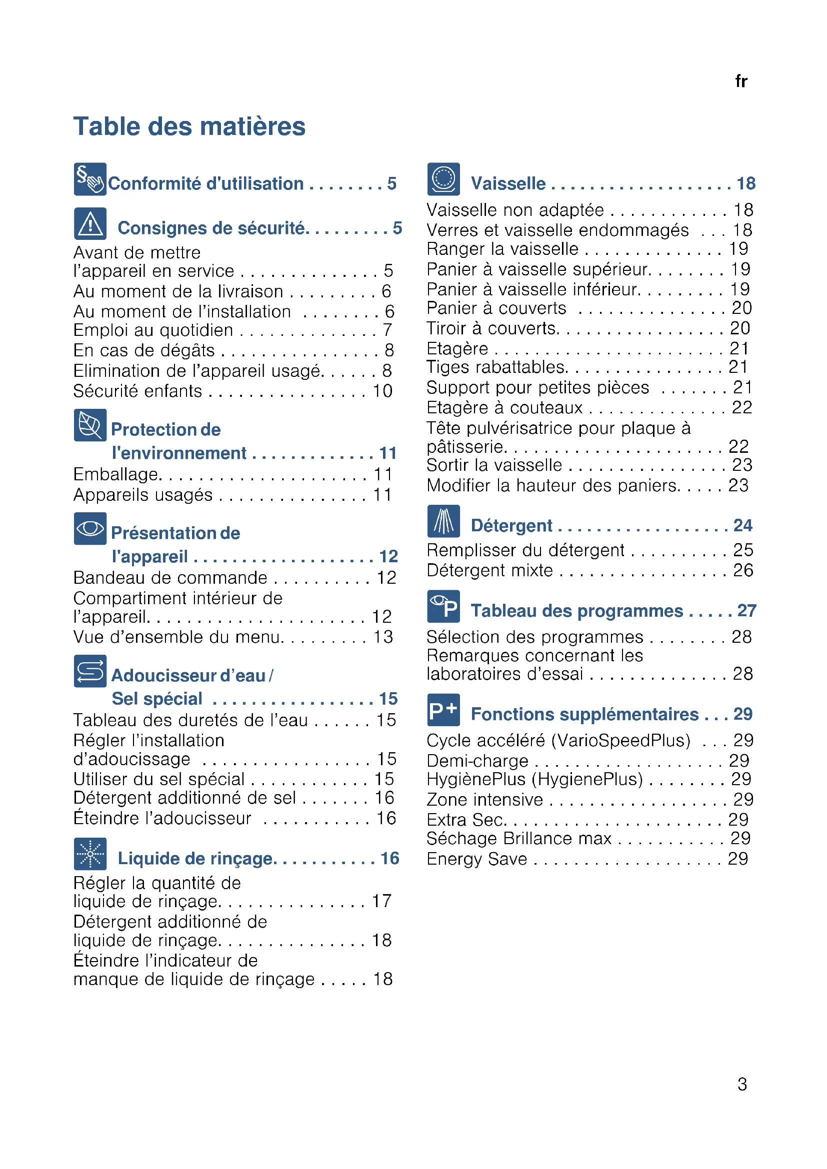 - Présentation de l'appareil . . . . . . . . . . . . . . . . . . . 12 Bandeau de commande . . . . . . . . . . 12 Compartiment intérieur de l’appareil. . . . . . . . . . . . . . . . . . . . . . 12 Vue d’ensemble du menu. . . . . . . . . 13 + Adoucisseur d’eau / Sel spécial . . . . . . . . . . . . . . . . . 15 Tableau des duretés de l’eau . . . . . . 15 Régler l’installation d’adoucissage . . . . . . . . . . . . . . . . . 15 Utiliser du sel spécial . . . . . . . . . . . . 15 Détergent additionné de sel . . . . . . . 16 Éteindre l’adoucisseur . . . . . . . . . . . 16 , Liquide de rinçage. . . . . . . . . . . 16 Régler la quantité de liquide de rinçage. . . . . . . . . . . . . . . 17 Détergent additionné de liquide de rinçage. . . . . . . . . . . . . . . 18 Éteindre l’indicateur de manque de liquide de rinçage . . . . . 18 - Vaisselle . . . . . . . . . . . . . . . . . . . 18 Vaisselle non adaptée . . . . . . . . . . . . 18 Verres et vaisselle endommagés . . . 18 Ranger la vaisselle . . . . . . . . . . . . . . 19 Panier à vaisselle supérieur. . . . . . . . 19 Panier à vaisselle inférieur. . . . . . . . . 19 Panier à couverts . . . . . . . . . . . . . . . 20 Tiroir à couverts. . . . . . . . . . . . . . . . . 20 Etagère . . . . . . . . . . . . . . . . . . . . . . . 21 Tiges rabattables. . . . . . . . . . . . . . . . 21 Support pour petites pièces . . . . . . . 21 Etagère à couteaux . . . . . . . . . . . . . . 22 Tête pulvérisatrice pour plaque à pâtisserie. . . . . . . . . . . . . . . . . . . . . . 22 Sortir la vaisselle . . . . . . . . . . . . . . . . 23 Modifier la hauteur des paniers. . . . . 23 . Détergent . . . . . . . . . . . . . . . . . . 24 Remplisser du détergent . . . . . . . . . . 25 Détergent mixte . . . . . . . . . . . . . . . . . 26 / Tableau des programmes . . . . . 27 Sélection des programmes . . . . . . . . 28 Remarques concernant les laboratoires d’essai . . . . . . . . . . . . . . 28 0 Fonctions supplémentaires . . . 29 Cycle accéléré (VarioSpeedPlus) . . . 29 Demi-charge . . . . . . . . . . . . . . . . . . . 29 HygiènePlus (HygienePlus) . . . . . . . . 29 Zone intensive . . . . . . . . . . . . . . . . . . 29 Extra Sec. . . . . . . . . . . . . . . . . . . . . . 29 Séchage Brillance max . . . . . . . . . . . 29 Energy Save . . . . . . . . . . . . . . . . . . . 29fr