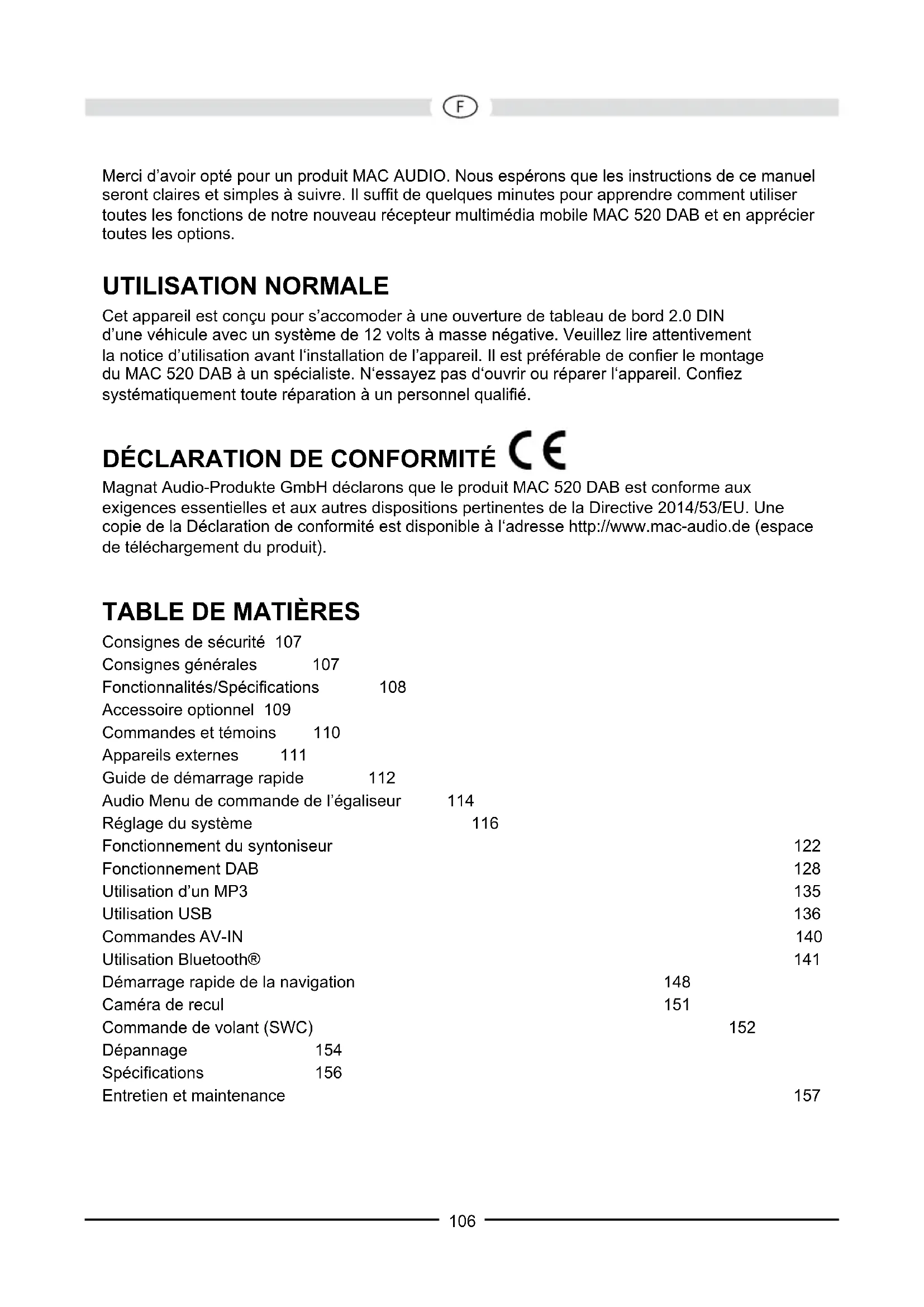 due to the environmental conditions of the vehicle. 105Merci d’avoir opté pour un produit MAC AUDIO. Nous espérons que les instructions de ce manuel seront claires et simples à suivre. Il suft de quelques minutes pour apprendre comment utiliser toutes les fonctions de notre nouveau récepteur multimédia mobile MAC 520 DAB et en apprécier toutes les options. UTILISATION NORMALE Cet appareil est conçu pour s’accomoder à une ouverture de tableau de bord 2.0 DIN d’une véhicule avec un système de 12 volts à masse négative. Veuillez lire attentivement la notice d’utilisation avant l‘installation de l’appareil. Il est préférable de coner le montage du MAC 520 DAB à un spécialiste. N‘essayez pas d‘ouvrir ou réparer l‘appareil. Conez systématiquement toute réparation à un personnel qualié.