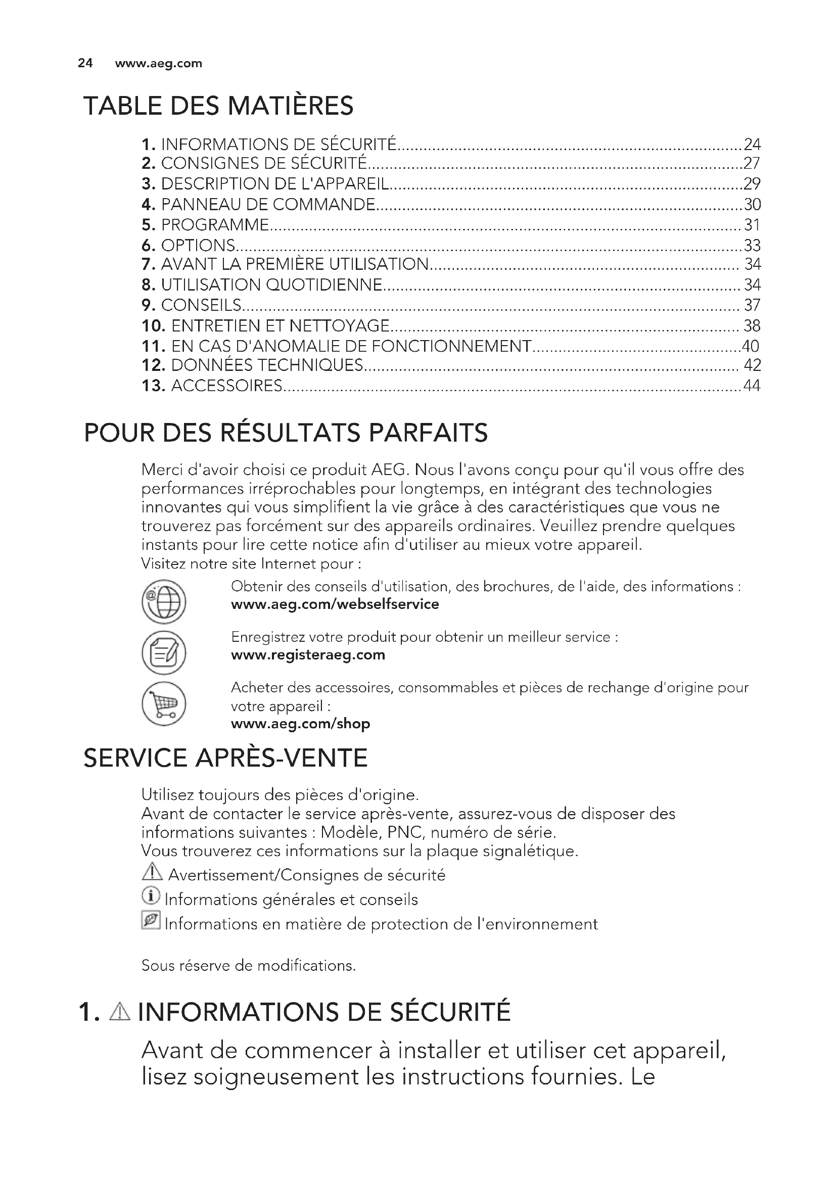 Merci d'avoir choisi ce produit AEG. Nous l'avons conçu pour qu'il vous offre des performances irréprochables pour longtemps, en intégrant des technologies innovantes qui vous simplifient la vie grâce à des caractéristiques que vous ne trouverez pas forcément sur des appareils ordinaires. Veuillez prendre quelques instants pour lire cette notice afin d'utiliser au mieux votre appareil. Visitez notre site Internet pour : Obtenir des conseils d'utilisation, des brochures, de l'aide, des informations : www.aeg.com/webselfservice Enregistrez votre produit pour obtenir un meilleur service : www.registeraeg.com Acheter des accessoires, consommables et pièces de rechange d'origine pour votre appareil : www.aeg.com/shop
