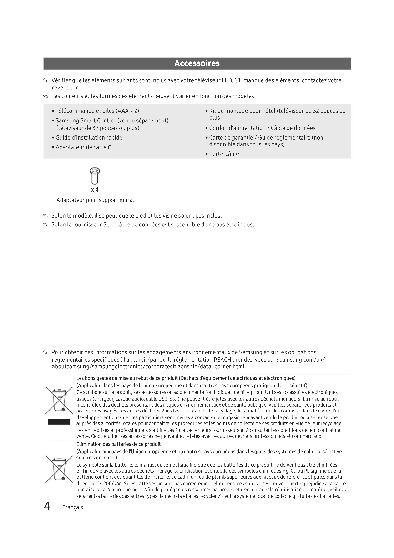 - Porte-câble x 4 Adaptateur pour support mural ✎ Selon le modèle, il se peut que le pied et les vis ne soient pas inclus. ✎ Selon le fournisseur SI, le câble de données est susceptible de ne pas être inclus. ✎ Pour obtenir des informations sur les engagements environnementaux de Samsung et sur les obligations réglementaires spécifiques àl'appareil (par ex. la réglementation REACH), rendez-vous sur : samsung.com/uk/ aboutsamsung/samsungelectronics/corporatecitizenship/data_corner.html Les bons gestes de mise au rebut de ce produit (Déchets d’équipements électriques et électroniques) (Applicable dans les pays de l’Union Européenne et dans d’autres pays européens pratiquant le tri sélectif) Ce symbole sur le produit, ses accessoires ou sa documentation indique que ni le produit, ni ses accessoires électroniques usagés (chargeur, casque audio, câble USB, etc.) ne peuvent être jetés avec les autres déchets ménagers. La mise au rebut incontrôlée des déchets présentant des risques environnementaux et de santé publique, veuillez séparer vos produits et accessoires usagés des autres déchets. Vous favoriserez ainsi le recyclage de la matière qui les compose dans le cadre d’un développement durable. Les particuliers sont invités à contacter le magasin leur ayant vendu le produit ou à se renseigner auprès des autorités locales pour connaître les procédures et les points de collecte de ces produits en vue de leur recyclage. Les entreprises et professionnels sont invités à contacter leurs fournisseurs et à consulter les conditions de leur contrat de vente. Ce produit et ses accessoires ne peuvent être jetés avec les autres déchets professionnels et commerciaux. Elimination des batteries de ce produit (Applicable aux pays de l’Union européenne et aux autres pays européens dans lesquels des systèmes de collecte sélective sont mis en place.) Le symbole sur la batterie, le manuel ou l’emballage indique que les batteries de ce produit ne doivent pas être éliminées en n de vie avec les autres déchets ménagers. L’indication éventuelle des symboles chimiques Hg, Cd ou Pb signie que la batterie contient des quantités de mercure, de cadmium ou de plomb supérieures aux niveaux de référence stipulés dans la directive CE 2006/66. Si les batteries ne sont pas correctement éliminées, ces substances peuvent porter préjudice à la santé humaine ou à l’environnement. An de protéger les ressources naturelles et d’encourager la réutilisation du matériel, veillez à séparer les batteries des autres types de déchets et à les recycler via votre système local de collecte gratuite des batteries.5 Français Montage du socle pivotant (téléviseurs de 32pouces et de taille supérieure) [ AVERTISSEMENT: Si vous voulez que le téléviseur puisse pivoter, vous devez le xer de manière sécurisée au sol, sur un bureau ou sur le dessus d'une commode, comme décrit dans les instructions d'installation. Les téléviseurs LED de 32pouces et de plus grande taille s'accompagnent d'un socle pivotant. Vous pouvez régler ces supports de telle sorte que les téléviseurs pivotent de 20degrés, 60degrés ou 90degrés vers la gauche et vers la droite à l'aide de la FIXATION POUR SUPPORT PIVOTANT.