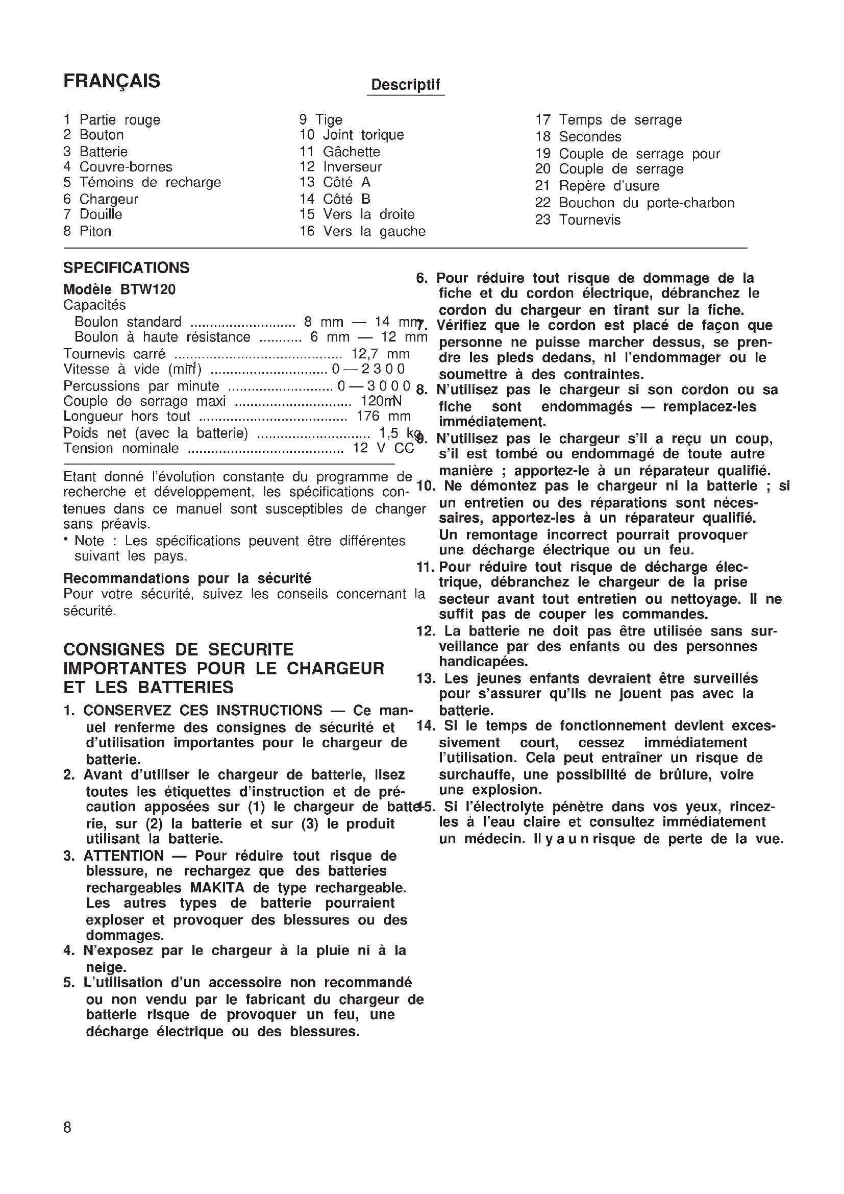 MODE D'EMPLOI BTW120 MAKITA