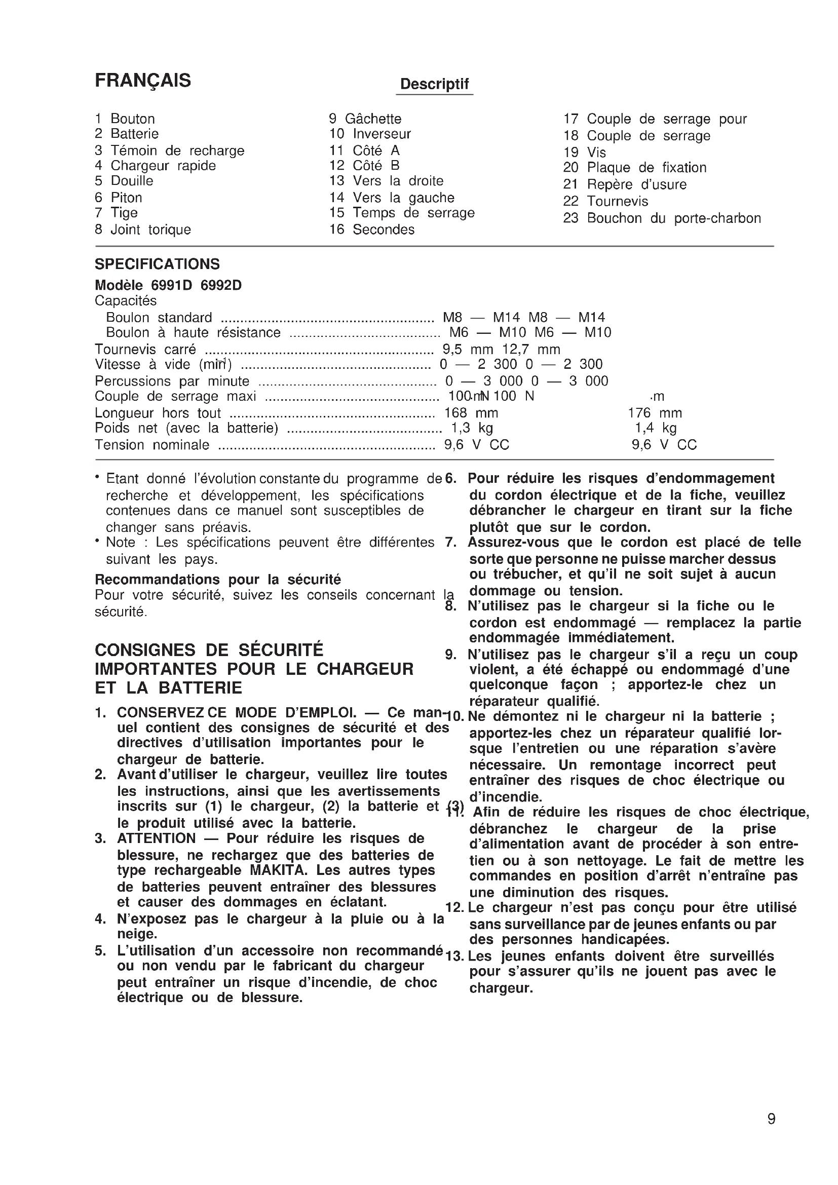 6991D/6992D (Eng) (’100. 6. 12)FRANÇAIS Descriptif 1 Bouton 2 Batterie 3 Témoin de recharge 4 Chargeur rapide 5 Douille 6 Piton 7 Tige 8 Joint torique 9 Gâchette 10 Inverseur 11 Côté A 12 Côté B 13 Vers la droite 14 Vers la gauche 15 Temps de serrage 16 Secondes 17 Couple de serrage pour 18 Couple de serrage 19 Vis 20 Plaque de fixation 21 Repère d’usure 22 Tournevis 23 Bouchon du porte-charbon SPECIFICATIONS Modèle 6991D 6992D Capacités Boulon standard ....................................................... M8 — M14 M8 — M14 Boulon à haute résistance ....................................... M6 — M10 M6 — M10 Tournevis carré ........................................................... 9,5 mm 12,7 mm Vitesse à vide (min