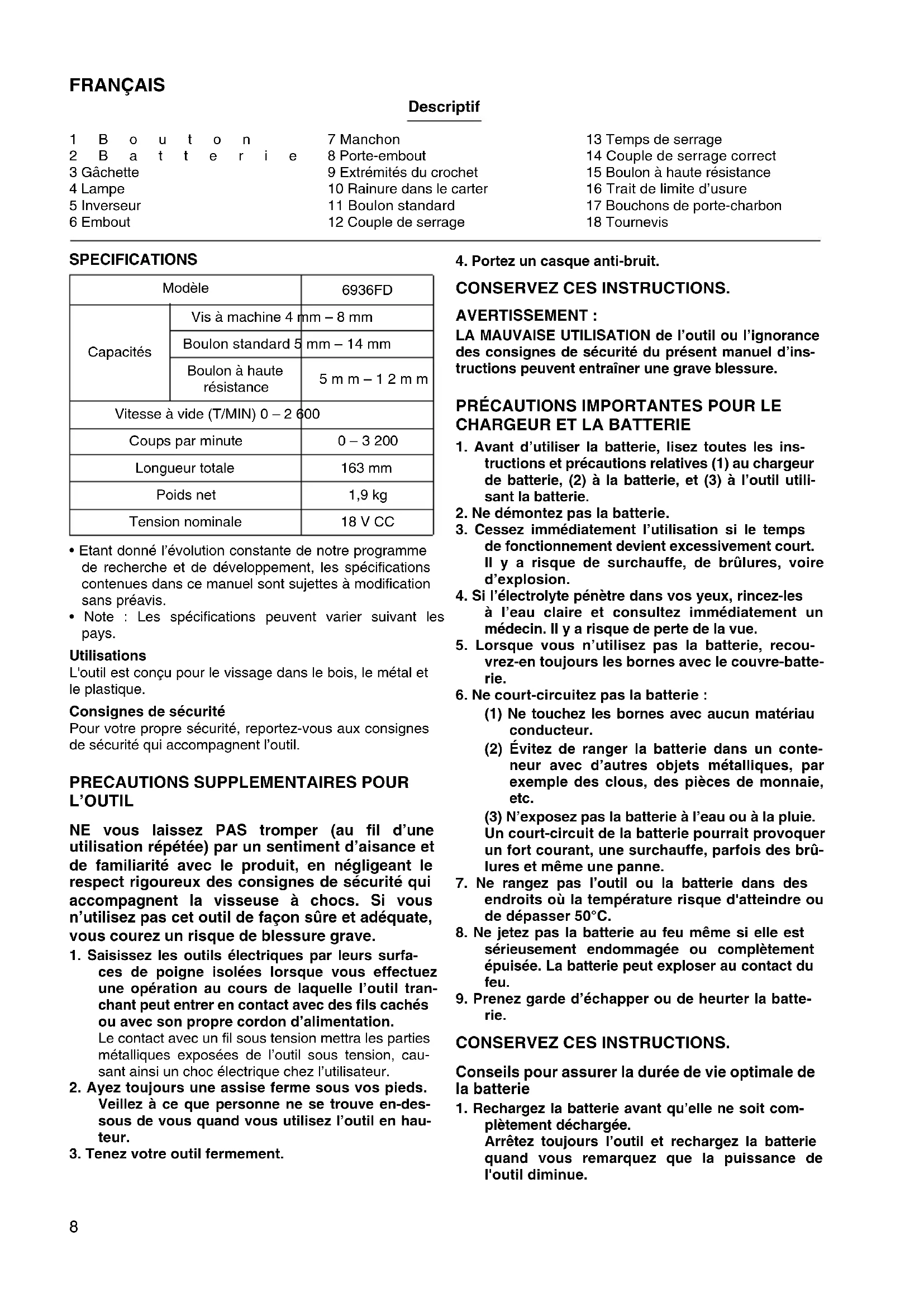 plètement déchargée. Arrêtez toujours l’outil et rechargez la batterie quand vous remarquez que la puissance de l'outil diminue. Modèle 6936FD Capacités Vis à machine 4 mm – 8 mm Boulon standard 5 mm – 14 mm Boulon à haute résistance 5mm–12mm Vitesse à vide (T/MIN) 0 – 2 600 Coups par minute 0 – 3 200 Longueur totale 163 mm Poids net 1,9 kg Tension nominale 18 V CC9