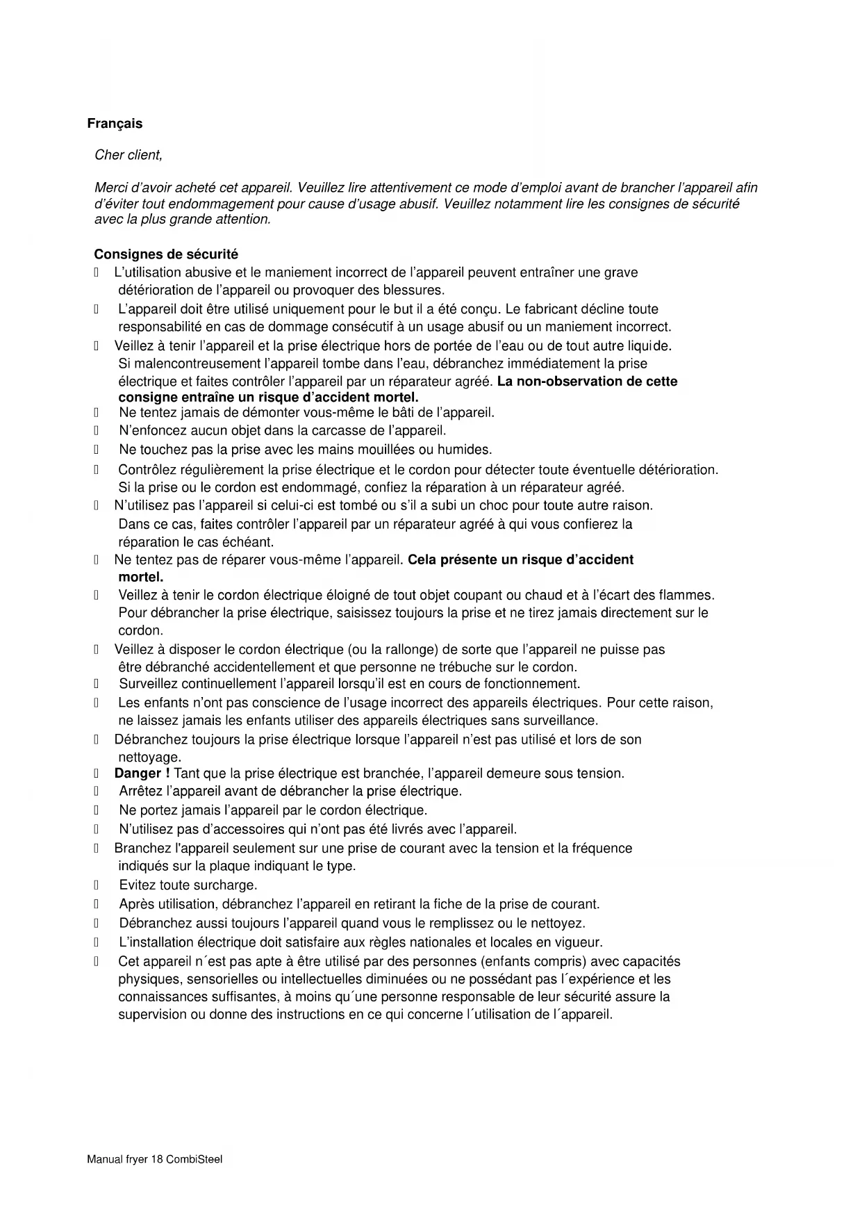 Lassen Sie die Fritteuse abkühlen. o Entfernen Sie das abnehmbare Bedienelement aus der Halterung. o Schrauben Sie die schwarze Schutzkappe an der Unterseite des abnehmbare Bedienelements ab. o Drücken Sie die “Rückstelltaste” (Reset-Taste) der Maximalsicherung. Es ist ein deutliches Klicken zu hören. o Schrauben Sie die schwarze Schutzkappe wieder auf. o Hängen Sie das abnehmbare Bedienelement in die Halterung. Garantie Jeder Defekt, der die Funktion des Geräts nachteilig beeinflusst und der sich innerhalb eines Jahres nach Ankauf des Geräts zeigt, wird durch Reparatur oder Auswechslung kostenlos behoben, falls das Gerät den Anleitungen entsprechend gebraucht und gewartet wurde und nicht in irgendeiner Weise falsch behandelt oder unzweckmäßig benutzt wurde. Ihre gesetzlich verbrieften Rechte bleiben davon unberührt. Ist die Garantie rechtsgültig, geben Sie an, wo und wann Sie das Gerät gekauft haben und legen Sie eine Quittung (z.B. Kassenzettel) bei. Auf Grund unserer Zielsetzung, die Produktentwicklung stetig fortzusetzen, behalten wir uns das Recht vor, das Produkt, die Verpackung und die Unterlagen ohne vorherige Inkenntnissetzung zu ändern. Manual fryer 16 CombiSteelEntsorgung & Umwelt Am Ende der Lebensdauer das Geräts bitte gemäß den aktuell geltenden Vorschriften und Richtlinien entsorgen. Entsorgen Sie Verpackungsmaterialien wie Kunststoff und Kartons nach den entsprechenden nationalen Vorschriften. Benutztes Frittieröl und Fett bitte gemäß den aktuell geltenden Vorschriften und Richtlinien entsorgen. Ersatzteile Für technische Auskünfte und Konformitätserklärungen siehe www.combisteel.com Manual fryer 17 CombiSteelFrançais Cher client, Merci d’avoir acheté cet appareil. Veuillez lire attentivement ce mode d’emploi avant de brancher l’appareil afin d’éviter tout endommagement pour cause d’usage abusif. Veuillez notamment lire les consignes de sécurité avec la plus grande attention. Consignes de sécurité L’utilisation abusive et le maniement incorrect de l’appareil peuvent entraîner une grave détérioration de l’appareil ou provoquer des blessures. L’appareil doit être utilisé uniquement pour le but il a été conçu. Le fabricant décline toute responsabilité en cas de dommage consécutif à un usage abusif ou un maniement incorrect. Veillez à tenir l’appareil et la prise électrique hors de portée de l’eau ou de tout autre liquide. Si malencontreusement l’appareil tombe dans l’eau, débranchez immédiatement la prise électrique et faites contrôler l’appareil par un réparateur agréé. La non-observation de cette consigne entraîne un risque d’accident mortel. Ne tentez jamais de démonter vous-même le bâti de l’appareil. N’enfoncez aucun objet dans la carcasse de l’appareil. Ne touchez pas la prise avec les mains mouillées ou humides. Contrôlez régulièrement la prise électrique et le cordon pour détecter toute éventuelle détérioration. Si la prise ou le cordon est endommagé, confiez la réparation à un réparateur agréé. N’utilisez pas l’appareil si celui-ci est tombé ou s’il a subi un choc pour toute autre raison. Dans ce cas, faites contrôler l’appareil par un réparateur agréé à qui vous confierez la réparation le cas échéant. Ne tentez pas de réparer vous-même l’appareil. Cela présente un risque d’accident mortel. Veillez à tenir le cordon électrique éloigné de tout objet coupant ou chaud et à l’écart des flammes. Pour débrancher la prise électrique, saisissez toujours la prise et ne tirez jamais directement sur le cordon. Veillez à disposer le cordon électrique (ou la rallonge) de sorte que l’appareil ne puisse pas être débranché accidentellement et que personne ne trébuche sur le cordon. Surveillez continuellement l’appareil lorsqu’il est en cours de fonctionnement. Les enfants n’ont pas conscience de l’usage incorrect des appareils électriques. Pour cette raison, ne laissez jamais les enfants utiliser des appareils électriques sans surveillance. Débranchez toujours la prise électrique lorsque l’appareil n’est pas utilisé et lors de son nettoyage. Danger ! Tant que la prise électrique est branchée, l’appareil demeure sous tension. Arrêtez l’appareil avant de débrancher la prise électrique. Ne portez jamais l’appareil par le cordon électrique. N’utilisez pas d’accessoires qui n’ont pas été livrés avec l’appareil. Branchez l'appareil seulement sur une prise de courant avec la tension et la fréquence indiqués sur la plaque indiquant le type. Evitez toute surcharge. Après utilisation, débranchez l’appareil en retirant la fiche de la prise de courant. Débranchez aussi toujours l’appareil quand vous le remplissez ou le nettoyez. L’installation électrique doit satisfaire aux règles nationales et locales en vigueur. Cet appareil n´est pas apte à être utilisé par des personnes (enfants compris) avec capacités physiques, sensorielles ou intellectuelles diminuées ou ne possédant pas l´expérience et les connaissances suffisantes, à moins qu´une personne responsable de leur sécurité assure la supervision ou donne des instructions en ce qui concerne l´utilisation de l´appareil. Manual fryer 18 CombiSteelConsignes particulières de sécurité Pour cette friteuse nous recommandons d’utiliser de l’huile ou de la graisse à frire liquide. Si vous utilisez pourtant une graisse consistante, s’il vous plaît préchauffez la graisse du pas à pas et lisez soigneusement ‘les conseils pour graisse consistante’. Débranchez aussi toujours l’appareil quand vous le remplissez ou quand vous le nettoyez. L’installation électrique doit satisfaire aux règles nationales et locales en vigueur. Si le niveau d’huile descend sous le niveau minimum, cela peut créer un risque d’incendie. Assurez-vous en conséquence que le bac contient suffisamment d’huile et contrôlez le niveau en c