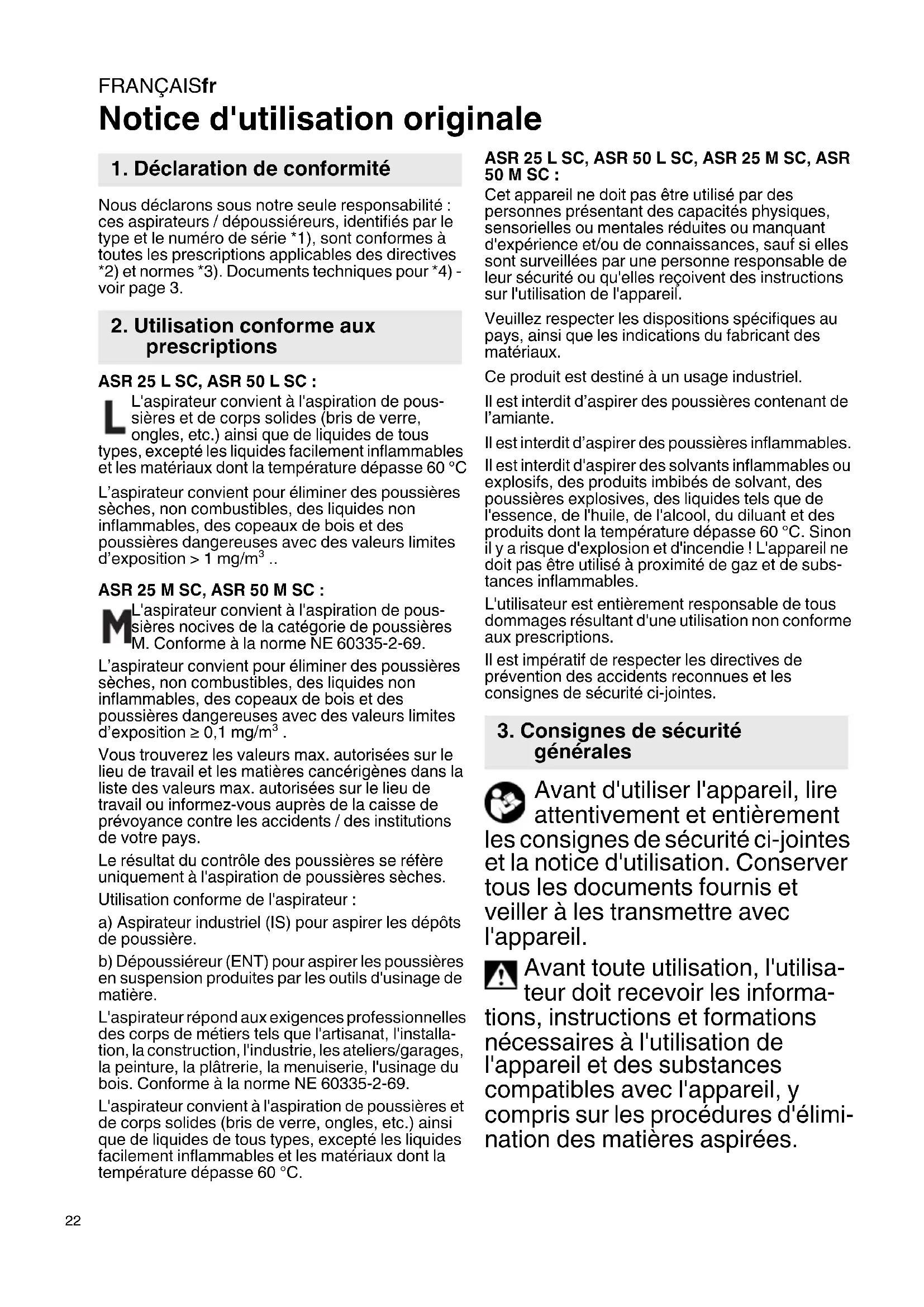 Notice d'utilisation originale Nous déclarons sous notre seule responsabilité : ces aspirateurs / dépoussiéreurs, identifiés par le type et le numéro de série *1), sont conformes à toutes les prescriptions applicables des directives *2) et normes *3). Documents techniques pour *4) - voir page 3. ASR 25 L SC, ASR 50 L SC : L'aspirateur convient à l'aspiration de pous- sières et de corps solides (bris de verre, ongles, etc.) ainsi que de liquides de tous types, excepté les liquides facilement inflammables et les matériaux dont la température dépasse 60 °C L’aspirateur convient pour éliminer des poussières sèches, non combustibles, des liquides non inflammables, des copeaux de bois et des poussières dangereuses avec des valeurs limites d’exposition > 1 mg/m³ .. ASR 25 M SC, ASR 50 M SC : L'aspirateur convient à l'aspiration de pous- sières nocives de la catégorie de poussières M. Conforme à la norme NE 60335-2-69. L’aspirateur convient pour éliminer des poussières sèches, non combustibles, des liquides non inflammables, des copeaux de bois et des poussières dangereuses avec des valeurs limites d’exposition ≥ 0,1 mg/m³ . Vous trouverez les valeurs max. autorisées sur le lieu de travail et les matières cancérigènes dans la liste des valeurs max. autorisées sur le lieu de travail ou informez-vous auprès de la caisse de prévoyance contre les accidents / des institutions de votre pays. Le résultat du contrôle des poussières se réfère uniquement à l'aspiration de poussières sèches. Utilisation conforme de l'aspirateur : a) Aspirateur industriel (IS) pour aspirer les dépôts de poussière. b) Dépoussiéreur (ENT) pour aspirer les poussières en suspension produites par les outils d'usinage de matière. L'aspirateur répond aux exigences professionnelles des corps de métiers tels que l'artisanat, l'installa- tion, la construction, l'industrie, les ateliers/garages, la peinture, la plâtrerie, la menuiserie, l'usinage du bois. Conforme à la norme NE 60335-2-69. L'aspirateur convient à l'aspiration de poussières et de corps solides (bris de verre, ongles, etc.) ainsi que de liquides de tous types, excepté les liquides facilement inflammables et les matériaux dont la température dépasse 60 °C. ASR 25 L SC, ASR 50 L SC, ASR 25 M SC, ASR 50 M SC : Cet appareil ne doit pas être utilisé par des personnes présentant des capacités physiques, sensorielles ou mentales réduites ou manquant d'expérience et/ou de connaissances, sauf si elles sont surveillées par une personne responsable de leur sécurité ou qu'elles reçoivent des instructions sur l'utilisation de l'appareil. Veuillez respecter les dispositions spécifiques au pays, ainsi que les indications du fabricant des matériaux. Ce produit est destiné à un usage industriel. Il est interdit d’aspirer des poussières contenant de l’amiante. Il est interdit d’aspirer des poussières inflammables. Il est interdit d'aspirer des solvants inflammables ou explosifs, des produits imbibés de solvant, des poussières explosives, des liquides tels que de l'essence, de l'huile, de l'alcool, du diluant et des produits dont la température dépasse 60 °C. Sinon il y a risque d'explosion et d'incendie ! L'appareil ne doit pas être utilisé à proximité de gaz et de subs- tances inflammables. L'utilisateur est entièrement responsable de tous dommages résultant d'une utilisation non conforme aux prescriptions. Il est impératif de respecter les directives de prévention des accidents reconnues et les consignes de sécurité ci-jointes. Avant d'utiliser l'appareil, lire attentivement et entièrement les consignes de sécurité ci-jointes et la notice d'utilisation. Conserver tous les documents fournis et veiller à les transmettre avec l'appareil. Avant toute utilisation, l'utilisa- teur doit recevoir les informa- tions, instructions et formations nécessaires à l'utilisation de l'appareil et des substances compatibles avec l'appareil, y compris sur les procédures d'élimi- nation des matières aspirées.