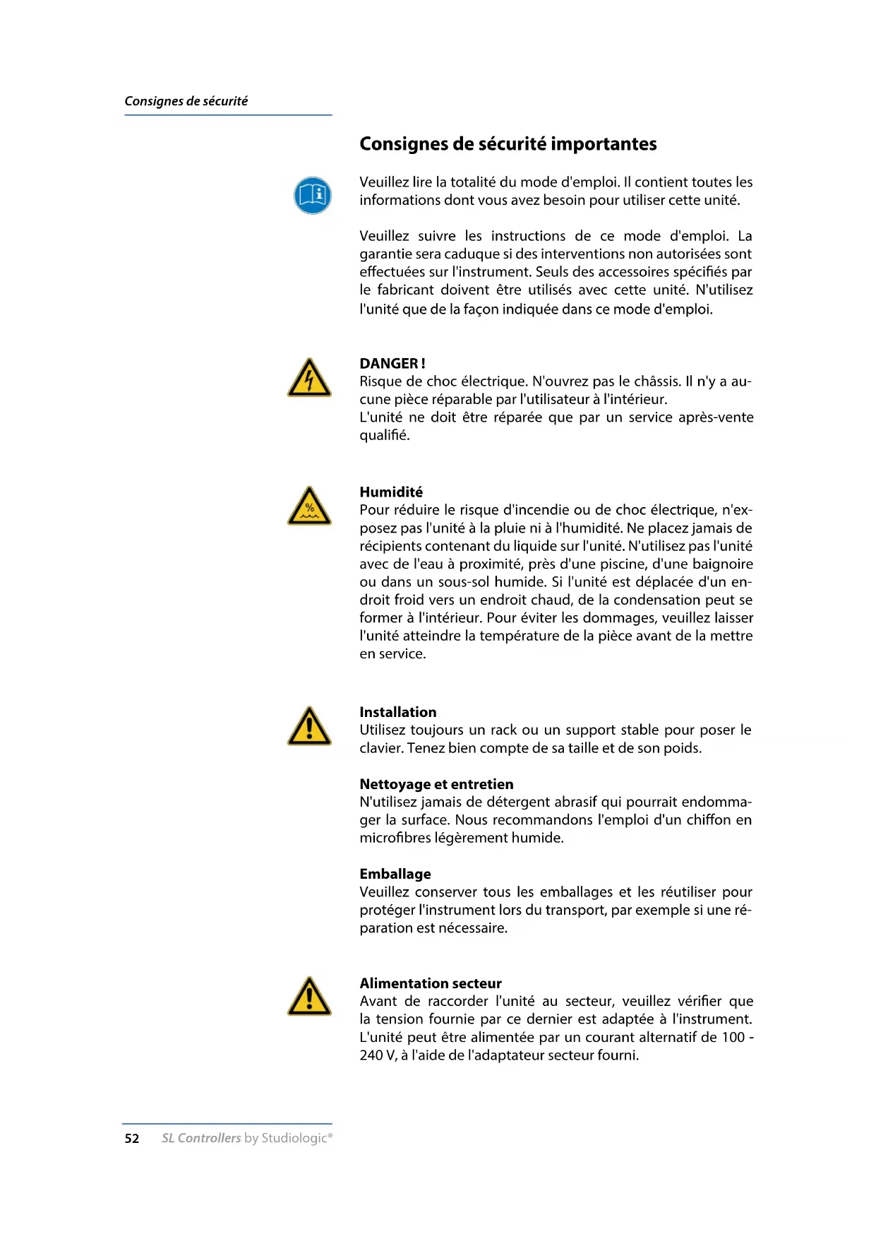 Merci beaucoup d'avoircisionle SL. Vos estesmaintenant l'heureux propriete d'un instrument professionnel produit par le celebre fabricant Studiologic. Le fonctionnement du SL est simple grace au grand ecran couleur, a son encodeur principal avec des commandes de navigation plus un click intégré, et il offre un toucher de clavier parfait. Nous vous recommandons de dire attentivement la totalité du mode d'emploi pour profiter pleinement de toutes les fonctions de votre SL. Ce mode d'emploi a pour but d'être un guide simple et rapide afin d'aider l'utilisateur à comprendre l'instrument et toutes ses commandes,只不过 qu'une description générale de la structure complète et de l'édition détaillée, rendue encore plus soupé et conviviale par l'éditeur informatique téléchargeable sur nos sites officiers.