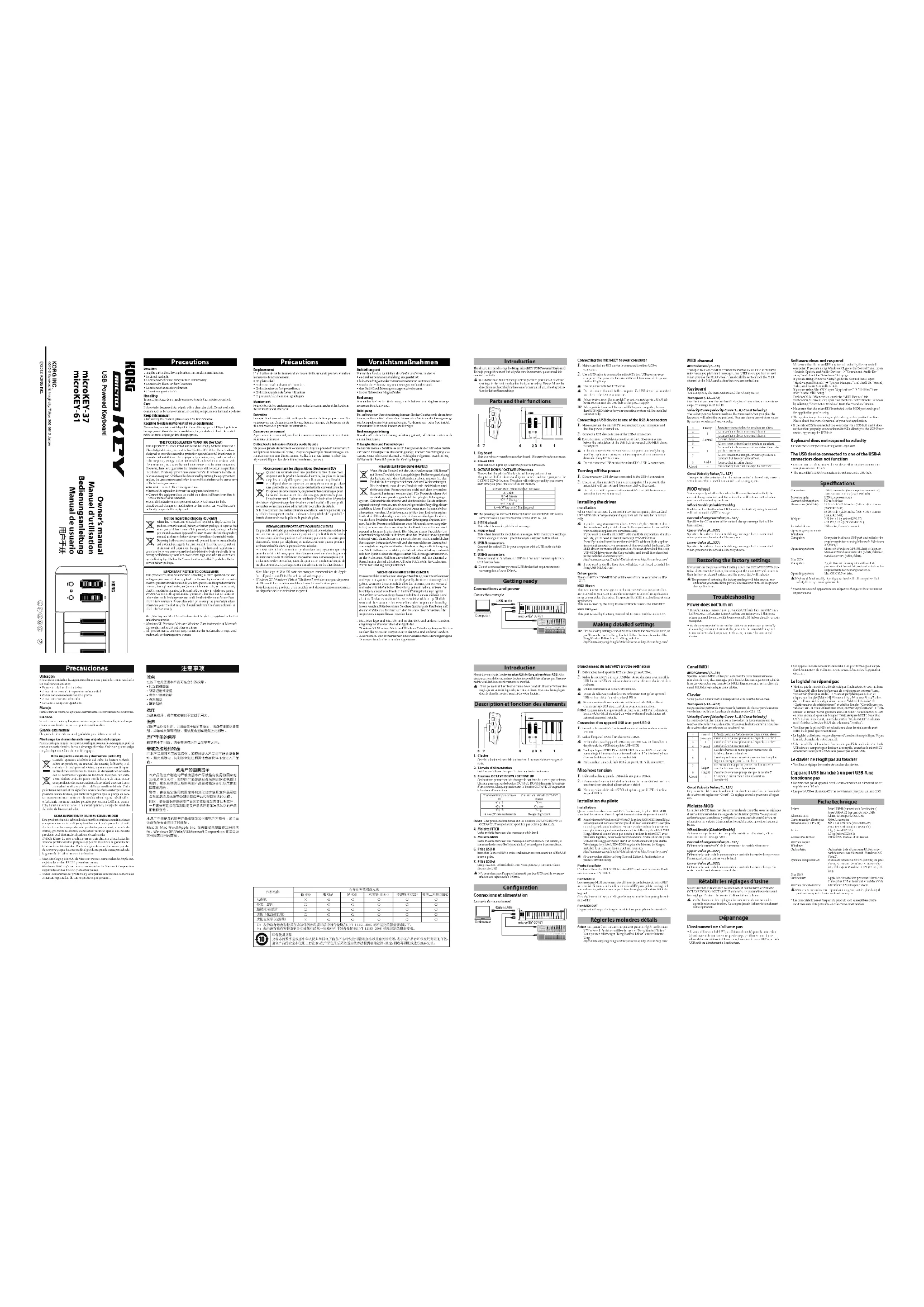 - Ne branchez pas d’appareil dont la consommation en alimentation est supérieure à 100mA.• Les ports USB-A du microKEY ne conviennent pas pour un hub USB. Fiche technique Prises: Prise USB-B (connexion à l’ordinateur) Prise USB-A x2 (servent de hub USB)Alimentation: Alimentation par le bus USBConsommation électrique: 500mA ou moinsDimensions (L x P x H): 565 × 139 × 54 mm (microKEY-37) 850 × 139 × 54 mm (microKEY-61)Poids: 1 kg (microKEY-37) 1,7 kg (microKEY-61)Accessoires inclus: Câble USB, Manuel d’utilisationSystème requisWindowsOrdinateur: Ordinateur doté d’une prise USB et pou-vant tourner sous Microso Windows XP/Vista/7. Système d’exploitation: Microso Windows XP SP3 (32 bits) ou plus récent, Microso Windows Vista SP2 (32 bits, 64 bits) ou Windows 7 SP1 (32 bits, 64 bits).Mac OS XOrdinateur: Apple Macintosh avec processeur Intel doté d’une prise USB et tournant sous Mac OS X.Système d’exploitation: Mac OS X 10.5 voire plus récent. Même si votre ordinateur répond aux exigences citées plus haut, il peut arriver que le clavier ne fonctionne pas.* Les caractéristiques et l’aspect du produit sont susceptibles d’être modi és sans avis préalable en vue d’une amélioration. Precautions LocationUsing the unit in the following locations can result in a malfunction.• In direct sunlight• Locations of extreme temperature or humidity• Excessively dusty or dirty locations• Locations of excessive vibration• Close to magnetic fieldsHandlingTo avoid breakage, do not apply excessive force to the switches or controls. Care If the exterior becomes dirty, wipe it with a clean, dry cloth. Do not use liquid cleaners such as benzene or thinner, or cleaning compounds or flammable polishes.Keep this manualAfter reading this manual, please keep it for later reference.Keeping foreign matter out of your equipmentNever set any container with liquid in it near this equipment. If liquid gets into the equipment, it could cause a breakdown, fire, or electrical shock. Be careful not to let metal objects get into the equipment.THE FCC REGULATION WARNING (for USA) This equipment has been tested and found to comply with the limits for a Class B digital device, pursuant to Part 15 of the FCC Rules. These limits are designed to provide reasonable protection against harmful interference in a residential installation. This equipment generates, uses, and can radiate radio frequency energy and, if not installed and used in accordance with the instructions, may cause harmful interference to radio communications. However, there is no guarantee that interference will not occur in a particular installation. If this equipment does cause harmful interference to radio or television reception, which can be determined by turning the equipment off and on, the user is encouraged to try to correct the interference by one or more of the following measures:● Reorient or relocate the receiving antenna.● Increase the separation between the equipment and receiver. ● Connect the equipment into an outlet on a circuit different from that to which the receiver is connected.● Consult the dealer or an experienced radio/TV technician for help. Unauthorized changes or modification to this system can void the user’s authority to operate this equipment.Notice regarding disposal (EU only) When this “crossed-out wheeled bin” symbol is displayed on the product, owner’s manual, battery, or battery package, it signifies that when you wish to dispose of this product, manual, package or battery you must do so in an approved manner. Do not discard this product, manual, package or battery along with ordinary household waste. Disposing in the correct manner will prevent harm to human health and potential damage to the environment. Since the correct method of disposal will depend on the applicable laws and regulations in your locality, please contact your local administrative body for details. If the battery contains heavy metals in excess of the regulated amount, a chemical symbol is displayed below the “crossed-out wheeled bin” symbol on the bat-tery or battery package.IMPORTANT NOTICE TO CONSUMERS This product has been manufactured according to strict specifications and voltage requirements that are applicable in the country in which it is intended that this product should be used. If you have purchased this product via the internet, through mail order, and/or via a telephone sale, you must verify that this product is intended to be used in the country in which you reside.WARNING: Use of this product in any country other than that for which it is intended could be dangerous and could invalidate the manufacturer’s or distributor’s warranty. Please also retain your receipt as proof of purchase otherwise your product may be disqualified from the manufacturer’s or distributor’s warranty.- Mac, Mac logo and Mac OS are trademarks of Apple Inc., registered in the U.S. and other countries. - Windows XP, Windows Vista and Windows 7 are trademarks of Microsoft Corporation in the U.S. and other countries. - All product names and company names are the trademarks or registered trademarks of their respective owners. Précautions EmplacementL’utilisation de cet instrument dans les endroits suivants peut en entraîner le mauvais fonctionnement.• En plein soleil• Endroits très chauds ou très humides• Endroits sales ou fort poussiéreux• Endroits soumis à de fortes vibrations• A proximité de champs magnétiquesManiementPour éviter de les endommager, manipulez les commandes et les boutonsde cet instrument avec soin.EntretienLorsque l’instrument se salit, nettoyez-le avec un chiffon propre et sec. Nevous servez pas d’agents de nettoyage liquides tels que du benzène ou dudiluant, voire des produits inflammables.Conservez ce manuelAprès avoir lu ce manuel, veuillez le conserver soigneusement pour touteréférence ultérieure.Evitez toute intrusion d’objets ou de liquideNe pla