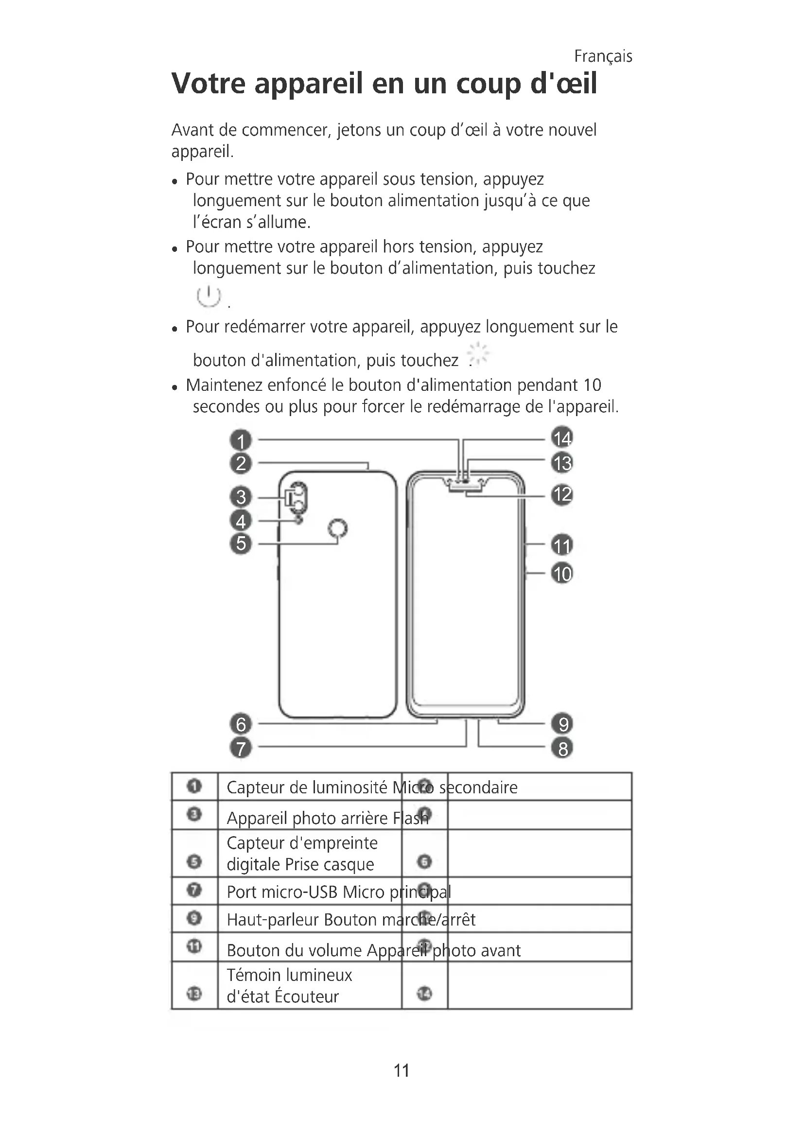 12Double carte Double veille Simple passe (uniquement pour les appareils avec double SIM) Votre appareil prend uniquement en charge le mode double carte double veille simple passe, qui implique que vous ne pouvez utiliser les deux cartes SIM simultanément que pour les appels ou les services de données. l Quand vous appelez via la carte SIM 1, la carte SIM 2 ne peut être utilisée pour appeler ou répondre à des appels. Si quelqu’un appelle via la carte SIM 2, il entendra un message vocal tel que « L’abonné contacté est hors de la zone de service » ou « Cet abonné n’est pas en mesure de vous répondre pour le moment ; veuillez réessayer plus tard ». Le message variera d’un fournisseur à l’autre. l Quand vous utilisez le service de données de la carte SIM 1, le service de données de la carte SIM 2 sera désactivé. La fonctionnalité simple passe de votre appareil vous aide à réduire sa consommation d'énergie et à augmenter sa durée de veille. Elle n’est pas liée aux conditions de réseau de votre fournisseur de services. Vous pouvez aller à Paramètres > Sans l & réseaux > Gestion des cartes SIM, et activer Transfert d'appel entre cartes SIM pour éviter les conits mentionnés ci-dessus. 13Pour plus d'informations Si vous rencontrez des problèmes lorsque vous utilisez votre téléphone, vous pouvez obtenir de l’aide à partir des ressources suivantes : l Allez à Astuces pour plus de détails sur la fonction et de conseils d'utilisation. l Visitez http://consumer.huawei.com/en pour consulter les informations sur l'appareil, les questions fréquentes et autres informations. l Vous rendre sur le site http://consumer.huawei.com/en/ support pour connaître les coordonnées de contact les plus récentes pour votre pays ou région. l Vous pouvez trouver les services d'assistance téléphonique, les adresses des points de vente, la politique de service et plus d'informations pour votre région dans HiCare. Accédez à Paramètres puis touchez Système > À propos du téléphone > Légal pour consulter les informations juridiques relatives à votre produit. Accédez à Paramètres puis touchez Système > À propos du téléphone > Légal > Informations de sécurité pour consulter les informations de sécurité relatives à votre produit. Accédez à Paramètres puis touchez Système > À propos du téléphone > Information d'authentication pour consulter les informations réglementaires relatives à votre produit. Toutes les images et illustrations gurant dans ce guide, notamment la couleur et la taille de l'appareil, ainsi que le contenu de l'afchage, sont fournies à titre de référence uniquement. Il est possible que l'appareil réel diffère. Rien dans ce guide ne constitue une quelconque garantie, explicite ou implicite. 14Informations relatives à la sécurité Cette section contient des informations importantes relatives à l'utilisation de votre appareil. Elle contient également des informations sur la manière d'utiliser votre appareil en toute sécurité. Veuillez lire attentivement ces informations avant d'utiliser votre appareil. Précautions à prendre: Pour les personnes porteuses d’implants électroniques, il est préférable de mettre le téléphone mobile à une distance de 15 cm ou à l’opposé de l’implant. Conseils d’utilisation: Aucun danger lié à l’utilisation d’un téléphone mobile n’ayant été constaté, ceci est à titre de prévention. Pour réduire le niveau d’exposition au rayonnement, il est recommandé d’utiliser le téléphone mobile: