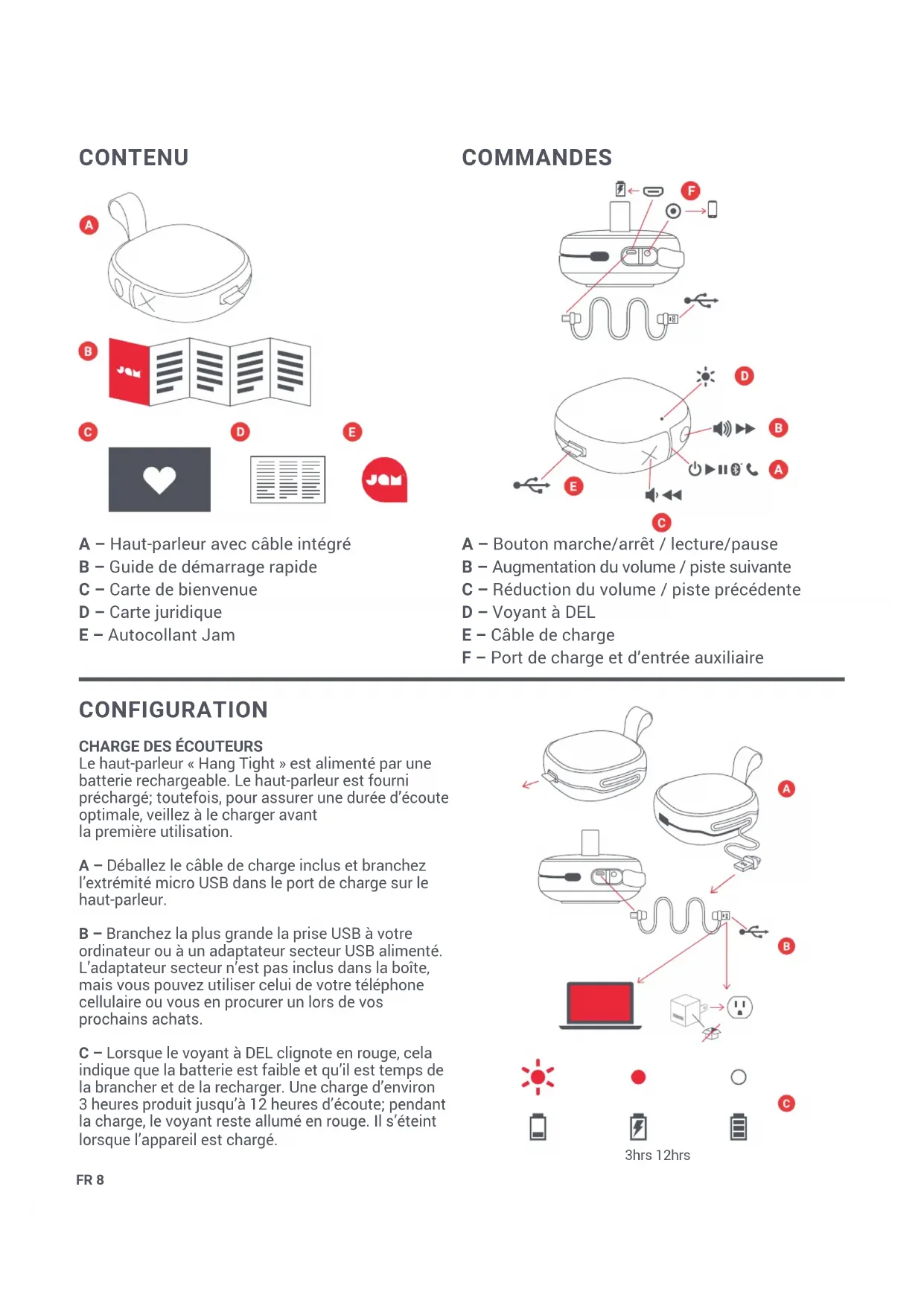 Le haut-parleur « Hang Tight » est alimenté par une batterie rechargeable. Le haut-parleur est fourni préchargé; toutefois, pour assurer une durée d’écoute optimale, veillez à le charger avant la première utilisation. A – Déballez le câble de charge inclus et branchez l’extrémité micro USB dans le port de charge sur le haut-parleur. B – Branchez la plus grande la prise USB à votre ordinateur ou à un adaptateur secteur USB alimenté. L’adaptateur secteur n’est pas inclus dans la boîte, mais vous pouvez utiliser celui de votre téléphone cellulaire ou vous en procurer un lors de vos prochains achats. C – Lorsque le voyant à DEL clignote en rouge, cela indique que la batterie est faible et qu’il est temps de la brancher et de la recharger. Une charge d’environ 3 heures produit jusqu’à 12 heures d’écoute; pendant la charge, le voyant reste allumé en rouge. Il s’éteint lorsque l’appareil est chargé. 3hrs 12hrsFR 9 UTILISATION