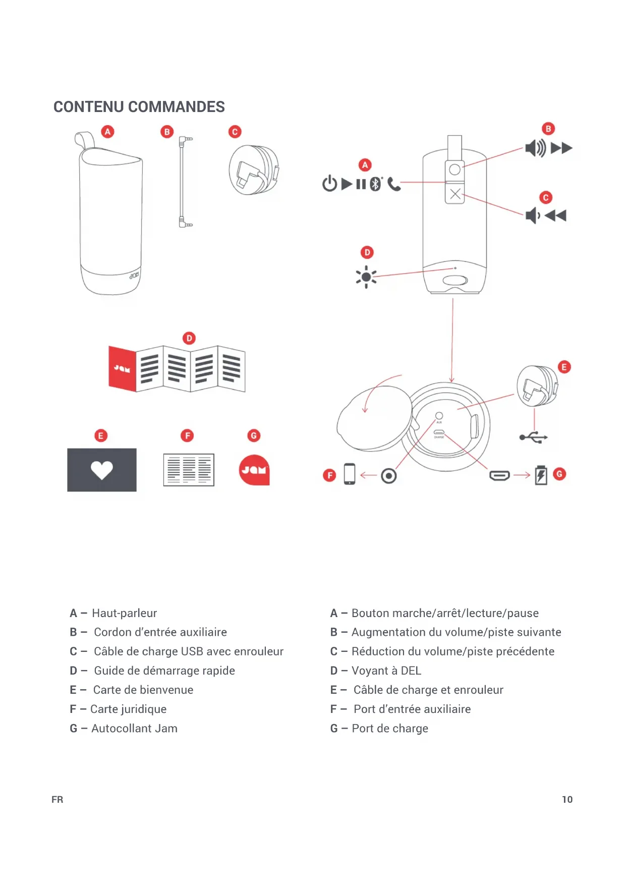 All Rights Reserved. IB-HXP606EN 9 ”Zero Chill“ HX-P606 Livret d’instructions10 CONTENU COMMANDES A – Haut-parleur B – Cordon d’entrée auxiliaire C – Câble de charge USB avec enrouleur D – Guide de démarrage rapide E – Carte de bienvenue F – Carte juridique G – Autocollant Jam A – Bouton marche/arrêt/lecture/pause B – Augmentation du volume/piste suivante C – Réduction du volume/piste précédente D – Voyant à DEL E – Câble de charge et enrouleur F – Port d’entrée auxiliaire G – Port de charge FR11 CHARGE AUX CHARGE CONFIGURATION 2hrs 12hrs 3 hrs 22 hrs