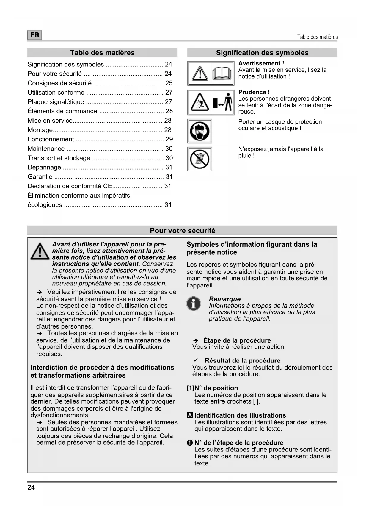 - Élimination conforme aux impératifs écologiques Pour votre sécurité Signication des symboles Avertissement ! Avant la mise en service, lisez la notice d’utilisation ! Prudence ! Les personnes étrangères doivent se tenir à l’écart de la zone dange- reuse. Porter un casque de protection oculaire et acoustique ! N'exposez jamais l'appareil à la pluie !Consignes de sécurité p. 31