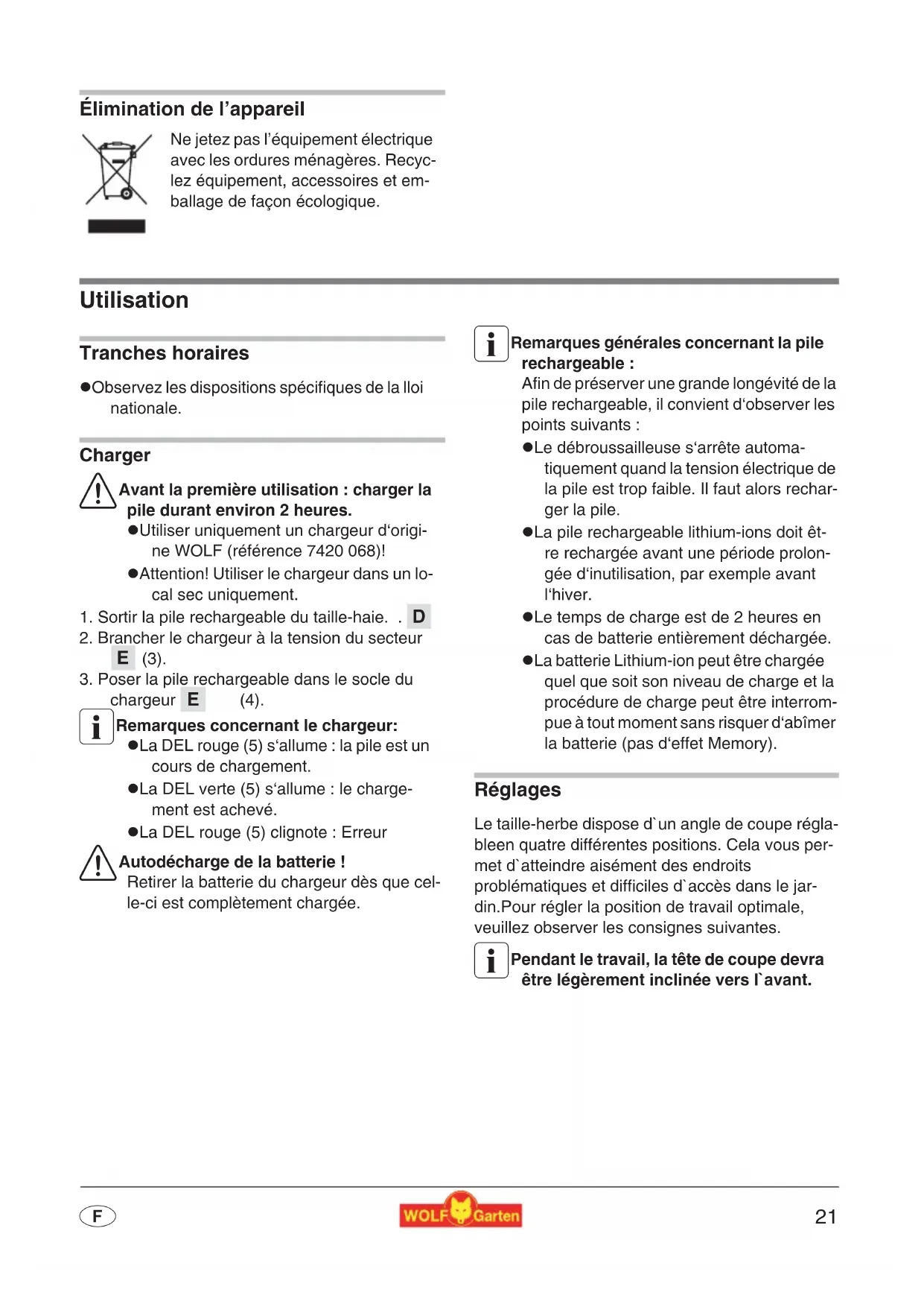 Élimination de l’appareil Utilisation Tranches horaires z Observez les dispositions spécifiques de la lloi nationale. Charger 1 Avant la première utilisation : charger la pile durant environ 2 heures.z Utiliser uniquement un chargeur d‘origi-ne WOLF (référence 7420 068)!z Attention! Utiliser le chargeur dans un lo-cal sec uniquement.1. Sortir la pile rechargeable du taille-haie. .2. Brancher le chargeur à la tension du secteur (3).3. Poser la pile rechargeable dans le socle du chargeur (4). 3 Remarques concernant le chargeur: z La DEL rouge (5) s‘allume : la pile est un cours de chargement.z La DEL verte (5) s‘allume : le charge-ment est achevé. z La DEL rouge (5) clignote : Erreur 1 Autodécharge de la batterie ! Retirer la batterie du chargeur dès que cel-le-ci est complètement chargée. 3 Remarques générales concernant la pile rechargeable :Afin de préserver une grande longévité de la pile rechargeable, il convient d‘observer les points suivants :z Le débroussailleuse s‘arrête automa-tiquement quand la tension électrique de la pile est trop faible. Il faut alors rechar-ger la pile.z La pile rechargeable lithium-ions doit êt-re rechargée avant une période prolon-gée d‘inutilisation, par exemple avant l‘hiver.z Le temps de charge est de 2 heures en cas de batterie entièrement déchargée.z La batterie Lithium-ion peut être chargée quel que soit son niveau de charge et la procédure de charge peut être interrom-pue à tout moment sans risquer d‘abîmer la batterie (pas d‘effet Memory). Réglages Le taille-herbe dispose d`un angle de coupe régla-bleen quatre différentes positions. Cela vous per-met d`atteindre aisément des endroits problématiques et difficiles d`accès dans le jar-din.Pour régler la position de travail optimale, veuillez observer les consignes suivantes. 3 Pendant le travail, la tête de coupe devra être légèrement inclinée vers l`avant.Ne jetez pas l’équipement électrique avec les ordures ménagères. Recyc-lez équipement, accessoires et em-ballage de façon écologique.
