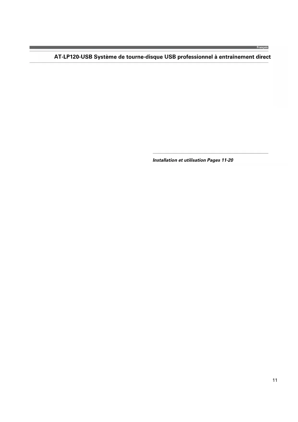 Specications are subject to change without notice.11 Français AT-LP120-USB Système de tourne-disque USB professionnel à entraînement direct Installation et utilisation Pages 11-2012 Système de tourne-disque USB professionnel à entraînement direct Introduction Merci d’avoir choisi le système de tourne-disque USB professionnel à entraînement direct AT-LP120-USB. Ce système d’enregistrement numérique pour microsillons vous permet de bénéficier de la légendaire qualité et de la haute fidélité Audio-Technica en transposant vos enregistrements sur vinyles dans le monde numérique. Dans cette boîte, vous trouverez tout ce qui est nécessaire pour convertir la musique de vos microsillons classiques en fichiers numériques : le tourne-disque stéréo Audio-Technica AT-LP120-USB, muni d’une sortie USB pour une connexion directe à votre ordinateur, les logiciels d’enregistrement Audacity (pour MAC ou PC), une cellule phono Audio- Technica Integral Dual-Magnet, un câble USB et des câbles adaptateurs. Le tourne-disque est également muni d’un préamplificateur commutable phono/ligne intégré qui permet de le brancher sur un système stéréo équipé d’une sortie phono ou ligne. Caractéristiques du système de tourne-disque USB professionnel à entraînement direct AT-LP120-USB :