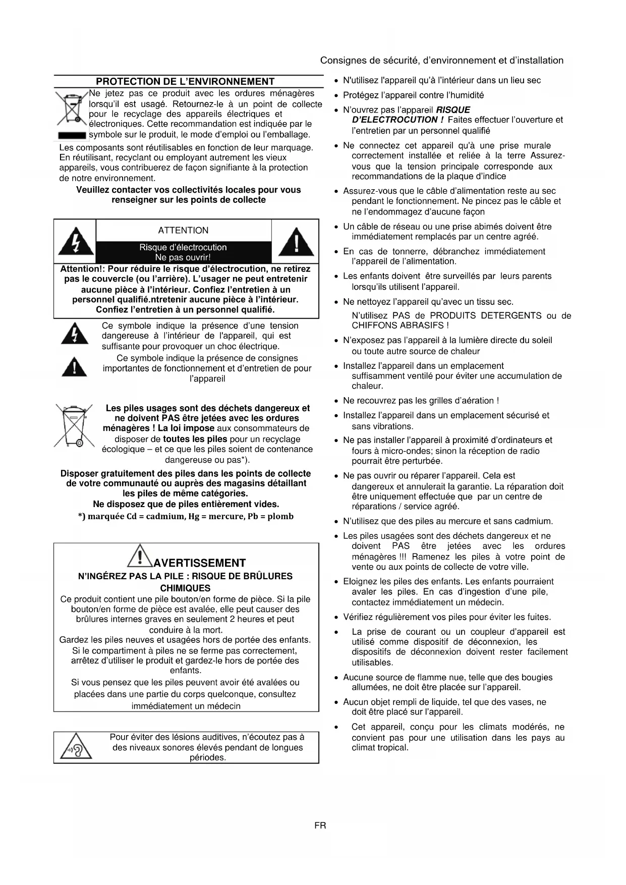 - N'ouvrez pas l'appareil RISQUE D'ELECTROCUTION! Faites effectuer l'ouverture et l'entretien par un personnel qualifié