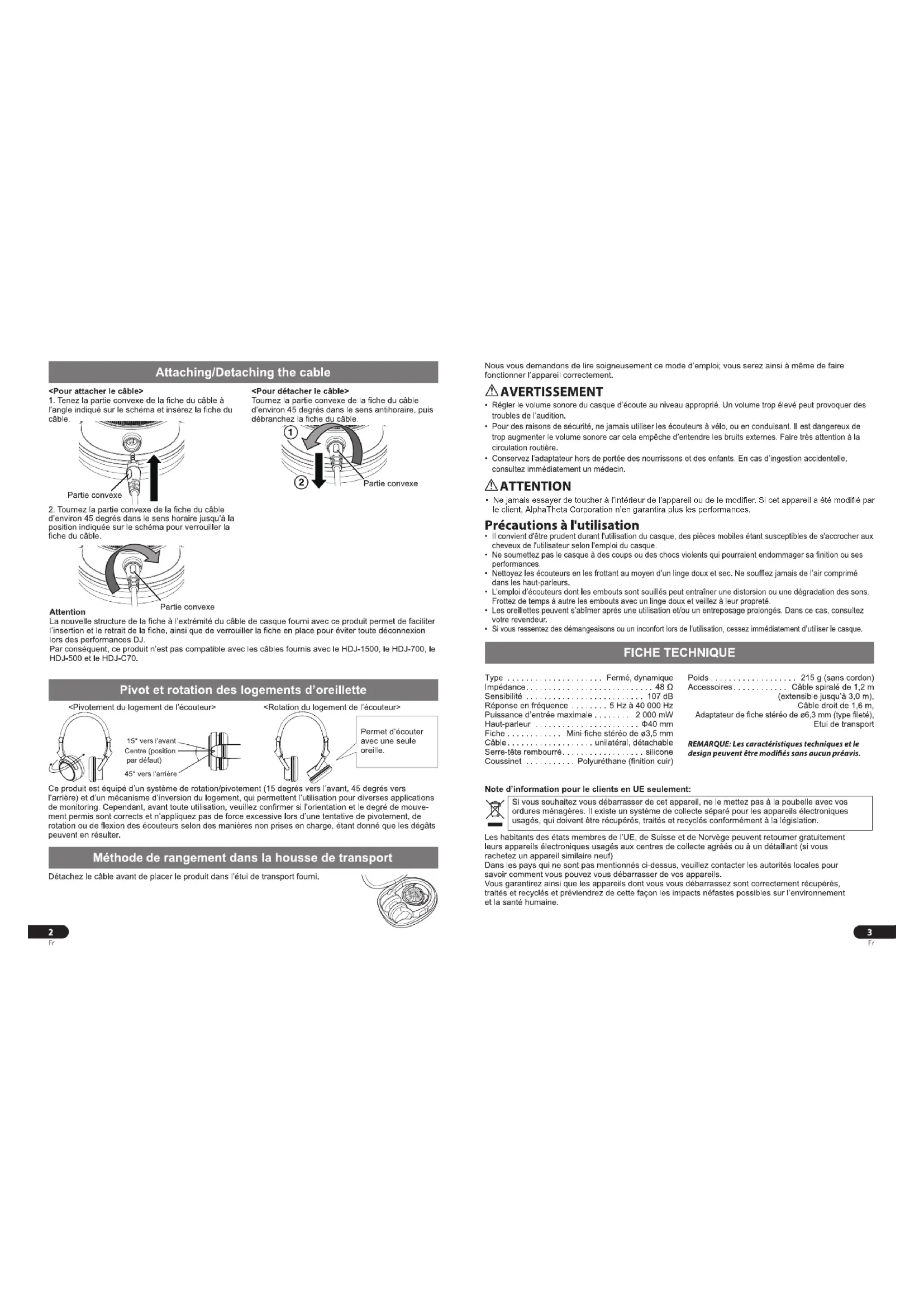 - The names of companies and products mentioned herein are trademarks or registered trademarks of their respective owners.• Ne jamais essayer de toucher à l’intérieur de l’appareil ou de le modifier. Si cet appareil a été modifié par le client, AlphaTheta Corporation n’en garantira plus les performances.4