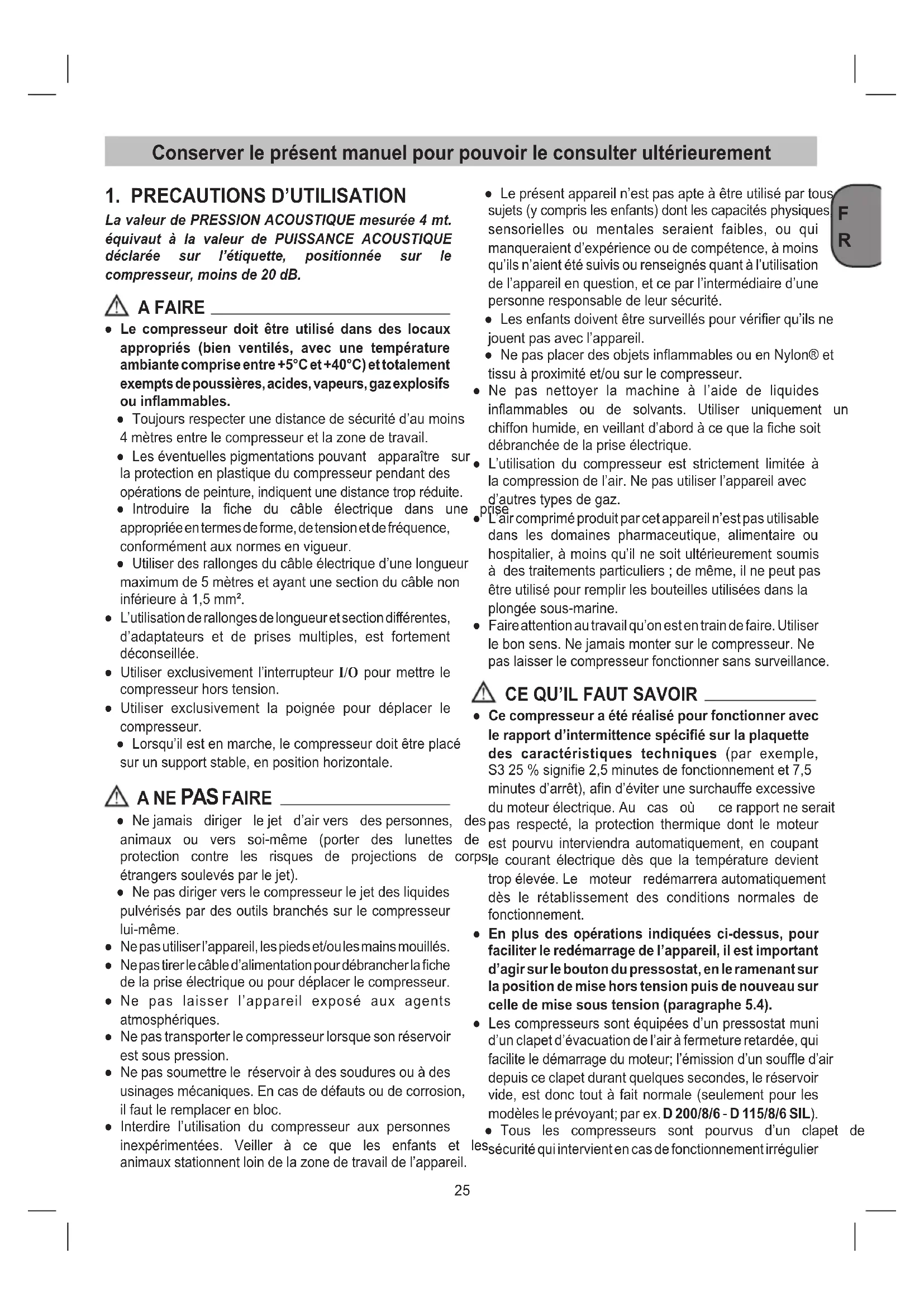 ● Ce compresseur a été réalisé pour fonctionner avec le rapport d’intermittence spécié sur la plaquette des caractéristiques techniques (par exemple, S325%signie2,5minutesdefonctionnementet7,5 minutesd’arrêt),and’éviterunesurchauffeexcessive dumoteurélectrique.Au cas où cerapportneserait pas respecté, la protection thermique dont le moteur est pourvu interviendra automatiquement, en coupant le courant électrique dès que la température devient tropélevée.Le moteur redémarreraautomatiquement dès le rétablissement des conditions normales de fonctionnement. ● En plus des opérations indiquées ci-dessus, pour faciliter le redémarrage de l’appareil, il est important d’agir sur le bouton du pressostat, en le ramenant sur la position de mise hors tension puis de nouveau sur celle de mise sous tension (paragraphe 5.4). ● Les compresseurs sont équipées d’un pressostat muni d’un clapet d’évacuation de l’air à fermeture retardée, qui faciliteledémarragedumoteur;l’émissiond’unsoufed’air depuis ce clapet durant quelques secondes, le réservoir vide, est donc tout à fait normale (seulement pour les modèlesleprévoyant;parex.D 200/8/6 - D 115/8/6 SIL). ● Tous les compresseurs sont pourvus d’un clapet de sécurité qui intervient en cas de fonctionnement irrégulier Conserver le présent manuel pour pouvoir le consulter ultérieurementF