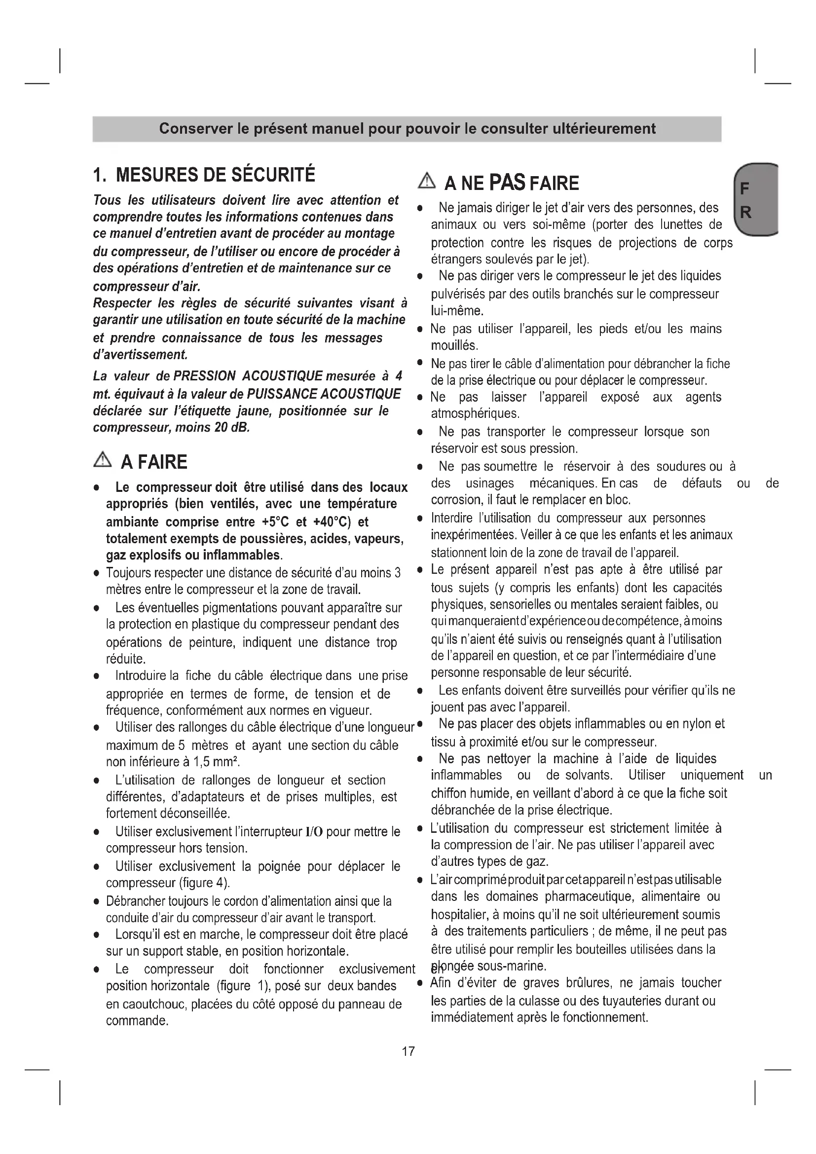 Tous les utilisateurs doivent lire avec attention et comprendre toutes les informations contenues dans ce manuel d’entretien avant de procéder au montage du compresseur, de l’utiliser ou encore de procéder à des opérations d’entretien et de maintenance sur ce compresseur d’air. Respecter les règles de sécurité suivantes visant à garantir une utilisation en toute sécurité de la machine et prendre connaissance de tous les messages d’avertissement. La valeur de PRESSION ACOUSTIQUE mesurée à 4 mt. équivaut à la valeur de PUISSANCE ACOUSTIQUE déclarée sur l’étiquette jaune, positionnée sur le compresseur, moins 20 dB. A FAIRE ● Le compresseur doit être utilisé dans des locaux appropriés (bien ventilés, avec une température ambiante comprise entre +5°C et +40°C) et totalement exempts de poussières, acides, vapeurs, gaz explosifs ou inflammables.