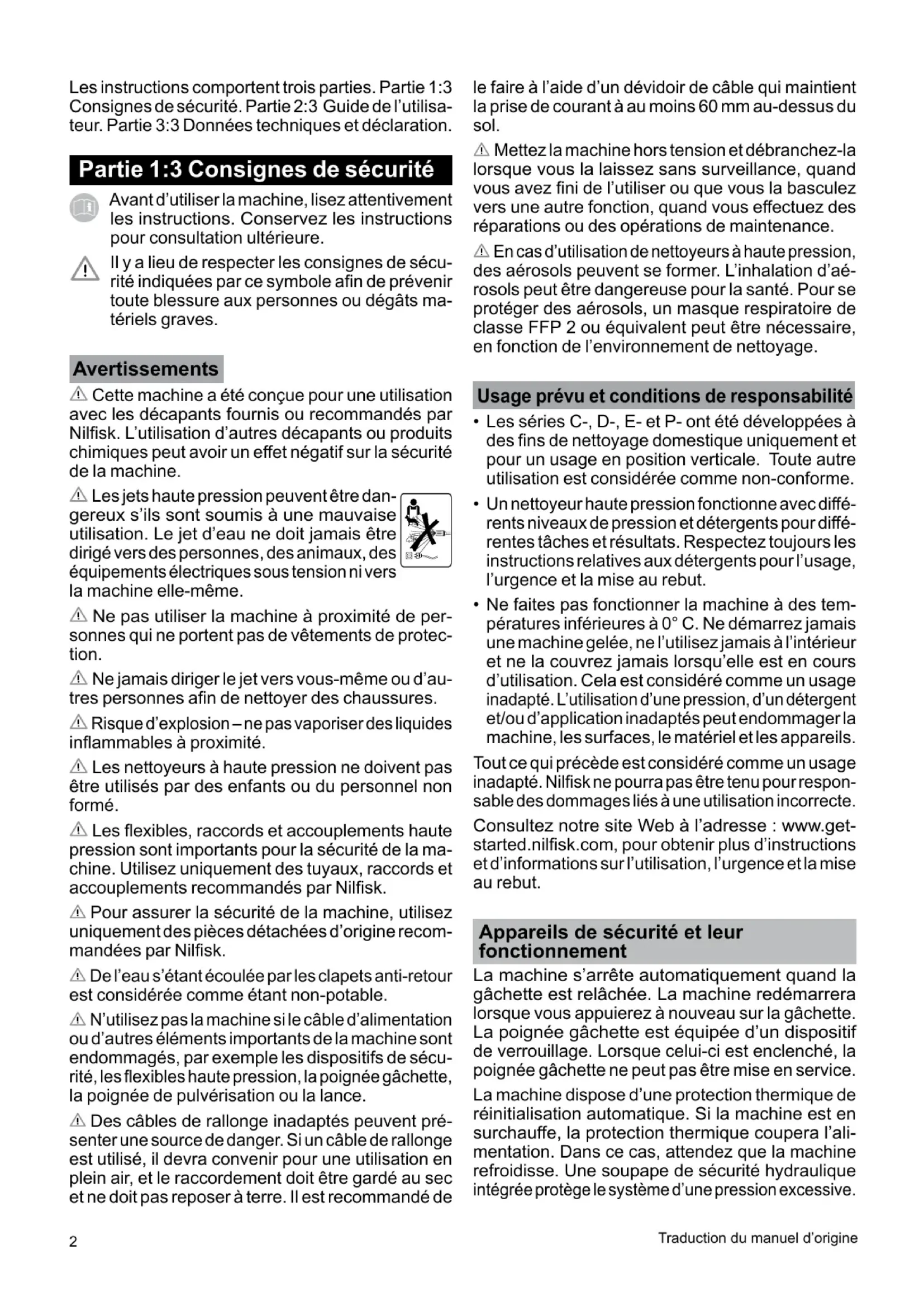 Avant d’utiliser la machine, lisez attentivement les instructions. Conservez les instructions pour consultation ultérieure. Il y a lieu de respecter les consignes de sécu- rité indiquées par ce symbole an de prévenir toute blessure aux personnes ou dégâts ma- tériels graves. Avertissements Cette machine a été conçue pour une utilisation avec les décapants fournis ou recommandés par Nilsk. L’utilisation d’autres décapants ou produits chimiques peut avoir un eet négatif sur la sécurité de la machine. Les jets haute pression peuvent être dan- gereux s’ils sont soumis à une mauvaise utilisation. Le jet d’eau ne doit jamais être dirigé vers des personnes, des animaux, des équipements électriques sous tension ni vers la machine elle-même. Ne pas utiliser la machine à proximité de per- sonnes qui ne portent pas de vêtements de protec- tion. Ne jamais diriger le jet vers vous-même ou d’au- tres personnes an de nettoyer des chaussures. Risque d’explosion – ne pas vaporiser des liquides inammables à proximité. Les nettoyeurs à haute pression ne doivent pas être utilisés par des enfants ou du personnel non formé. Les exibles, raccords et accouplements haute pression sont importants pour la sécurité de la ma- chine. Utilisez uniquement des tuyaux, raccords et accouplements recommandés par Nilsk. Pour assurer la sécurité de la machine, utilisez uniquement des pièces détachées d’origine recom- mandées par Nilsk. De l’eau s’étant écoulée par les clapets anti-retour est considérée comme étant non-potable. N’utilisez pas la machine si le câble d’alimentation ou d’autres éléments importants de la machine sont endommagés, par exemple les dispositifs de sécu- rité, les exibles haute pression, la poignée gâchette, la poignée de pulvérisation ou la lance. Des câbles de rallonge inadaptés peuvent pré- senter une source de dange r. Si un câble de rallonge est utilisé, il devra convenir pour une utilisation en plein air, et le raccordement doit être gardé au sec et ne doit pas reposer à terre. Il est recommandé de le faire à l’aide d’un dévidoir de câble qui maintient la prise de courant à au moins 60 mm au-dessus du sol. Mettez la machine hors tension et débranchez-la lorsque vous la laissez sans surveillance, quand vous avez ni de l’utiliser ou que vous la basculez vers une autre fonction, quand vous eectuez des réparations ou des opérations de maintenance. En cas d’utilisation de nettoyeurs à haute pression, des aérosols peuvent se former. L’inhalation d’aé- rosols peut être dangereuse pour la santé. Pour se protéger des aérosols, un masque respiratoire de classe FFP 2 ou équivalent peut être nécessaire, en fonction de l’environnement de nettoyage. Usage prévu et conditions de responsabilité