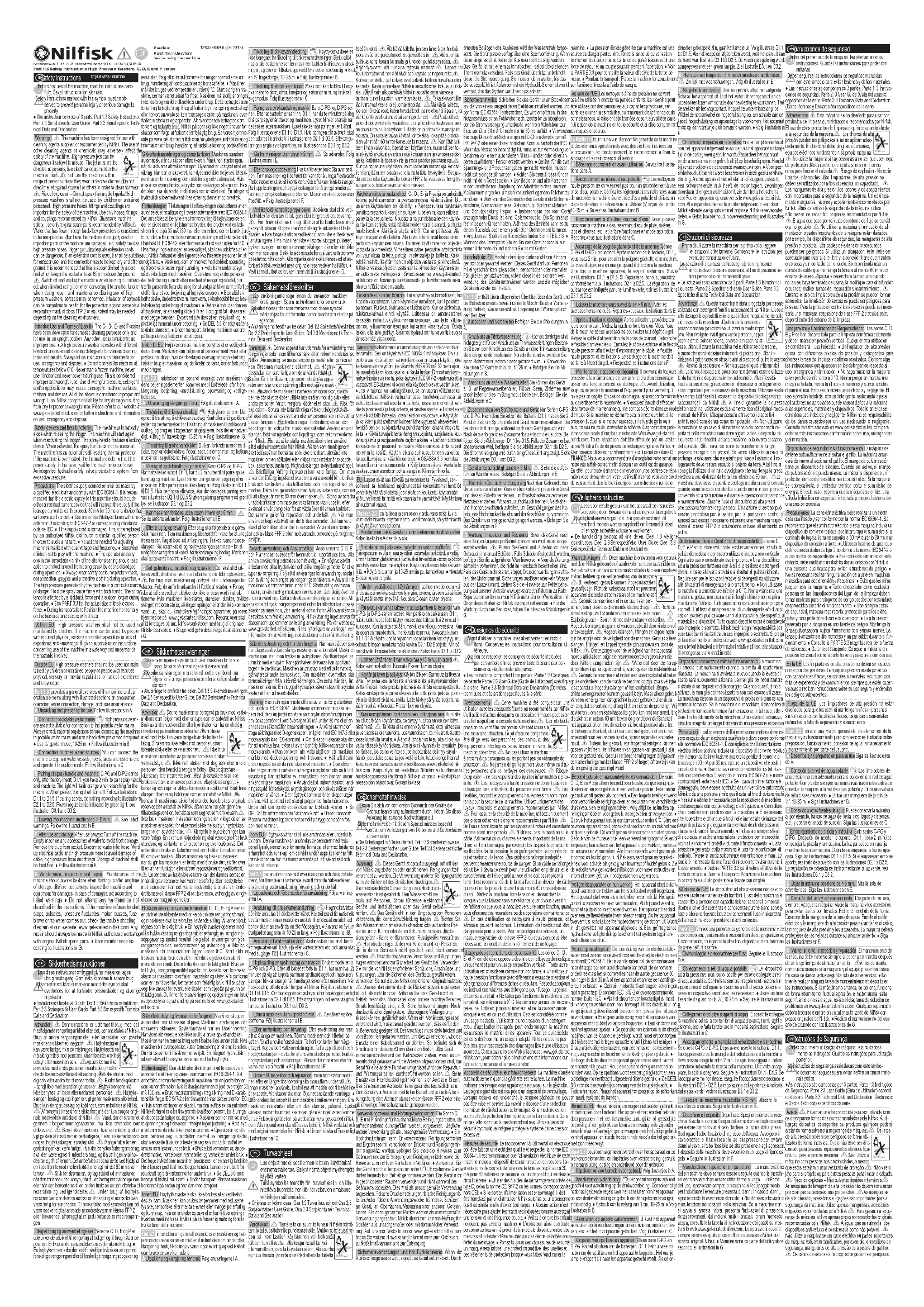 Consignes de sécurité Avant d’utiliser la machine, lisez attentivement les instruc- tions. Conservez les instructions pour consultation ul- térieure. Il y a lieu de respecter les consignes de sécurité indiquées par ce symbole an de prévenir toute blessure aux per- sonnes ou dégâts matériels graves. ● Les instructions comportent trois parties. Partie 1:3 Consignes de sécurité Partie 2:3 User Guide (Guide de l’utilisateur) spécique à la série. Partie 3:3 Technical Data and Declaration (Données techniques et déclaration) spéciques à la série. Avertissements Cette machine a été conçue pour une utilisation avec les décapants fournis ou recommandés par Nilsk. L’utilisation d’autres décapants ou produits chimiques peut avoir un effet négatif sur la sécurité de la machine. Les jets haute pression peuvent être dangereux s’ils sont soumis à une mauvaise utilisation. Le jet d’eau ne doit jamais être dirigé vers des personnes, des animaux, des équipements électriques sous tension ni vers la machine elle-même. Ne pas utiliser la machine à proximité de personnes qui ne portent pas de vêtements de protection. Ne jamais diriger le jet vers vous-même ou d’au- tres personnes an de nettoyer des chaussures. Risque d’explosion – ne pas vaporiser des liquides inammables à prox- imité. Les nettoyeurs à haute pression ne doivent pas être utilisés par des enfants ou du personnel non formé. Les exibles, raccords et accouplements haute pression sont impor- tants pour la sécurité de la machine. Utilisez uniquement des tuyaux, raccords et accouplements recommandés par Nilsk. Pour assurer la sécurité de la machine, utilisez uniquement des pièces détachées d’origine recommandées par Nilsk. De l’eau s’étant écoulée par les clapets anti-retour est considérée comme étant non-potable. N’utilisez pas la machine si le câble d’alimentation ou d’autres éléments importants de la ma- chine sont endommagés, par exemple les dispositifs de sécurité, les exibles haute pression, la poignée gâchette, la poignée de pulvérisation ou la lance. Des câbles de rallonge inadaptés peuvent présenter une source de dange r. Si un câble de rallonge est utilisé, il devra convenir pour une utilisation en plein air, et le raccordement doit être gardé au sec et ne doit pas reposer à terre. Il est recommandé de le faire à l’aide d’un dévidoir de câble qui maintient la prise de courant à au moins 60 mm au-dessus du sol. Mettez la machine hors tension et débranchez-la lorsque vous la laissez sans surveillance, quand vous avez ni de l’utiliser ou que vous la basculez vers une autre fonction, quand vous effectuez des réparations ou des opérations de maintenance. En cas d’utilisation de nettoyeurs à haute pression, des aérosols peuvent se former. L’inhalation d’aérosols peut être dangereuse pour la santé. Pour se protéger des aérosols, un masque respiratoire de classe FFP 2 ou équivalent peut être nécessaire, en fonction de l’environnement de nettoyage. Usage prévu et conditions de responsabilité Les séries C-, D-, E- et P- ont été développées à des ns de nettoyage domestique uniquement et pour un usage en position verticale. Toute autre utilisation est considérée comme non-conforme. ● Un nettoyeur haute pression fonctionne avec différents niveaux de pression et détergents pour différentes tâches et résultats. Respectez toujours les instructions relatives aux détergents pour l’usage, l’urgence et la mise au rebut. ● Ne faites pas fonctionner la machine à des températures inférieures à 0° C. Ne démarrez jamais une machine gelée, ne l’utilisez jamais à l’intérieur et ne la couvrez jamais lorsqu’elle est en cours d’utilisation. Cela est considéré comme un usage inadapté. L’utilisation d’une pression, d’un détergent et/ou d’application inadaptés peut endommager la machine, les surfaces, le matériel et les appareils. Tout ce qui précède est considéré comme un usage inadapté. Nilsk ne pourra pas être tenu pour responsable des dommages liés à une utilisation incorrecte. Consultez notre site Web à l’adresse : www.get-started. nilsk.com, pour obtenir plus d’instructions et d’informations sur l’utilisation, l’urgence et la mise au rebut. Appareils de sécurité et leur fonctionnement La machine s’arrête automa tiquement quand la gâchette est relâchée. La machine redémarrera lorsque vous appuierez à nouveau sur la gâchette. La poignée gâchette est équipée d’un dispositif de verrouillage. Lorsque celui-ci est enclenché, la poignée gâchette ne peut pas être mise en service. La machine dispose d’une protection thermique de réinitialisation automatique. Si la machine est en surchauffe, la protection thermique coupera l’alimentation. Dans ce cas, attendez que la machine refroidisse. Une soupape de sécurité hydraulique intégrée protège le système d’une pression excessive. Mesures de sécurité Le raccordement à l’alimentation électrique doit être fait par un électricien qualié et respecter la norme IEC 60364-1. Il est recommandé que l’alimentation électrique de cette machine inclue un dispositif de courant résiduel qui coupera l’al- imentation si le courant de fuite vers la terre est supérieur à 30 mA pour 30 millièmes de seconde, ou un dispositif qui vériera le circuit de terre. ● Utiliser des fusibles de démarrage/temporisés de type D, selon la norme CEI 947-2 ou les normes correspondantes hors CEI. ● Si le cordon d’alimentation est endommagé, il doit être remplacé par un distributeur Nilsk autorisé ou une personne qualiée similaire an d’éviter tout risque. ● Aucune action n’est nécessaire pour ajuster les machines indiquées comme acceptant une tension et une fréquence double. ● Veillez à ce que les enfants ne jouent pas avec la machine. ● L’opérateur ainsi que toute personne s