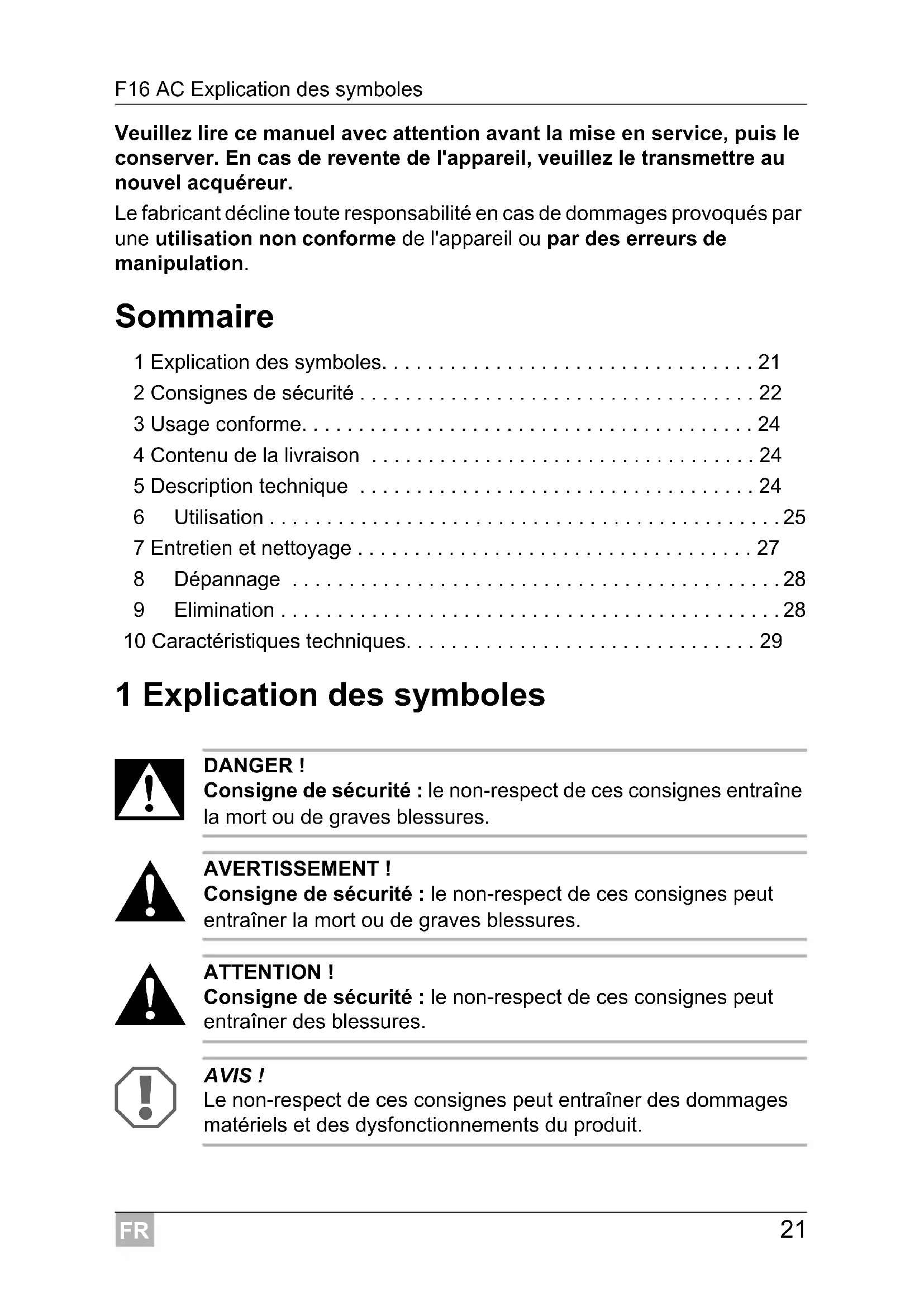Le fabricant décline toute responsabilité en cas de dommages provoqués par une utilisation non conforme de l'appareil ou par des erreurs de manipulation.