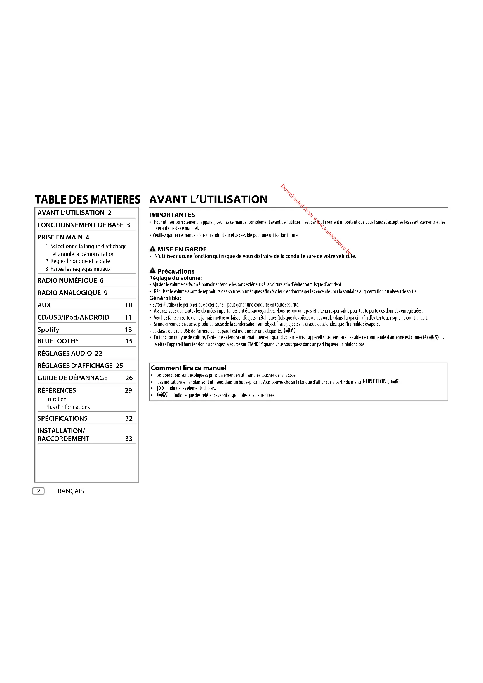 Pour des raison de sécurité, laissez le travail de câblage et de montage des professionnels. Consultez votre revendeur autoradio.