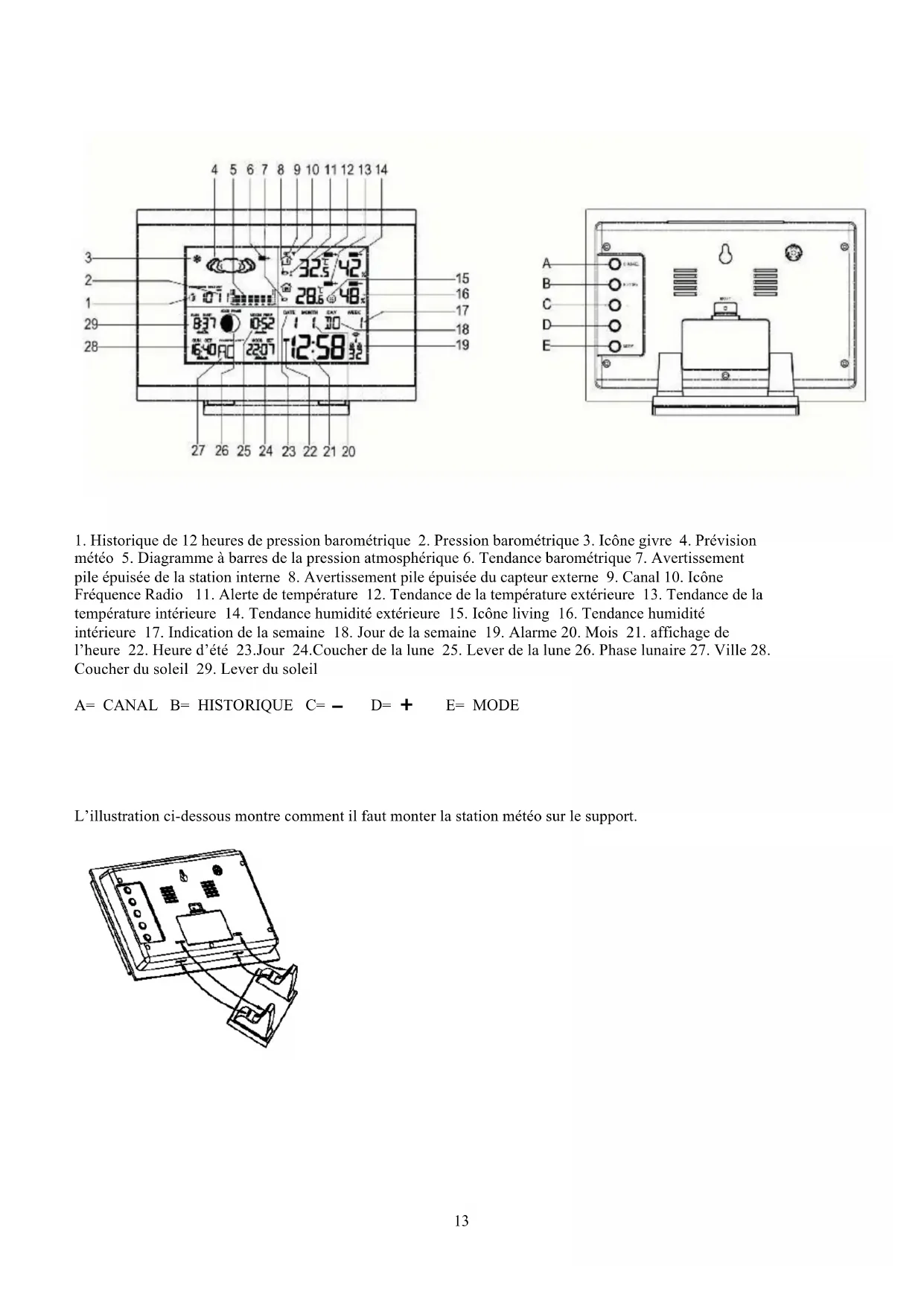 A B C D E- Historique de 12 heures de pression barométrique 2. Pression barométrique 3. Icône givre 4. Prévision météo 5. Diagramme à barres de la pression atmosphérique 6. Tendance barométrique 7. Avertissement pile épuisée de la station interne 8. Avertissement pile épuisée du capteur externe 9. Canal 10. Icône Fréquence Radio 11. Alerte de température 12. Tendance de la température extérieure 13. Tendance de la température intérieure 14. Tendance humidité extérieure 15. Icône living 16. Tendance humidité intérieure 17. Indication de la semaine 18. Jour de la semaine 19. Alarme 20. Mois 21. affichage de l'heure 22. Heure d'été 23. Jour 24. Coucher de la lune 25. Lever de la lune 26. Phase lunaire 27. Ville 28. Coucher du soleil 29. Lever du soleil
