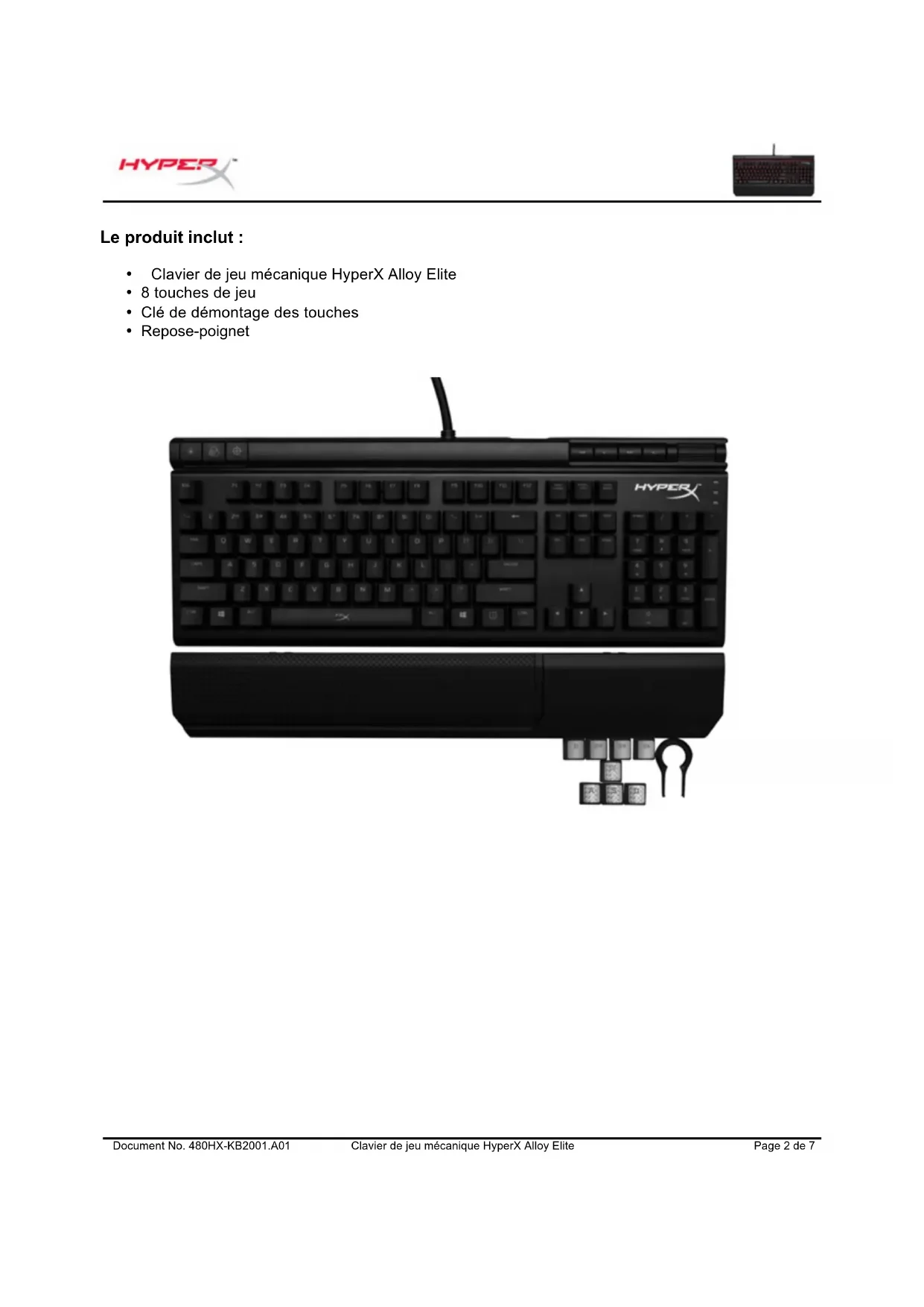 A- Bouton de contrôle de la luminosité B- Bouton de sélection du mode LED C- Bouton du mode Jeu D- Port USB arrière (transfert USB 2.0) E- Boutons de contrôle Multimédia F- Bouton de désactivation du volume G- Roulette de réglage du volume H- Témoins lumineux : mode Jeu / Verrouillage du clavier numérique / Verrouillage de la touche Majuscule I- Repose-poignet amovibleDocument No. 480HX-KB2001.A01 Clavier de jeu mécanique HyperX Alloy Elite Page 4 de 7