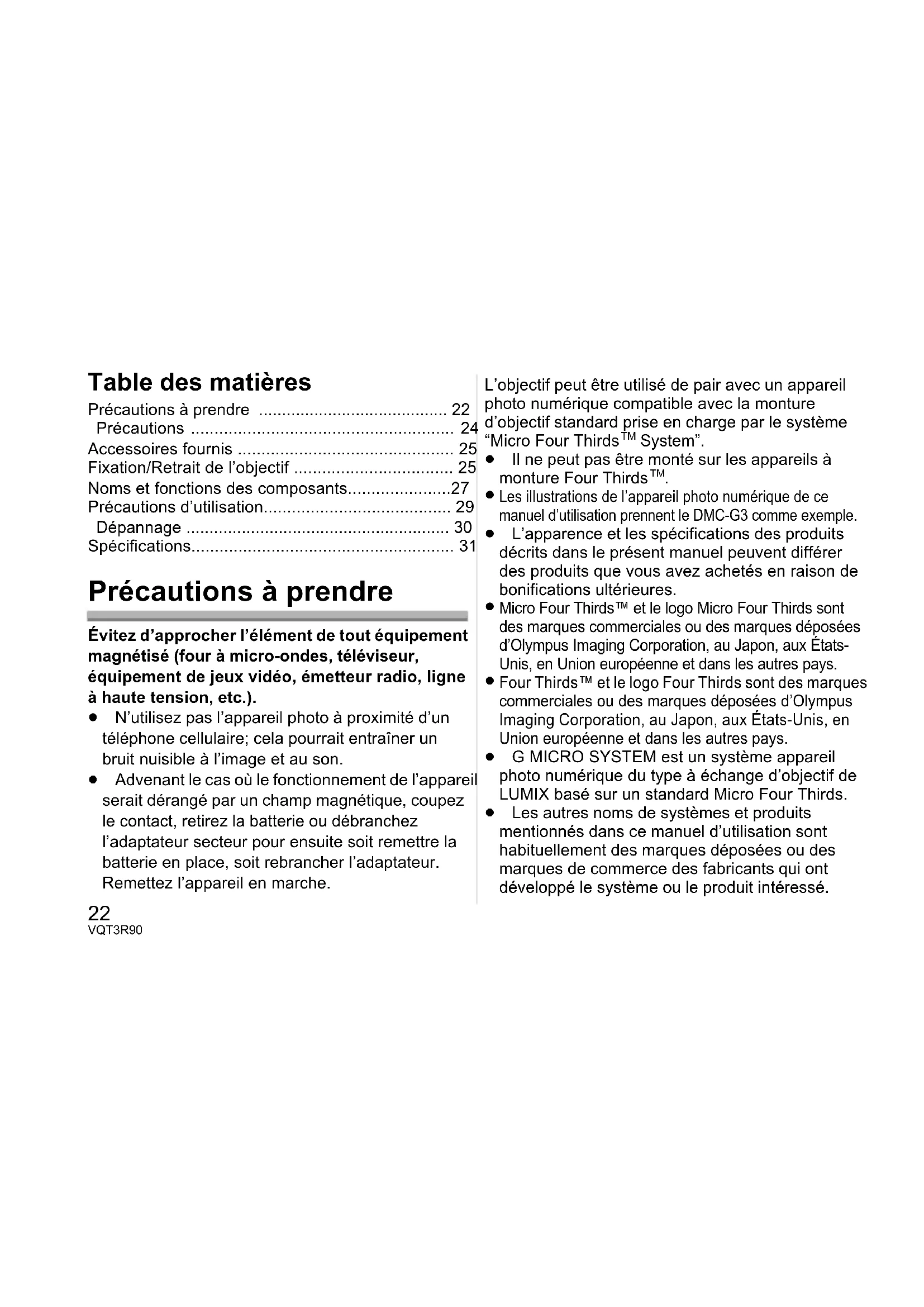 - Spécifications Précautions à prendre Évitez d’approcher l’élément de tout équipement magnétisé (four à micro-ondes, téléviseur, équipement de jeux vidéo, émetteur radio, ligne à haute tension, etc.). ≥ N’utilisez pas l’appareil photo à proximité d’un téléphone cellulaire; cela pourrait entraîner un bruit nuisible à l’image et au son. ≥ Advenant le cas où le fonctionnement de l’appareil serait dérangé par un champ magnétique, coupez le contact, retirez la batterie ou débranchez l’adaptateur secteur pour ensuite soit remettre la batterie en place, soit rebrancher l’adaptateur. Remettez l’appareil en marche. L’objectif peut être utilisé de pair avec un appareil photo numérique compatible avec la monture d’objectif standard prise en charge par le système “Micro Four Thirds p. 31