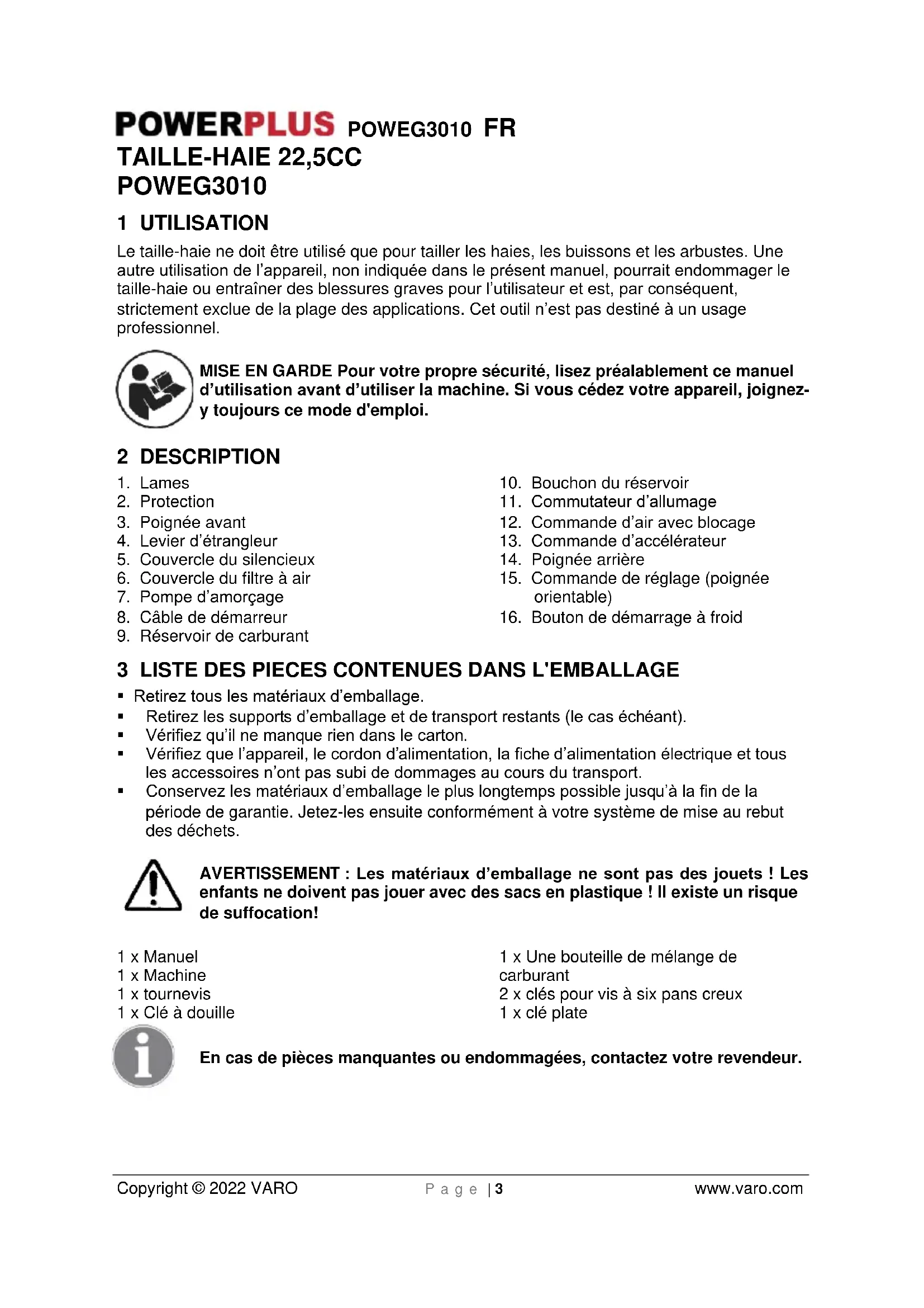Copyright © 2022 VARO P a g e | 3 www.varo.com TAILLE-HAIE 22,5CC POWEG3010 1 UTILISATION Le taille-haie ne doit être utilisé que pour tailler les haies, les buissons et les arbustes. Une autre utilisation de l’appareil, non indiquée dans le présent manuel, pourrait endommager le taille-haie ou entraîner des blessures graves pour l’utilisateur et est, par conséquent, strictement exclue de la plage des applications. Cet outil n’est pas destiné à un usage professionnel. MISE EN GARDE Pour votre propre sécurité, lisez préalablement ce manuel d’utilisation avant d’utiliser la machine. Si vous cédez votre appareil, joignez- y toujours ce mode d'emploi. 2 DESCRIPTION
