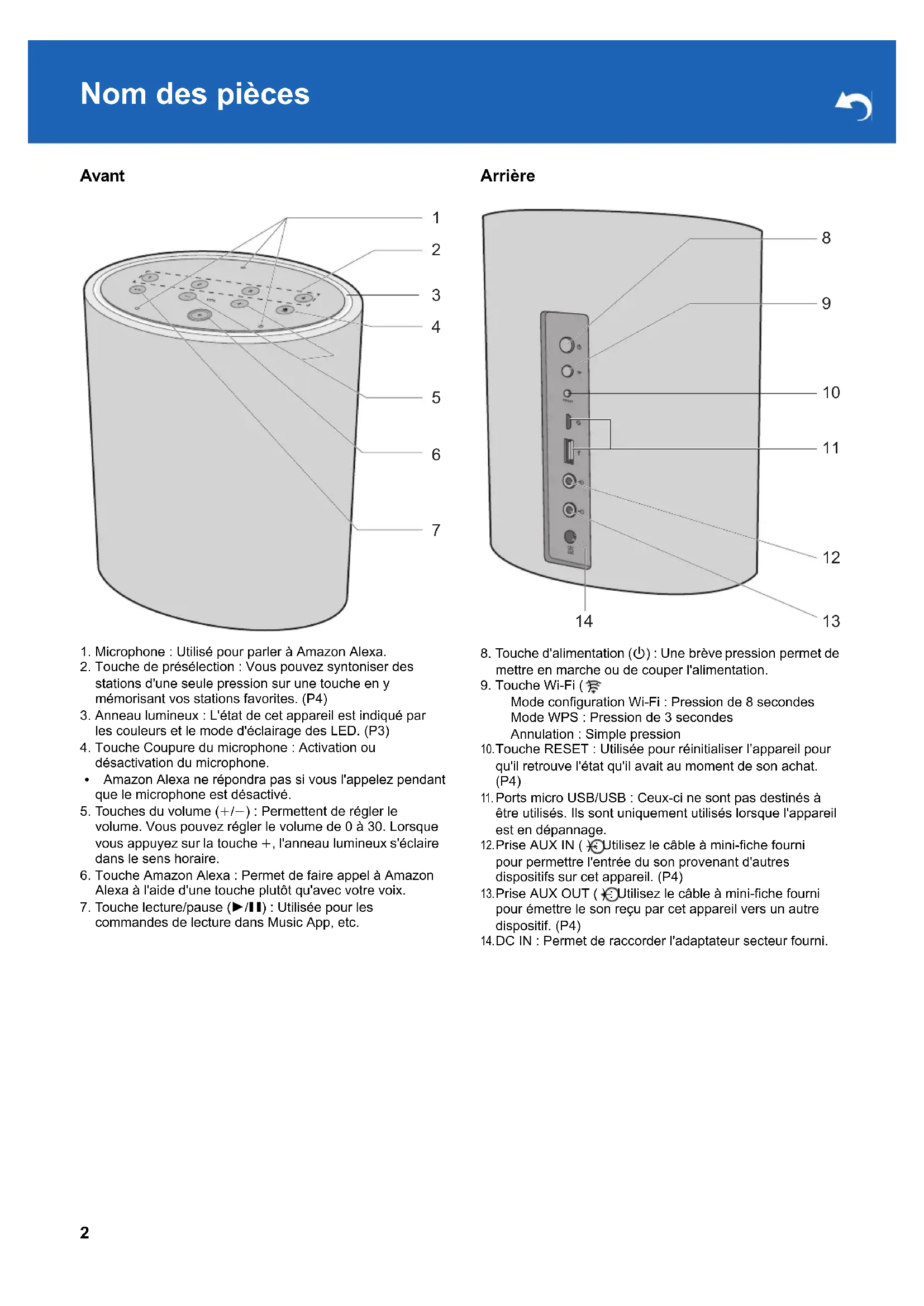 enregistrez-le avec Amazon Alexa. Inscrivez-vous avec votre compte Amazon et enregistrez cet appareil. 0 Vous pouvez également vous enregistrer avec Amazon Alexa ultérieurement. Touchez " " sur l'écran Home de l'appli, sélectionnez "Amazon Alexa" et enregistrez cet appareil. 0 Consultez "Utilisation de Amazon Alexa" (P4) pour savoir comment utiliser Amazon Alexa. Vérification de l'état de cet appareil Le mode d'éclairage et de clignotement de l'anneau lumineux situé sur cet appareil vous permet de connaitre l'état de l'appareil. Music Control L'anneau lumineux devient bleu et une lumière plus vive tourne autour de celui-ci. Démarrage Tout éteint En veille L'anneau lumineux est orange et tourne Connecté par Wi-Fi Éclairage blanc Réglage du volume MusicControlPlay-Fi MusicControlPlay-Fi4 Actionner l'appareil Utilisation de Amazon Alexa Mettez-vous face à l'appareil et dites "Alexa" ou appuyez sur la touche Amazon Alexa pour faire appel à Amazon Alexa Voice Service. Une fois que vous avez parlé à l'appareil et qu'Alexa a compris la question, l'anneau lumineux devient bleu et un point plus fortement éclairé tourne sur l'anneau. Alexa répond à la question au bout de quelques instants. 0 Alexa ne répondra pas si le microphone est désactivé même si vous l'appelez. Mémorisation d'une station Vous pouvez mémoriser jusqu'à 4 de vos stations de radio favorites. Vous pouvez appeler des stations en appuyant sur une touche en les y mémorisant. Effectuez la procédure suivante lorsque l'appareil est en marche.