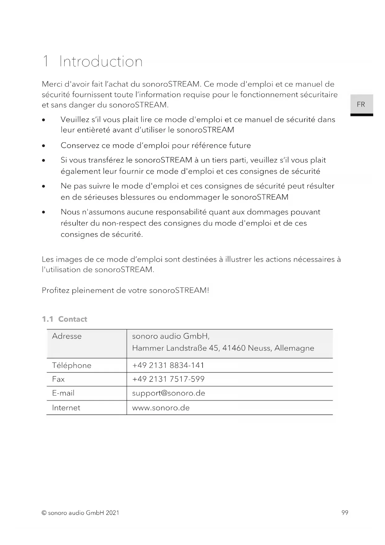 Merci d'avoir fait l'achat du sonoroSTREAM. Ce mode d'emploi et ce manuel de sécurité fournissant toute l'information requise pour le fonctionnement sécurité et sans danger du sonoroSTREAM.