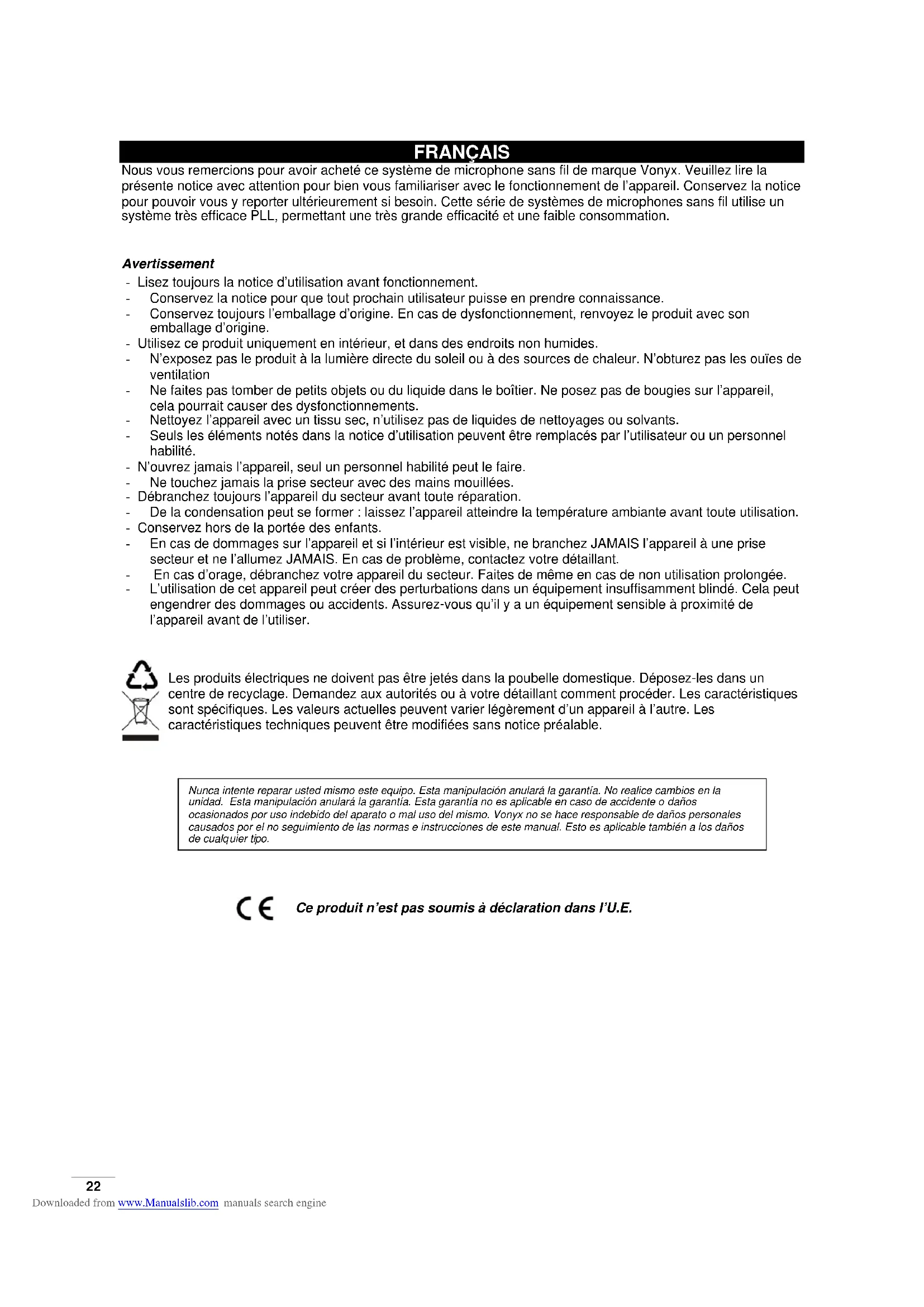 Downloaded from www.Manualslib.com manuals search engine22 FRANÇAIS Nous vous remercions pour avoir acheté ce système de microphone sans fil de marque Vonyx. Veuillez lire la présente notice avec attention pour bien vous familiariser avec le fonctionnement de l’appareil. Conservez la notice pour pouvoir vous y reporter ultérieurement si besoin. Cette série de systèmes de microphones sans fil utilise un système très efficace PLL, permettant une très grande efficacité et une faible consommation. Avertissement - Lisez toujours la notice d’utilisation avant fonctionnement. - Conservez la notice pour que tout prochain utilisateur puisse en prendre connaissance. - Conservez toujours l’emballage d’origine. En cas de dysfonctionnement, renvoyez le produit avec son emballage d’origine. - Utilisez ce produit uniquement en intérieur, et dans des endroits non humides. - N’exposez pas le produit à la lumière directe du soleil ou à des sources de chaleur. N’obturez pas les ouïes de ventilation - Ne faites pas tomber de petits objets ou du liquide dans le boîtier. Ne posez pas de bougies sur l’appareil, cela pourrait causer des dysfonctionnements. - Nettoyez l’appareil avec un tissu sec, n’utilisez pas de liquides de nettoyages ou solvants. - Seuls les éléments notés dans la notice d’utilisation peuvent être remplacés par l’utilisateur ou un personnel habilité. - N’ouvrez jamais l’appareil, seul un personnel habilité peut le faire. - Ne touchez jamais la prise secteur avec des mains mouillées. - Débranchez toujours l’appareil du secteur avant toute réparation. - De la condensation peut se former : laissez l’appareil atteindre la température ambiante avant toute utilisation. - Conservez hors de la portée des enfants. - En cas de dommages sur l’appareil et si l’intérieur est visible, ne branchez JAMAIS l’appareil à une prise secteur et ne l’allumez JAMAIS. En cas de problème, contactez votre détaillant. - En cas d’orage, débranchez votre appareil du secteur. Faites de même en cas de non utilisation prolongée. - L’utilisation de cet appareil peut créer des perturbations dans un équipement insuffisamment blindé. Cela peut engendrer des dommages ou accidents. Assurez-vous qu’il y a un équipement sensible à proximité de l’appareil avant de l’utiliser.