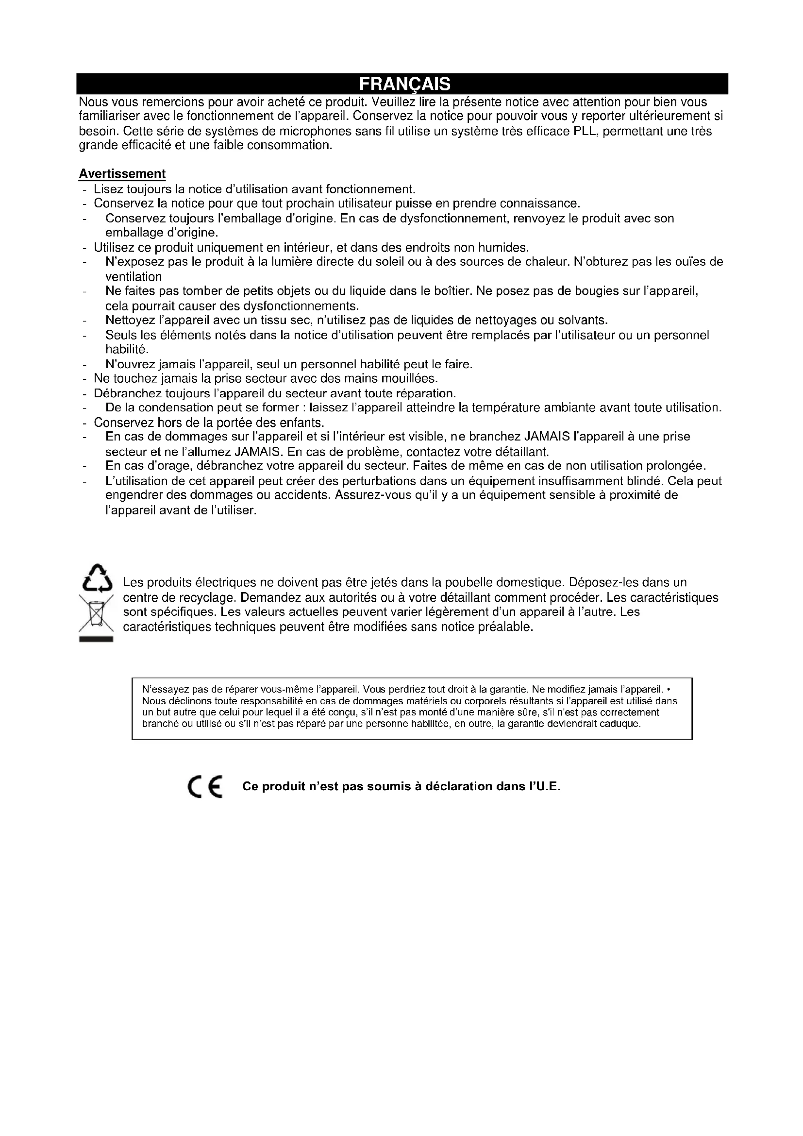 The specifications are typical. The actual values can slightly change from one unit to the other. Specifications can be changed without prior notice.SOLUCION DE PROBLEMAS PROBLEMA INDICADO SOLUCION Sin sonido Indicador de transmisor rojo, no parpadea Deslice interruptor POWER ON / OFF en la posición ON. Asegúrese de que la batería se ha insertado correctamente, la observación de la batería (+ / -). Si la batería se ha insertado correctamente, reemplace con baterías nuevas. Sin sonido Indicador de transmisor rojo, parpadea Deslice botón MUTE / ON en la posición ON. Sin sonido Indicador de POWER rojo, apagado Asegúrese de que el adaptador de CA esté conectado adecuadamente a una toma de corriente y al conector de entrada de CC. Sin sonido Indicadores de señal de las luces A / B del receptor brillan Suba el control de volumen del receptor. Confirme que las conexiones de salida desde el receptor al equipo externo son seguras. Sin sonido Luces de los indicadores de señal del receptor A / B apagadas. Luz de POWER del emisor y del receptor brillan intensamente. Confirme que coinciden las frequencias de los transmisores t receptors. Mueva el transmisor más cerca del receptor. Nivel de sonido es diferente al nivel de un instrumento cableado. Indicadores de señal de las luces A / B del receptor brillan. Ajuste el nivel de ganancia del transmisor para compensar. Ajuste el volumen del receptor según sea necesario. El nivel de distorsión aumenta gradualmente. Indicadores de señal del receptor A / B y luz de BATERIA BAJA del transmisor brillan. Reemplace la pila del transmisor Ráfagas de ruido de otras señales de radio audible presentes. Indicadores de señal A / B / luces encendidas. Identificar las posibles fuentes de interferencias (otras fuentes-RF) y apague, retire o utilice un sistema inalámbrico que opera en una frecuencia diferente. Pérdida momentánea del sonido cuando el emisor se mueve alrededor de la zona de ejecución. Indicador de señal del receptor A / B se apaga cuando se pierde el sonido Vuelva a colocar el receptor y pruebe el sistema de nuevo. Si las pérdidas de sonido persisten, marque los puntos "muertos" y evitelos durante la actuación.FRANÇAIS Nous vous remercions pour avoir acheté ce produit. Veuillez lire la présente notice avec attention pour bien vous familiariser avec le fonctionnement de l’appareil. Conservez la notice pour pouvoir vous y reporter ultérieurement si besoin. Cette série de systèmes de microphones sans fil utilise un système très efficace PLL, permettant une très grande efficacité et une faible consommation. Avertissement - Lisez toujours la notice d’utilisation avant fonctionnement. - Conservez la notice pour que tout prochain utilisateur puisse en prendre connaissance. - Conservez toujours l’emballage d’origine. En cas de dysfonctionnement, renvoyez le produit avec son emballage d’origine. - Utilisez ce produit uniquement en intérieur, et dans des endroits non humides. - N’exposez pas le produit à la lumière directe du soleil ou à des sources de chaleur. N’obturez pas les ouïes de ventilation - Ne faites pas tomber de petits objets ou du liquide dans le boîtier. Ne posez pas de bougies sur l’appareil, cela pourrait causer des dysfonctionnements. - Nettoyez l’appareil avec un tissu sec, n’utilisez pas de liquides de nettoyages ou solvants. - Seuls les éléments notés dans la notice d’utilisation peuvent être remplacés par l’utilisateur ou un personnel habilité. - N’ouvrez jamais l’appareil, seul un personnel habilité peut le faire. - Ne touchez jamais la prise secteur avec des mains mouillées. - Débranchez toujours l’appareil du secteur avant toute réparation. - De la condensation peut se former : laissez l’appareil atteindre la température ambiante avant toute utilisation. - Conservez hors de la portée des enfants. - En cas de dommages sur l’appareil et si l’intérieur est visible, ne branchez JAMAIS l’appareil à une prise secteur et ne l’allumez JAMAIS. En cas de problème, contactez votre détaillant. - En cas d’orage, débranchez votre appareil du secteur. Faites de même en cas de non utilisation prolongée. - L’utilisation de cet appareil peut créer des perturbations dans un équipement insuffisamment blindé. Cela peut engendrer des dommages ou accidents. Assurez-vous qu’il y a un équipement sensible à proximité de l’appareil avant de l’utiliser.