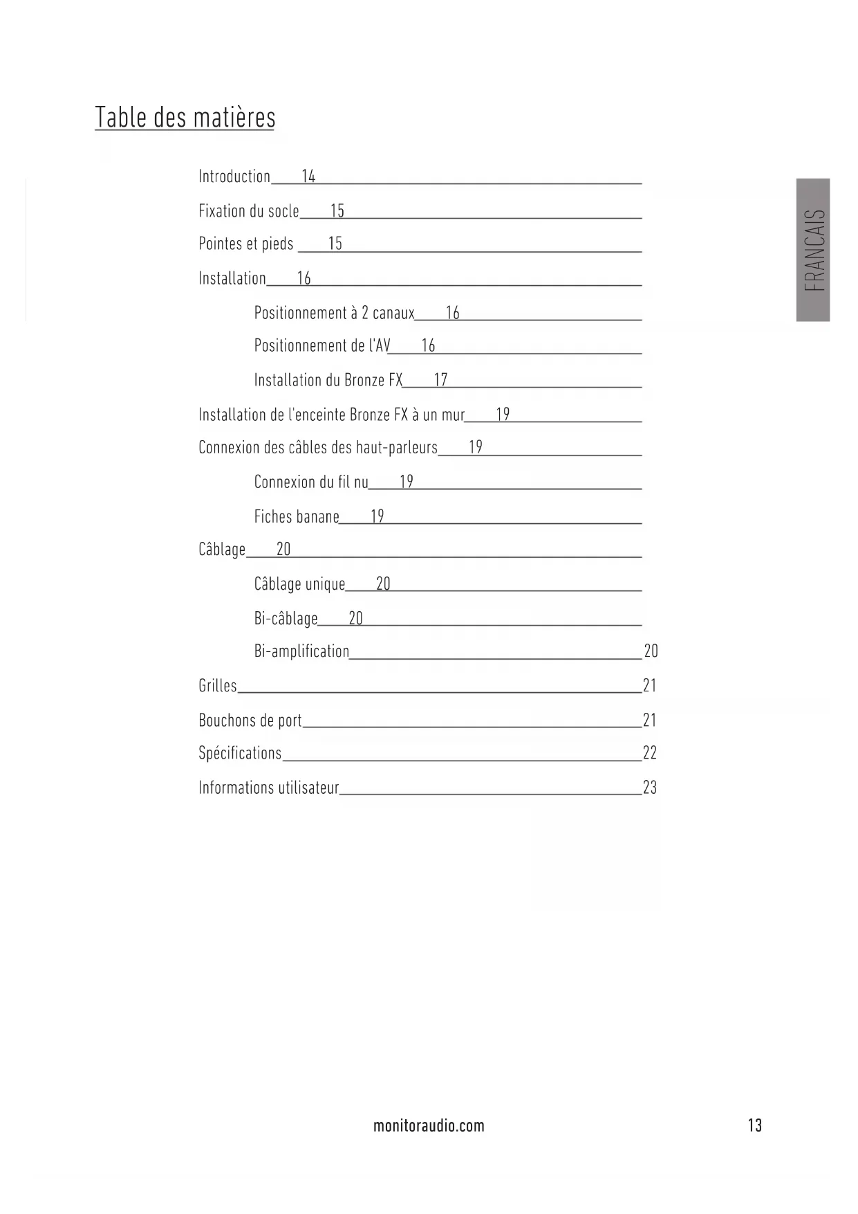 11/16 x 9 1/4 x 13 3/4 Inch N/A N/A Weight (each) 3.5Kg (7lb 12oz) 5.3Kg (11lb 10oz) 11.Kg (24lb 6oz) 16.6Kg (36lb 8oz) 5.6Kg (12lb 6oz) 3.2Kg (7lb) Finishes Black Oak, White Ash, Walnut, RosemahOwner Information Product Details Model Product Serial No Date of Purchase Dealer Details Dealer Name Address e-mail address Telephone Number Monitor Audio reserves the right to alter specications without notice. For the 5 years manufacturer’s warranty please visit the online registration form at: www.monitoraudio.com monitoraudio.com 11 ENGLISHmanuel utilisateur BRONZE SERIES BRONZE 1 BRONZE 2 BRONZE 5 BRONZE 6 BRONZE CENTRE BRONZE FX BRONZE W10 BRONZE SERIES BRONZE 1 BRONZE 2 BRONZE 5 BRONZE 6 BRONZE CENTRE BRONZE FX BRONZE W10 Bronze Series12FRANCAIS Table des matières Introduction 14 Fixation du socle 15 Pointes et pieds 15 Installation 16 Positionnement à 2 canaux 16 Positionnement de l'AV 16 InstallationduBronzeFX 17 Installationdel'enceinteBronzeFXàunmur 19 Connexion des câbles des haut-parleurs 19 Connexiondulnu 19 Fiches banane 19 Câblage 20 Câblage unique 20 Bi-câblage 20 Bi-amplication 20 Grilles 21 Bouchons de port 21 Spécications 22 Informations utilisateur 23 monitoraudio.com 13Bronze Series14 Introduction Nous vous présentons la série Bronze, le système de haut-parleurs le plus abordable de MonitorAudio. Associant les meilleurs éléments de ses prédécesseurs récompensés par la critique aux technologies de pointe de nos séries phares haut de gamme Silver et Platinum, la série Bronze dépasse largement les standards de performance et de qualité des produits considérés comme «entrée de gamme». À l'aide de simulations informatiques très précises ainsi que des matériaux et structures ranés, nous avons amélioré note célèbre gamme BronzeBX pour en faire un nouveau standard du secteur. Le son incroyablement précis et naturellement dynamique de son successeur, la série Bronze, surpasse les capacités de nombreux produits concurrents bien plus onéreux. La série Bronze bénécie de notre quête incessante de la pureté sonore an que vous puissiez proter de vos lms et de votre musique de la meilleure des façons. De plus, le résultat esthétique de la série Bronze est tout simplement stupéant. En parvenant à obtenir une précision et une ecacité optimales à partir d'essais et de mesures complètes, nos équipes internes ont créé un produit proposant une délité sonore incroyable et un look épuré qui représente à la perfection l'état d'esprit de MonitorAudio. Paradoxalement pour une série d'entrée de gamme, la Bronze est véritablement une classe à part. Proposant de sublimes nitions en frêne blanc, en chêne noir, en rosemah ou en noyer et dotés d'une conception précise qui a fait la renommée de la marque MonitorAudio partout dans le monde, les sept modèles de la série Bronze sont du plus bel eet dans n'importe quelle pièce. Cette discrète touche d'élégance cache en réalité une ergonomie sophistiquée comprenant des structures de cabinet à chambres multiples pour des performances de haut-parleurs optimales, des connexions de haute qualité pour une facilité d'utilisation et des transferts de signaux parfaits. De plus, les socles usinés avec précision orent une stabilité parfaite.FRANCAIS monitoraudio.com 15 Fixation du socle (Bronze 5 & 6 uniquement) Les modèles Bronze 5 et 6 sont livrés avec des socles pour une stabilité accrue et une réponse acoustique optimale. Utilisez les boulons fournis pour sécuriser les socles au sol. Avant d'installer le socle au sol, vériez qu'il n'y aucun objet dur ou pointu à cet endroit. Pour installer le socle, retournez le cabinet de façon à ce que le bas de l'enceinte soit dirigé vers le haut. Placez le socle sur le cabinet et alignez les trous de boulon du socle avec les inserts du cabinet. Fixez le socle au cabinet avec les boulons. Serrez-les progressivement puis vériez que le socle est solidement attaché au cabinet. Enfoncez les pieds/pointes dans le socle avant de remettre le haut-parleur sur le sol. Pointes et pieds Les colonnes de la série Bronze sont livrées avec des pointes et des pieds en caoutchouc. Les pointes sont à utiliser sur les sols avec moquette tandis que les pieds en caoutchouc sont à utiliser sur les sols durs sur lesquels les pointes ne sont pas appropriées. Vissez les pointes sur les inserts de letage sur le dessous du socle. Si vous ne souhaitez pas utiliser le socle, vous pouvez xer les pointes directement sur le bas du caisson. Vériez bien qu'aucun câble ne se trouve à l'endroit où vous placerez les haut-parleurs. REMARQUE: Le caisson sera moins stable si vous n'utilisez pas le socle. Sur un sol dur, insérez les pieds en caoutchouc dans les inserts habituellement réservés aux pointes.Bronze Series16 Installation Positionnement à 2 canaux Pour une utilisation dans un système à deux canaux, la position d'écoute et les haut-parleurs doivent former un triangle équilatéral. Les haut-parleurs doivent être situés à environ 1,8 - 3m de distance. Idéalement, ils doivent être placés à 20 - 45cm de l'enceinte arrière et à 1m des murs latéraux. Il est fortement conseillé d'eectuer des essais lorsque vous installez vos haut-parleurs. L'environnement et les préférences personnelles changent en fonction de l'installation. Par exemple, si vous trouvez que les basses ne sont pas assez présentes, rapprochez légèrement les haut-parleurs du mur. Eectuez l'opération inverse si les basses sont trop présentes. Consultez également les informations sur la page 21 concernant les bouchons de port. Si vous perdez l'image stéréo, essayez de les enfoncer très légèrement. Le son doit donner l'impression de partir du point central entre les haut-parleurs et non des haut-parleurs eux-mêmes. Positionnement de l'AV Les illustrations présentées dans les pages suivantes montrent le positionnement optimal ainsi que certains agencements de pièc