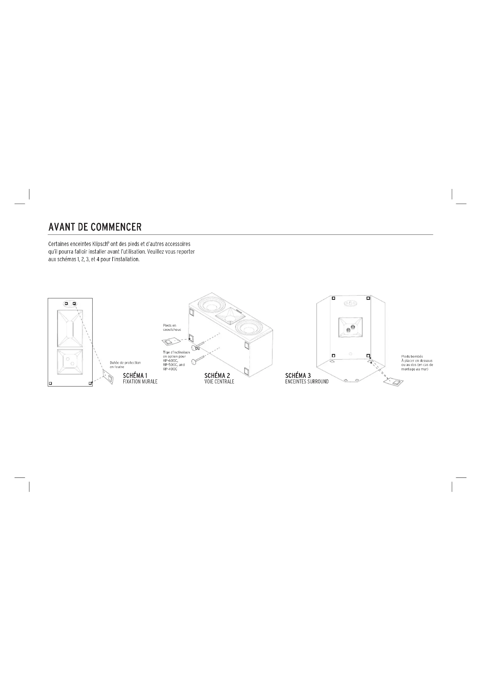 ont des pieds et d’autres accessoires qu’il pourra falloir installer avant l’utilisation. Veuillez vous reporter aux schémas 1, 2, 3, et 4 pour l’installation. SCHÉMA 1 FIXATION MURALE Pieds bombés À placer en dessous ou au dos (en cas de montage au mur) SCHÉMA 2 VOIE CENTRALE SCHÉMA 3 ENCEINTES SURROUND Butée de protection en feutre Pieds en caoutchoucTige d’inclinaison en option pour RP-6DDC, RP-5DDC, and RP-4DDC