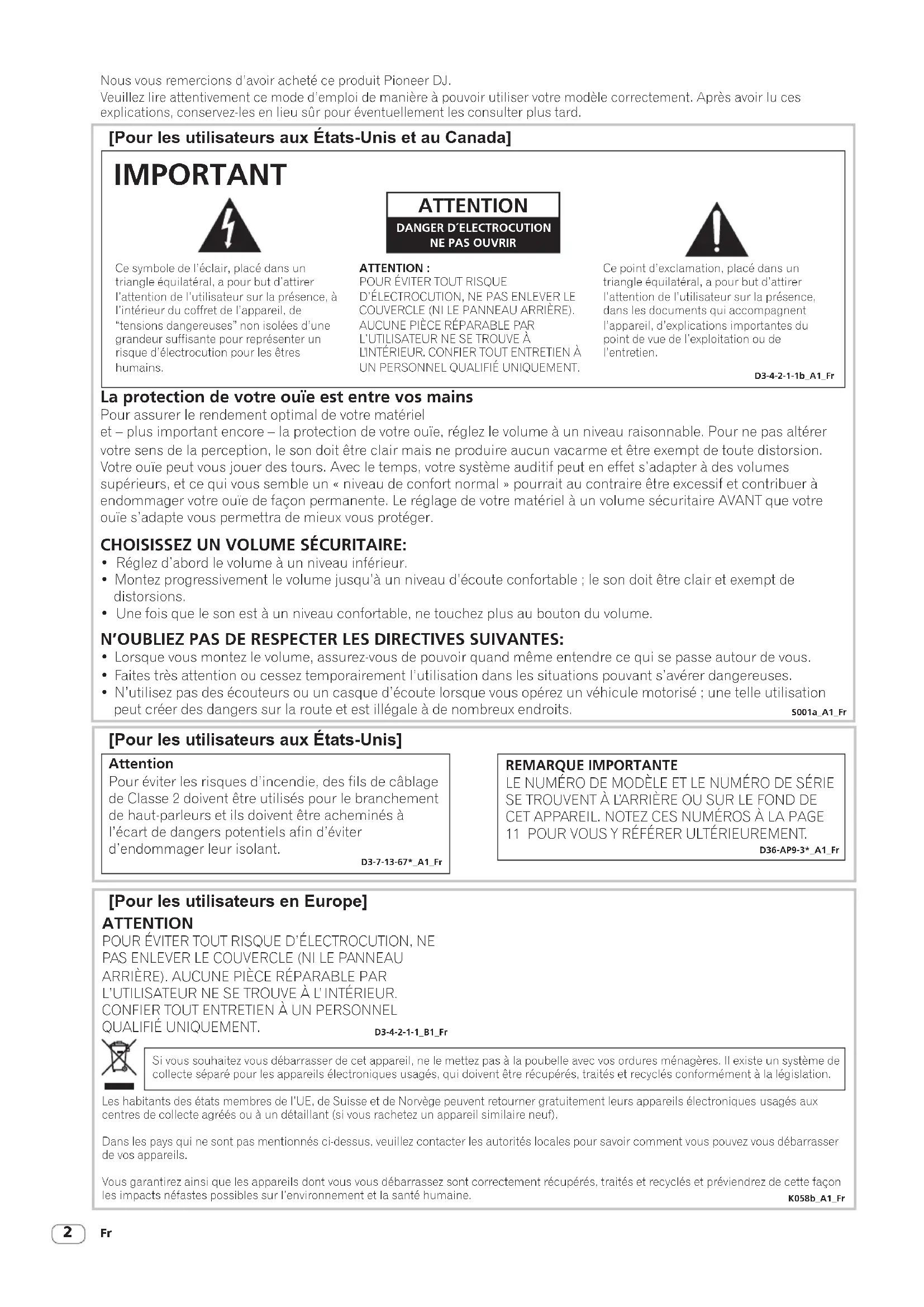 Nous vous remercions d’avoir acheté ce produit Pioneer DJ. Veuillez lire attentivement ce mode d’emploi de manière à pouvoir utiliser votre modèle correctement. Après avoir lu ces explications,conservez-les en lieu sûr pour éventuellement les consulter plus tard. [Pour les utilisateurs en Europe] [Pour les utilisateurs aux États-Unis et au Canada] [Pour les utilisateurs aux États-Unis] Ce point d’exclamation, placé dans un triangle équilatéral, a pour but d’attirer l’attention de l’utilisateur sur la présence, dans les documents qui accompagnent l’appareil, d’explications importantes du point de vue de l’exploitation ou de l’entretien.Ce symbole de l’éclair, placé dans un triangle équilatéral, a pour but d’attirer l’attention de l’utilisateur sur la présence, à l’intérieur du coffret de l’appareil, de “tensions dangereuses” non isolées d’une grandeur suffisante pour représenter un risque d’électrocution pour les êtres humains.ATTENTION :POUR ÉVITER TOUT RISQUE D’ÉLECTROCUTION, NE PAS ENLEVER LE COUVERCLE (NI LE PANNEAU ARRIÈRE). AUCUNE PIÈCE RÉPARABLE PAR L’UTILISATEUR NE SE TROUVE À L’INTÉRIEUR. CONFIER TOUT ENTRETIEN À UN PERSONNEL QUALIFIÉ UNIQUEMENT. ATTENTION