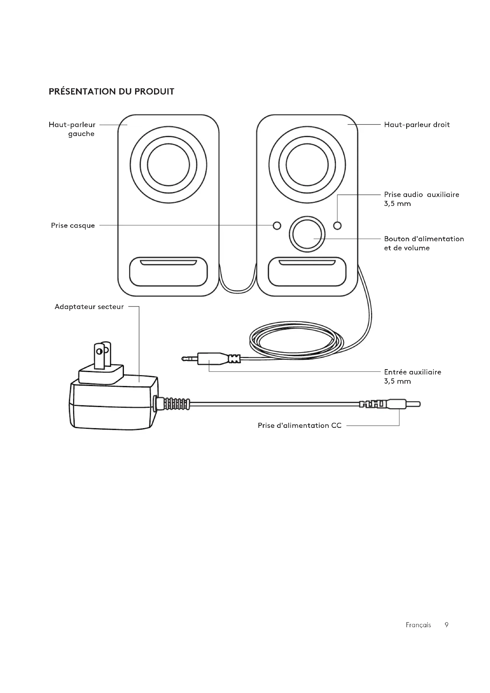 Haut-parleur gauche Prise casque Prise d'alimentation CC Haut-parleur droit Bouton d'alimentation etdevolume Entrée auxiliaire 3,5mm Prise audio auxiliaire 3,5mm Adaptateur secteurFrançais 10