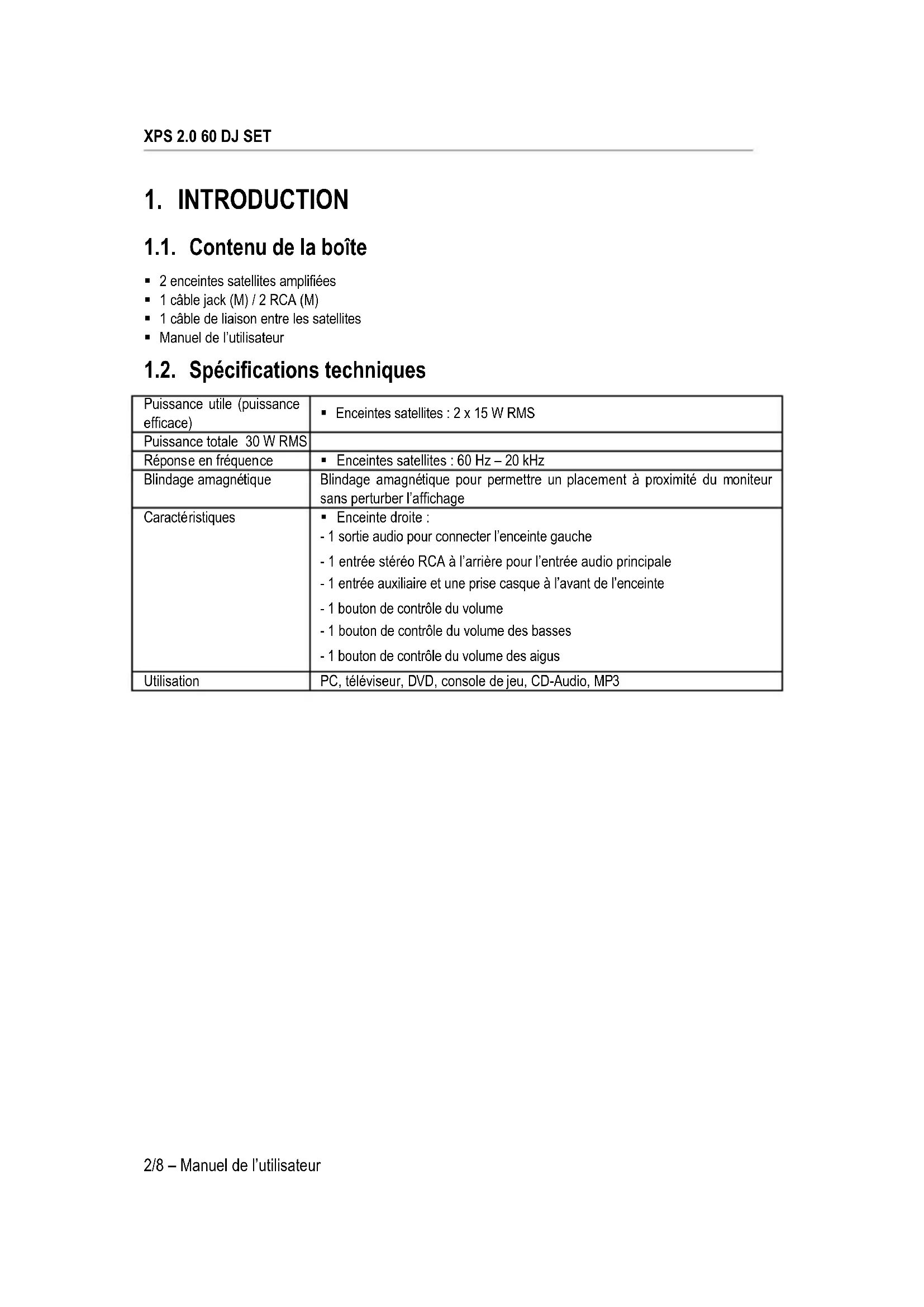 1.1. Contenu de la boîte 2 enceintes satellites amplifiées 1 câble jack (M) / 2 RCA (M) 1 câble de liaison entre les satellites Manuel de l’utilisateur 1.2. Spécifications techniques Puissance utile (puissance efficace) Enceintes satellites : 2 x 15 W RMS Puissance totale 30 W RMS Réponse en fréquence Enceintes satellites : 60 Hz – 20 kHz Blindage amagnétique Blindage amagnétique pour permettre un placement à proximité du moniteur sans perturber l’affichage Caractéristiques Enceinte droite : - 1 sortie audio pour connecter l’enceinte gauche - 1 entrée stéréo RCA à l’arrière pour l’entrée audio principale - 1 entrée auxiliaire et une prise casque à l’avant de l’enceinte - 1 bouton de contrôle du volume - 1 bouton de contrôle du volume des basses - 1 bouton de contrôle du volume des aigus Utilisation PC, téléviseur, DVD, console de jeu, CD-Audio, MP3ESPAÑOL PORTUGUÊS