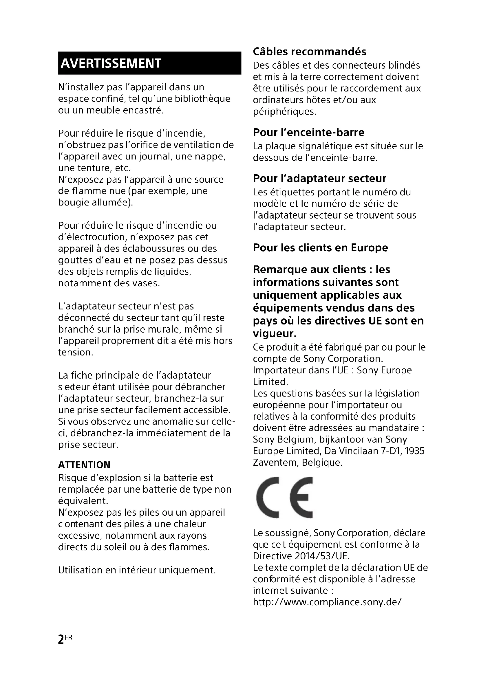 Le soussigné, Sony Corporation, déclare que cet équipement est conforme à la Directive 2014/53/UE.