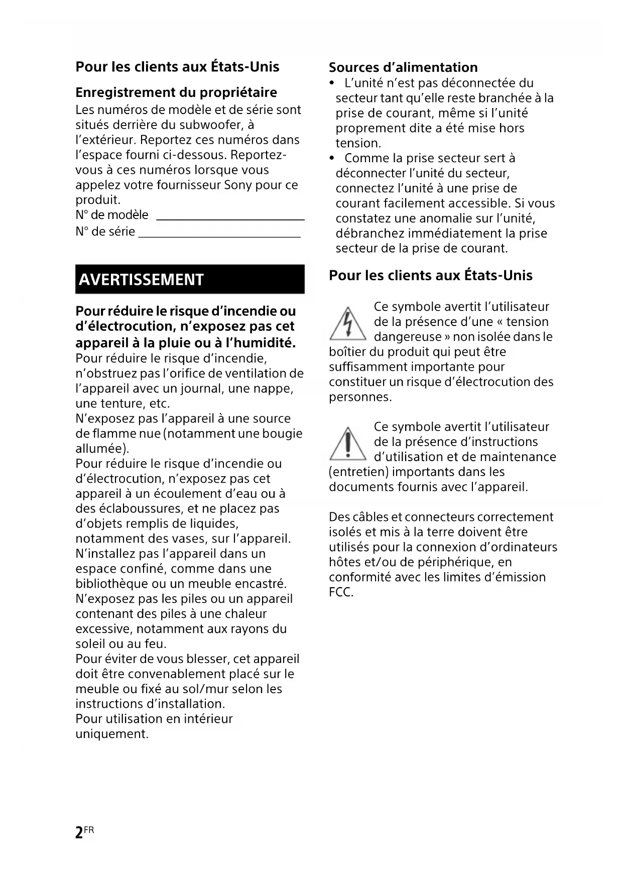 Les numéros de modèle et de série sont situés derrière du subwoofer, à l'extérieur. Reportez ces numéros dans l'espace fourni ci-dessous. Reportez-vous à ces numéros lorsque vous appelez votre fournisseur Sony pour ce produit.