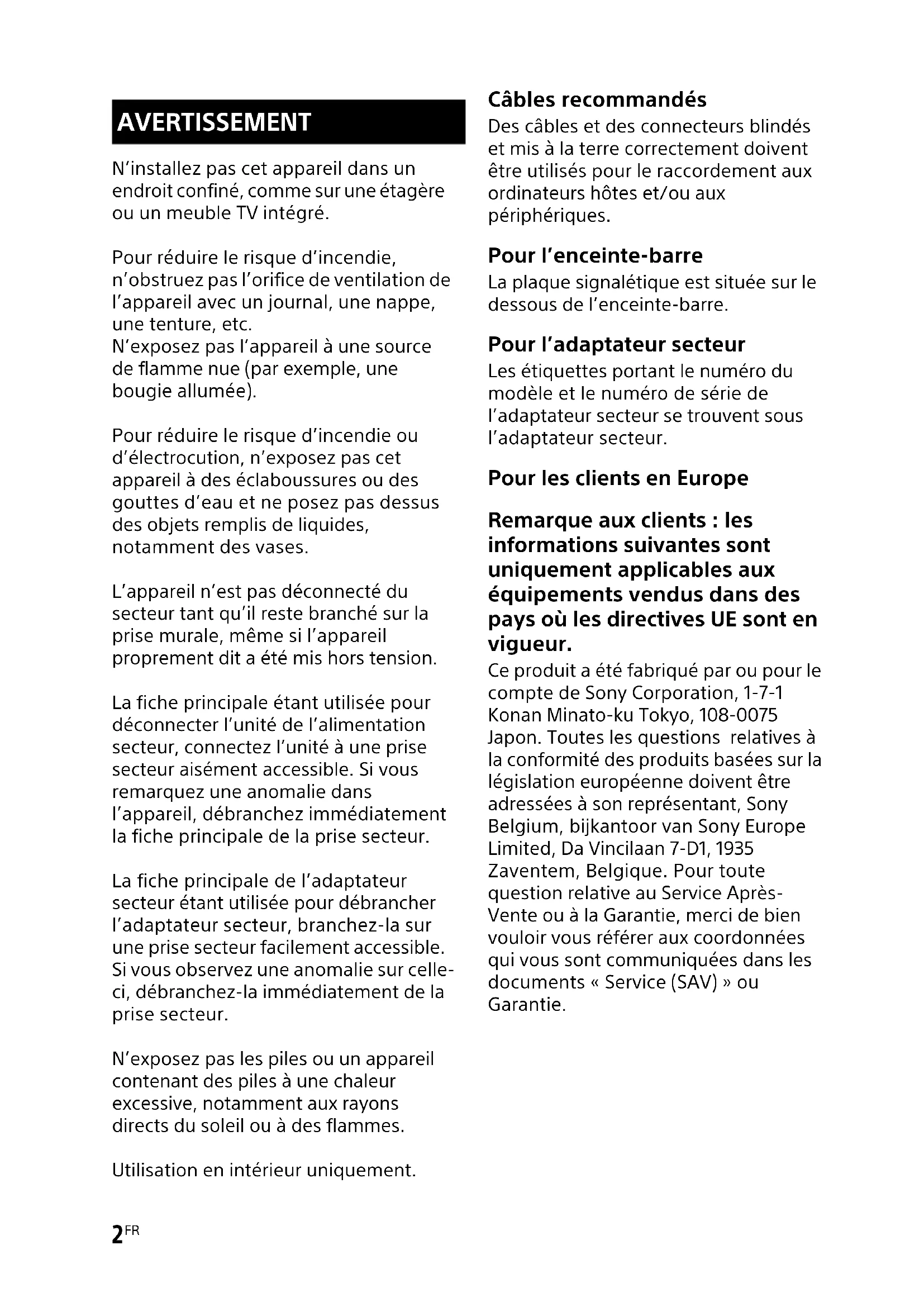 Ce produit a été fabriqué par ou pour le compte de Sony Corporation, 1-7-1 Konan Minato-ku Tokyo, 108-0075 Japon. Toutes les questions relatives à la conformité des produits basées sur la législation européenne doivent être adressées à son représentant, Sony Belgium, bijkantoor van Sony Europe Limited, Da Vincilaan 7-D1, 1935 Zaventem, Belgique. Pour toute question relative au Service Après-Vente ou à la Garantie, merci de bien vouloir vous référer aux coordonnées qui vous sont communiquées dans les documents « Service (SAV) » ou Garantie.