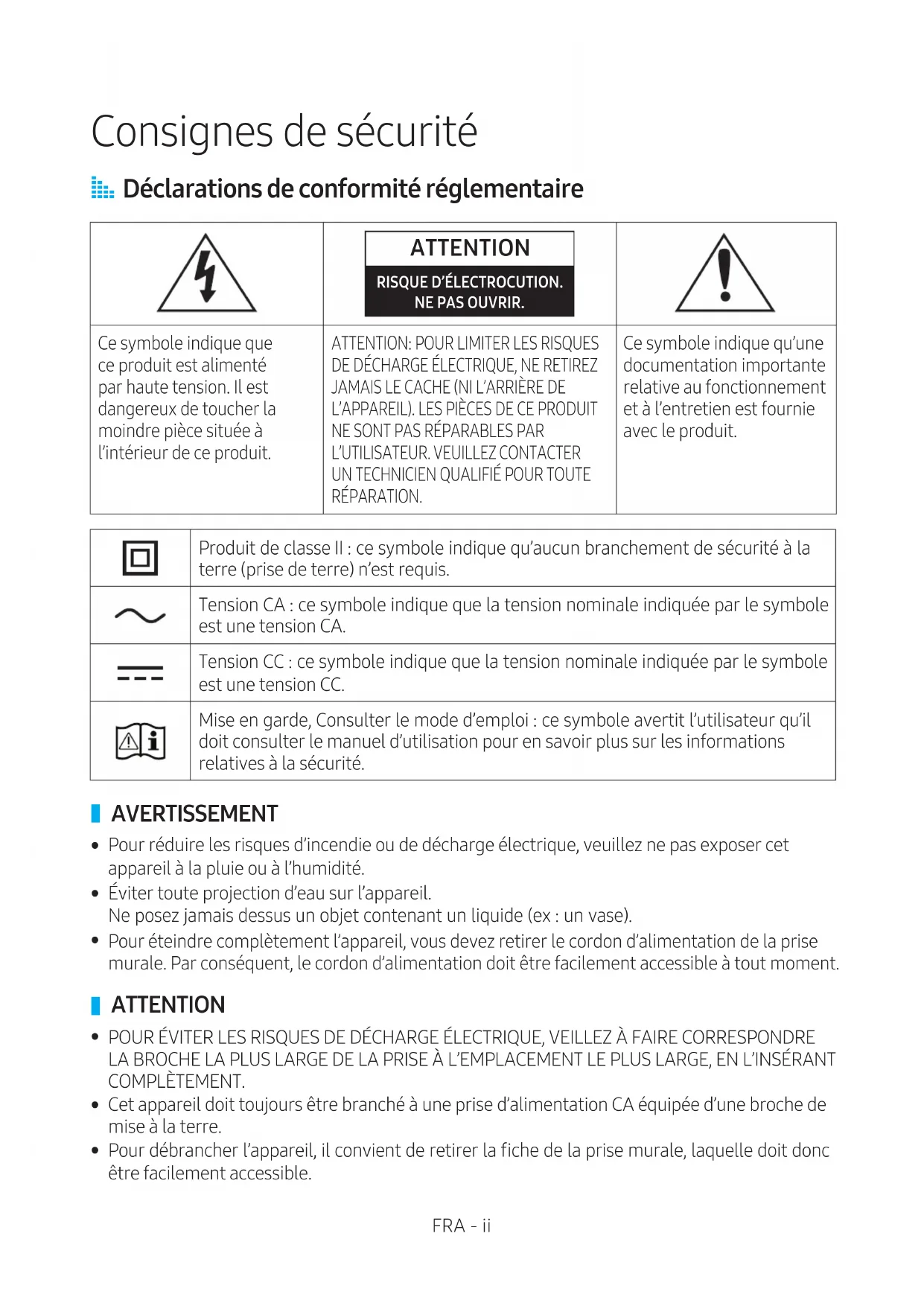 Déclarations de conformité réglementaire ATTENTION RISQUE D’ÉLECTROCUTION. NE PAS OUVRIR. Ce symbole indique que ce produit est alimenté par haute tension. Il est dangereux de toucher la moindre pièce située à l’intérieur de ce produit.