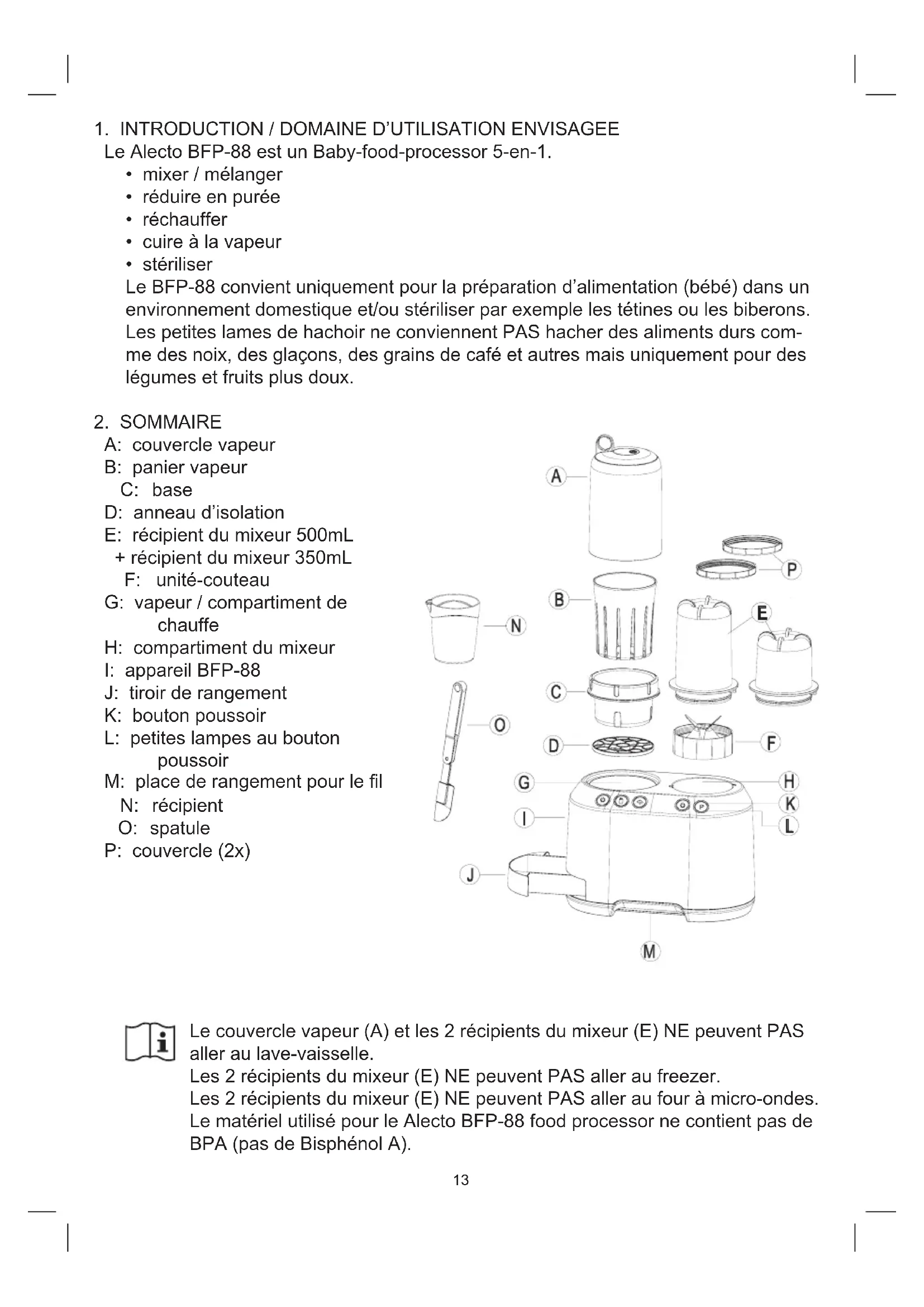 A: couvercle vapeur B: panier vapeur C: base D: anneau d’isolation E: récipient du mixeur 500mL + récipient du mixeur 350mL F: unité-couteau G: vapeur / compartiment de chauffe H: compartiment du mixeur I: appareil BFP-88 J: tiroir de rangement K: bouton poussoir L: petites lampes au bouton poussoir M: place de rangement pour le l N: récipient O: spatule P: couvercle (2x) Le couvercle vapeur (A) et les 2 récipients du mixeur (E) NE peuvent PAS aller au lave-vaisselle. Les 2 récipients du mixeur (E) NE peuvent PAS aller au freezer. Les 2 récipients du mixeur (E) NE peuvent PAS aller au four à micro-ondes. Le matériel utilisé pour le Alecto BFP-88 food processor ne contient pas de BPA (pas de Bisphénol A).14