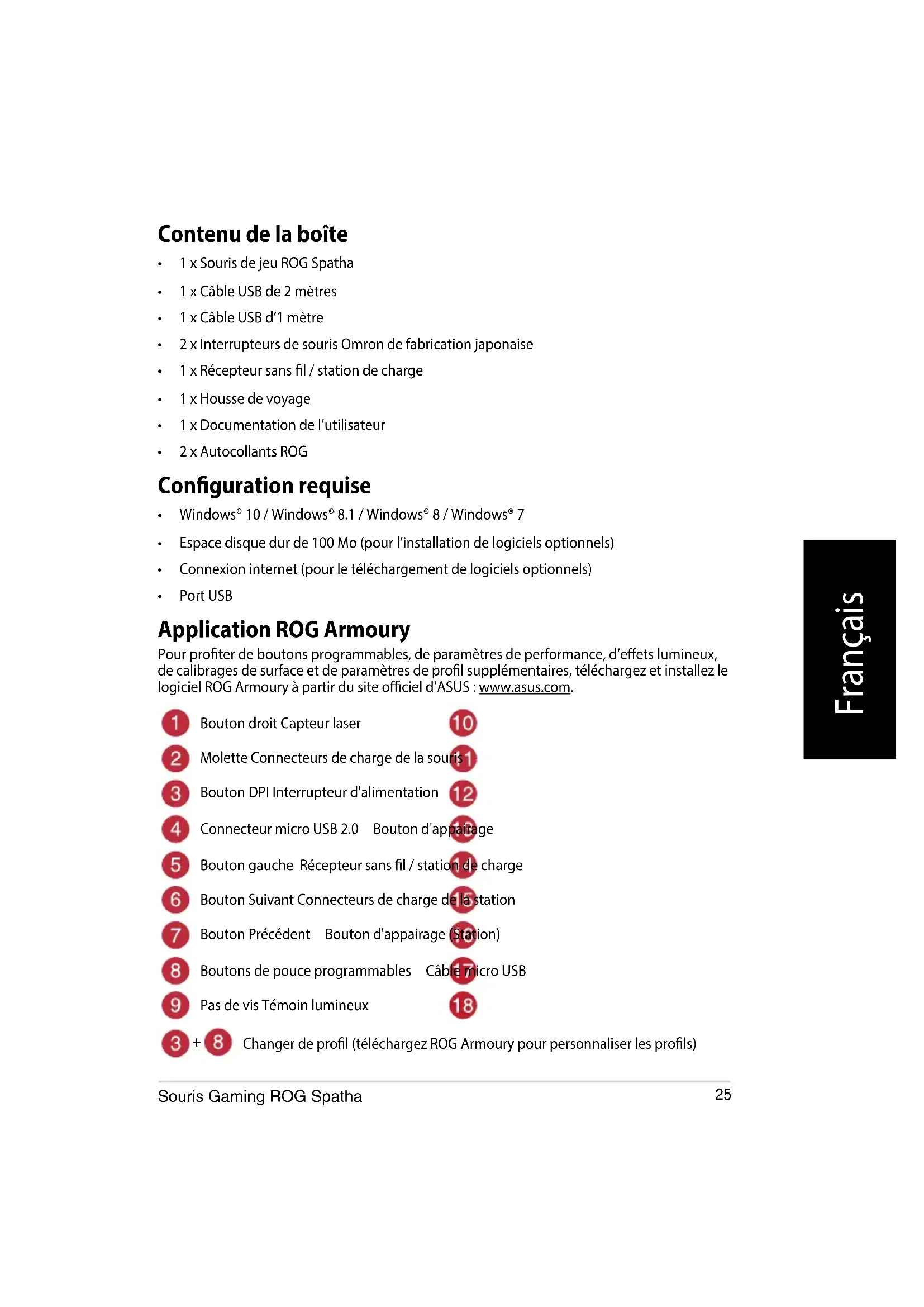 Changerdeprol(téléchargezROGArmourypourpersonnaliserlesprols)26 Français Guide de démarrage rapide Mise en route Pour congurer votre souris de jeu ROG Spatha en tant que souris laire :