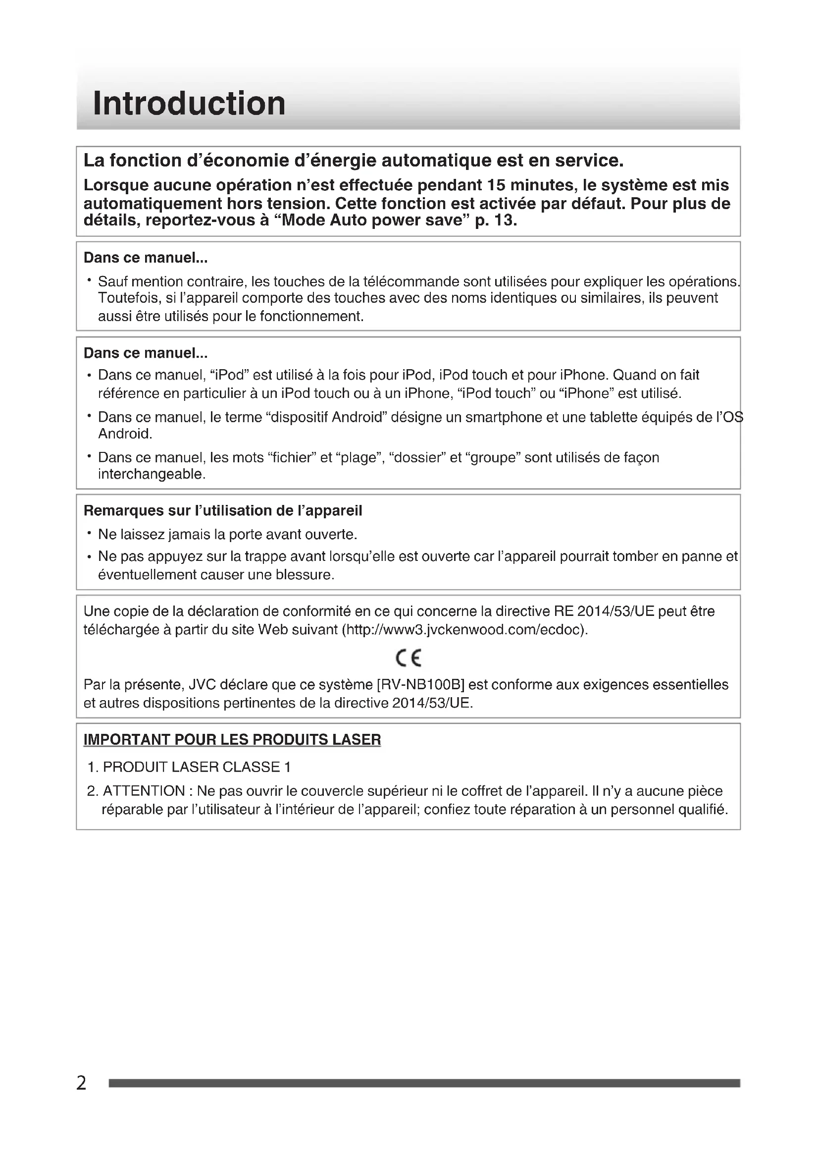 Ne pas appuyez sur la trappe avant lorsqu’elle est ouverte car l’appareil pourrait tomber en panne et éventuellement causer une blessure. Une copie de la déclaration de conformité en ce qui concerne la directive RE 2014/53/UE peut être téléchargée à partir du site Web suivant (http://www3.jvckenwood.com/ecdoc). Par la présente, JVC déclare que ce système [RV-NB100B] est conforme aux exigences essentielles et autres dispositions pertinentes de la directive 2014/53/UE.