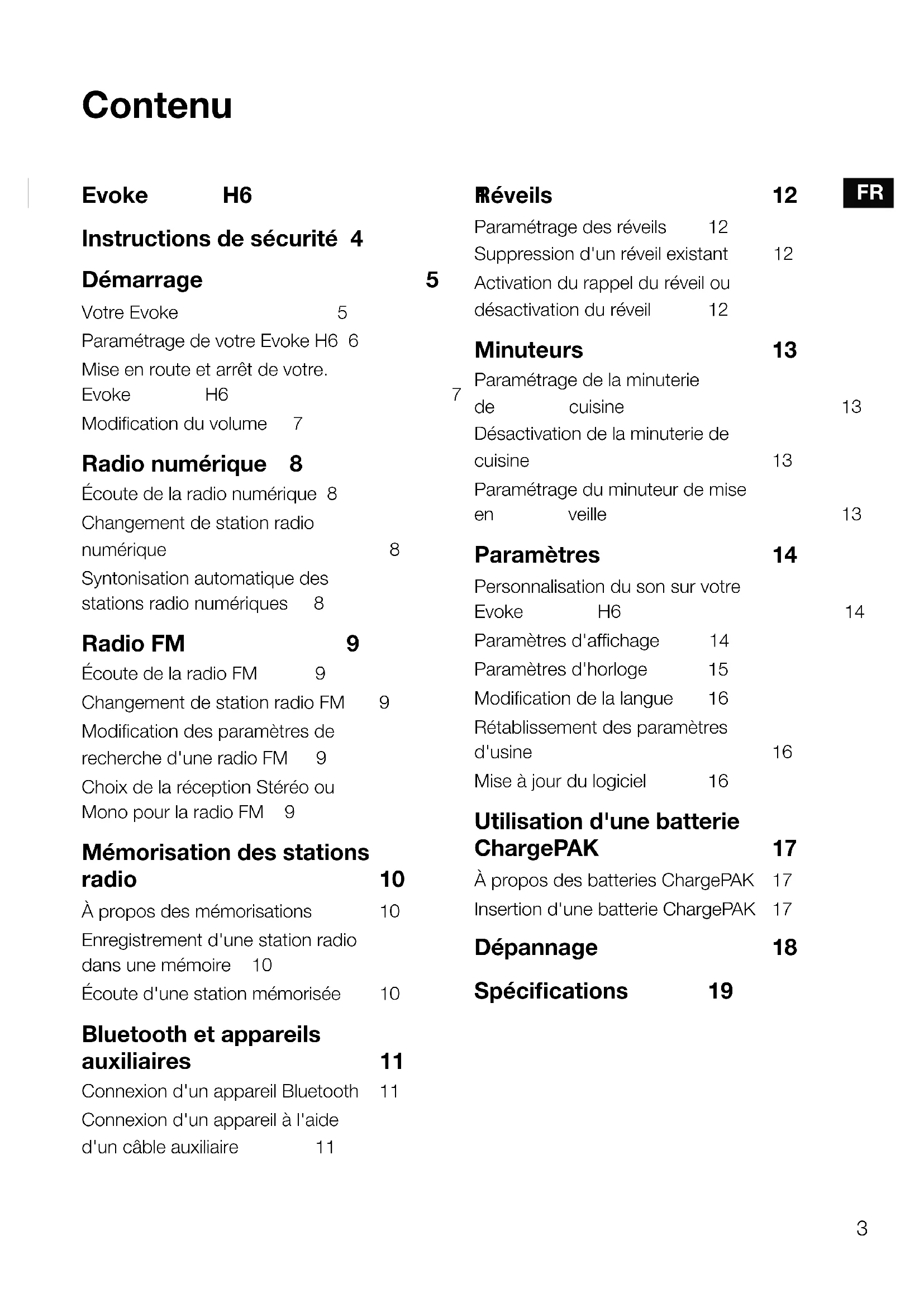 NL23 Contenu Evoke H6 1 Instructions de sécurité 4 Démarrage 5 Votre Evoke 5 Paramétrage de votre Evoke H6 6 Mise en route et arrêt de votre. Evoke H6 7 Modification du volume 7 Radio numérique 8 Écoute de la radio numérique 8 Changement de station radio numérique 8 Syntonisation automatique des stations radio numériques 8 Radio FM 9 Écoute de la radio FM 9 Changement de station radio FM 9 Modification des paramètres de recherche d'une radio FM 9 Choix de la réception Stéréo ou Mono pour la radio FM 9 Mémorisation des stations radio 10 À propos des mémorisations 10 Enregistrement d'une station radio dans une mémoire 10 Écoute d'une station mémorisée 10 Bluetooth et appareils auxiliaires 11 Connexion d'un appareil Bluetooth 11 Connexion d'un appareil à l'aide d'un câble auxiliaire 11 Réveils 12 Paramétrage des réveils 12 Suppression d'un réveil existant 12 Activation du rappel du réveil ou désactivation du réveil 12 Minuteurs 13 Paramétrage de la minuterie de cuisine 13 Désactivation de la minuterie de cuisine 13 Paramétrage du minuteur de mise en veille 13 Paramètres 14 Personnalisation du son sur votre Evoke H6 14 Paramètres d'affichage 14 Paramètres d'horloge 15 Modification de la langue 16 Rétablissement des paramètres d'usine 16 Mise à jour du logiciel 16 Utilisation d'une batterie ChargePAK 17 À propos des batteries ChargePAK 17 Insertion d'une batterie ChargePAK 17 Dépannage 18 Spécifications